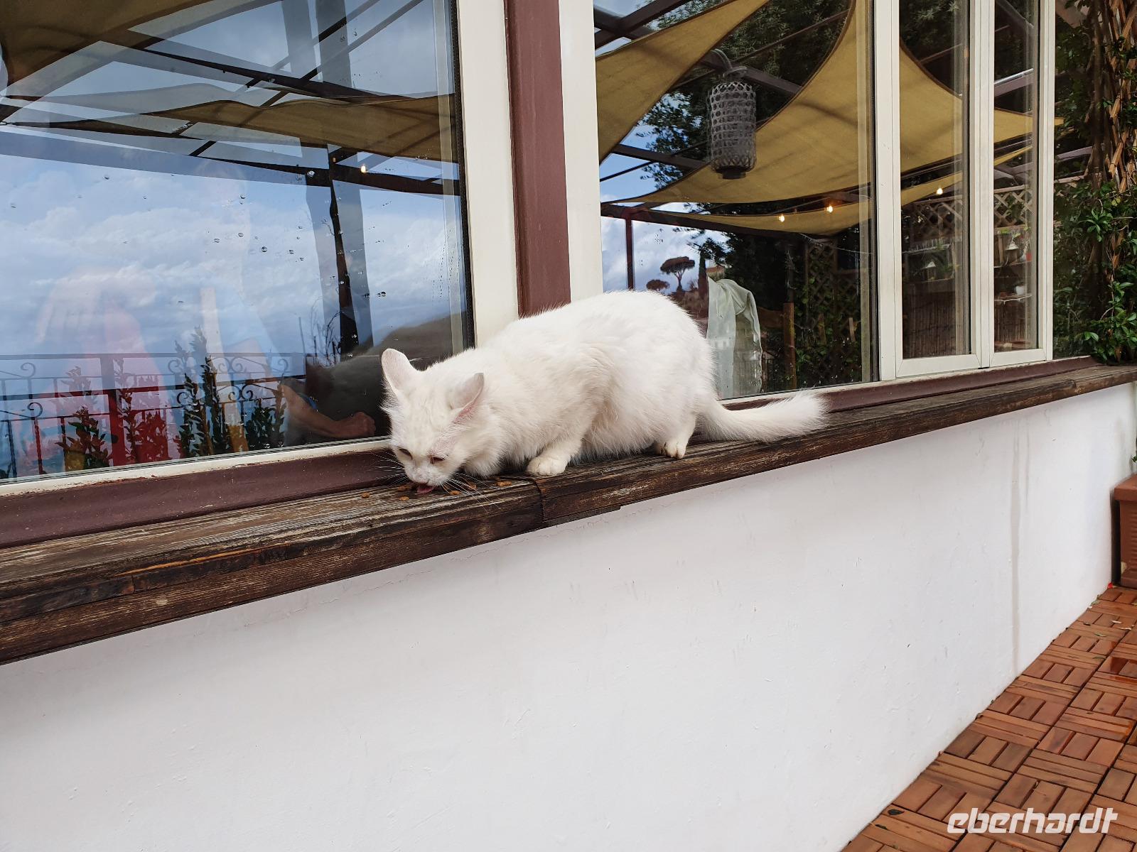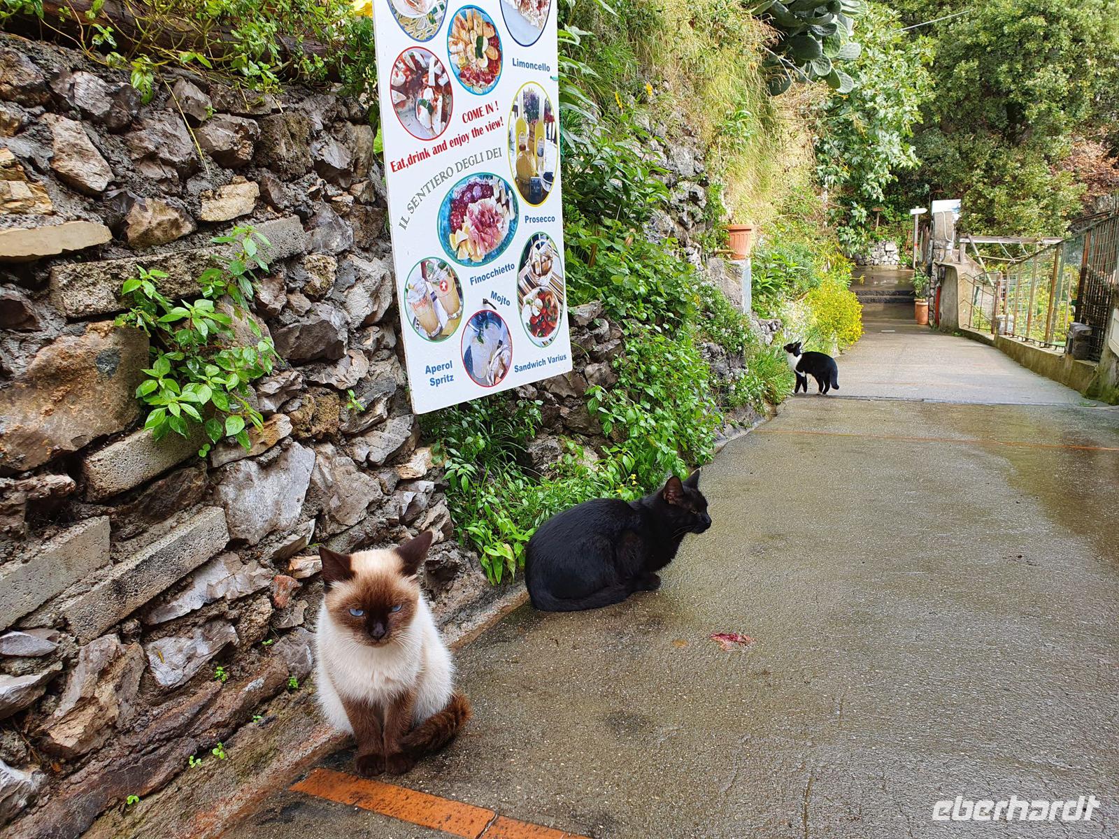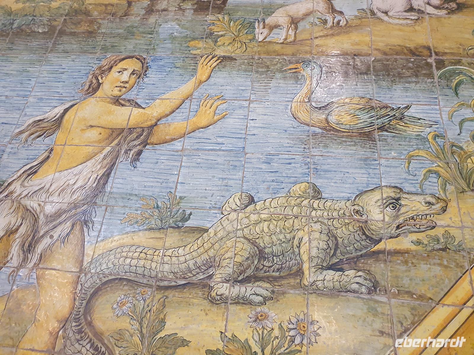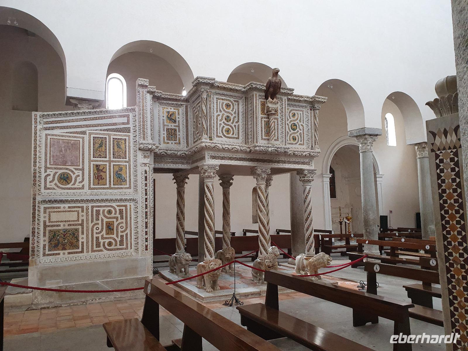 Nach der Besichtigung gehen wir zurück, an der Villa Rufolo vorbei zum Dom. Der Bau des Domes geht auf das 12.Jahrhundert zurück und noch heute kann die bronzene Eingangstür aus dem Jahr 1172 bewundert werden. Innen gibt es venezianische Fenster und eine Marmorkanzel, die von 4 Löwen getragen wird, zu bestaunen. Inzwischen scheint wieder die Sonne. Auf unserem Weg durch die Stadt treffen wir auf viele Katzen. Die meisten sind herrenlos und warten bei den Restaurants auf etwas Fressbares. Eine Katze aber kommt aus einem 4-Sterne Hotel mit elegantem Halsband und ist dort offenbar als Mäusefängerin "angestellt". Vorbei an einem Brunnen aus dem Mittelalter verlassen wir Ravello durch enge Gassen und über viele Stufen. Der weitere Weg verläuft auf einer wenig befahrenen Strasse und dann weiter auf einem aussichtsreichen alten Maultierpfad in Richtung Kloster St.Nicola.