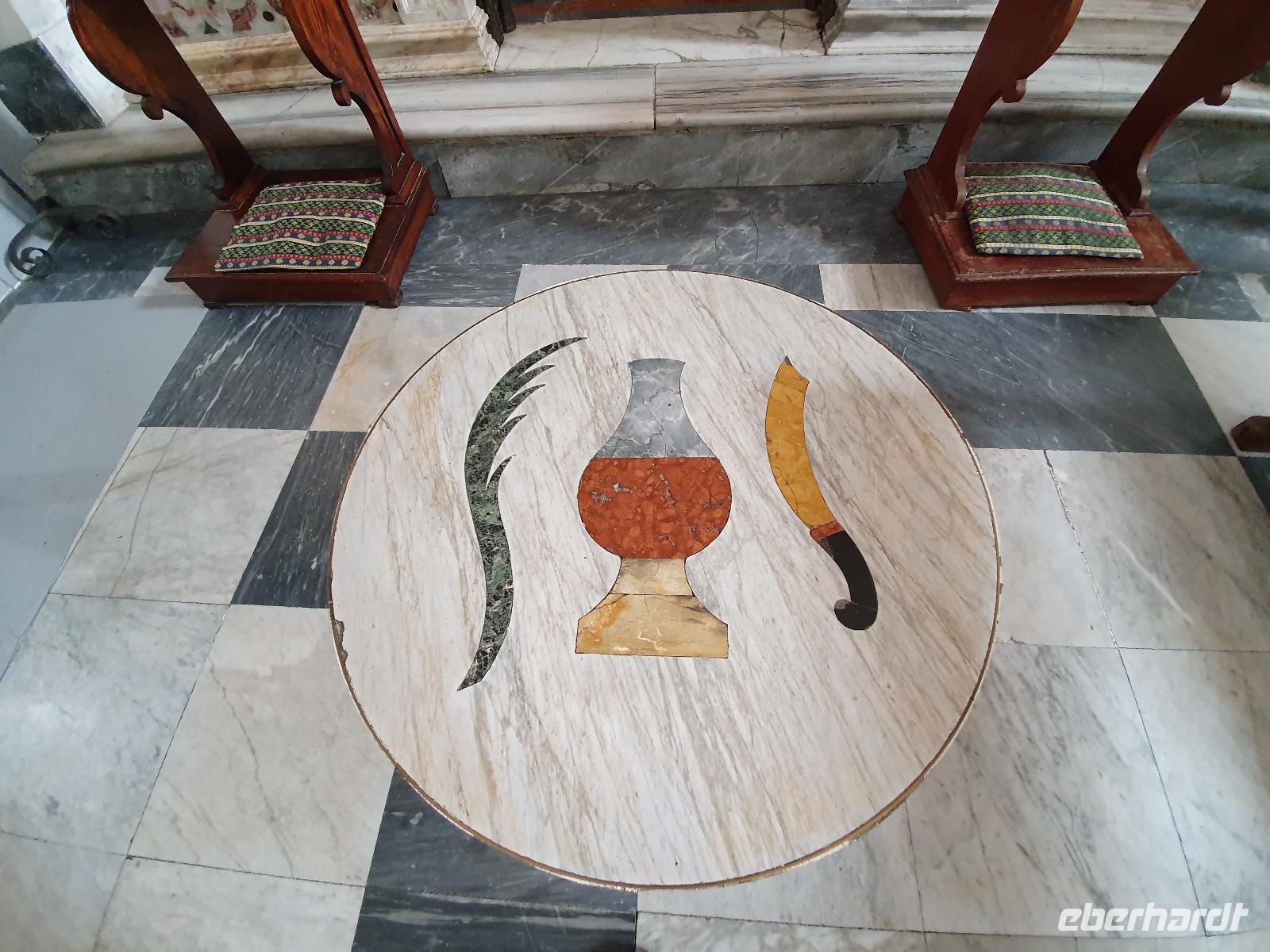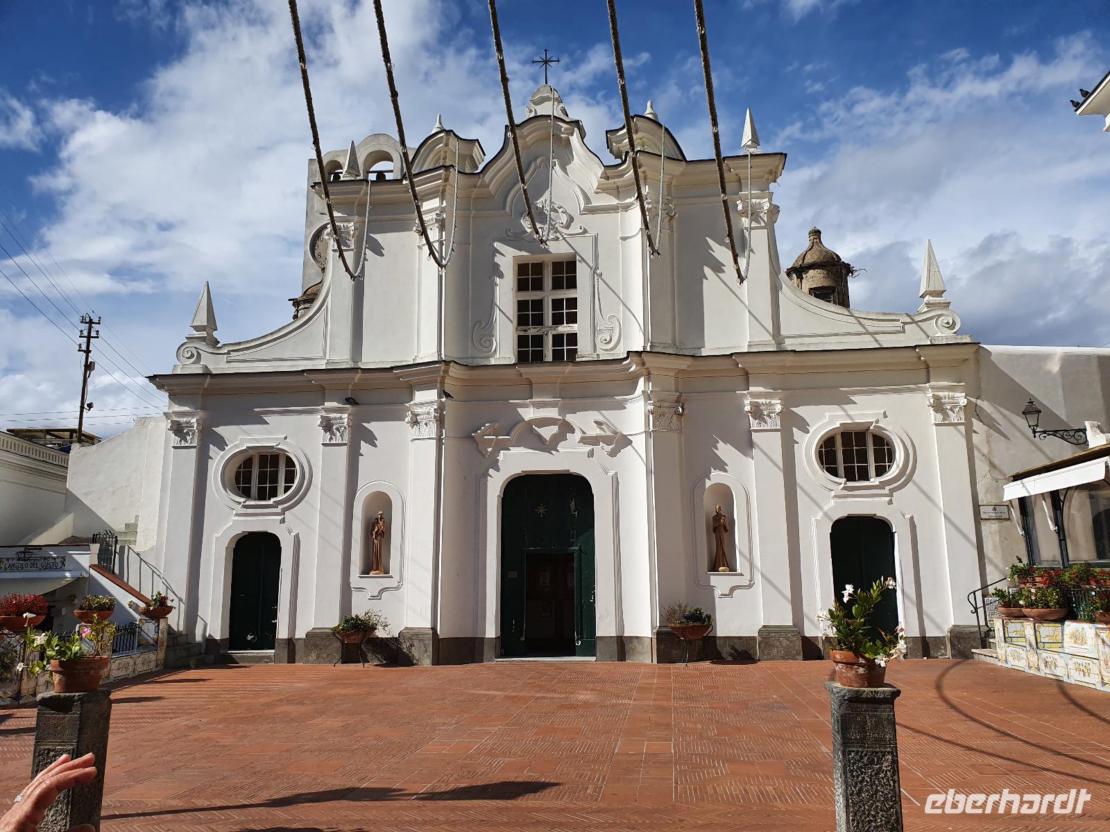 Wir schlendern durch die Strassen in der Fussgängerzone und besuchen spontan die Kirche S.Michele mit ihrem einzigartigen Fussbodenmosaik zum Thema Vertreibung aus dem Paradies. Auf dem Kirchenvorplatz empfängt uns nach der Besichtigung Annamaria mit einer echten und frisch gebackenen Capresetorte. Alle probieren sie und sind begeistert vom Geschmack. Weiter laufen wir zur Kirche Santa Sofia und durch enge Gassen, wo wir auch mal in die Hauseingänge schauen können, zurück zum Busplatz. Wieder mit einem Privatbus fahren wir hinunter nach Capri und gelangen über die Via Roma ins Zentrum zur Piazetta.