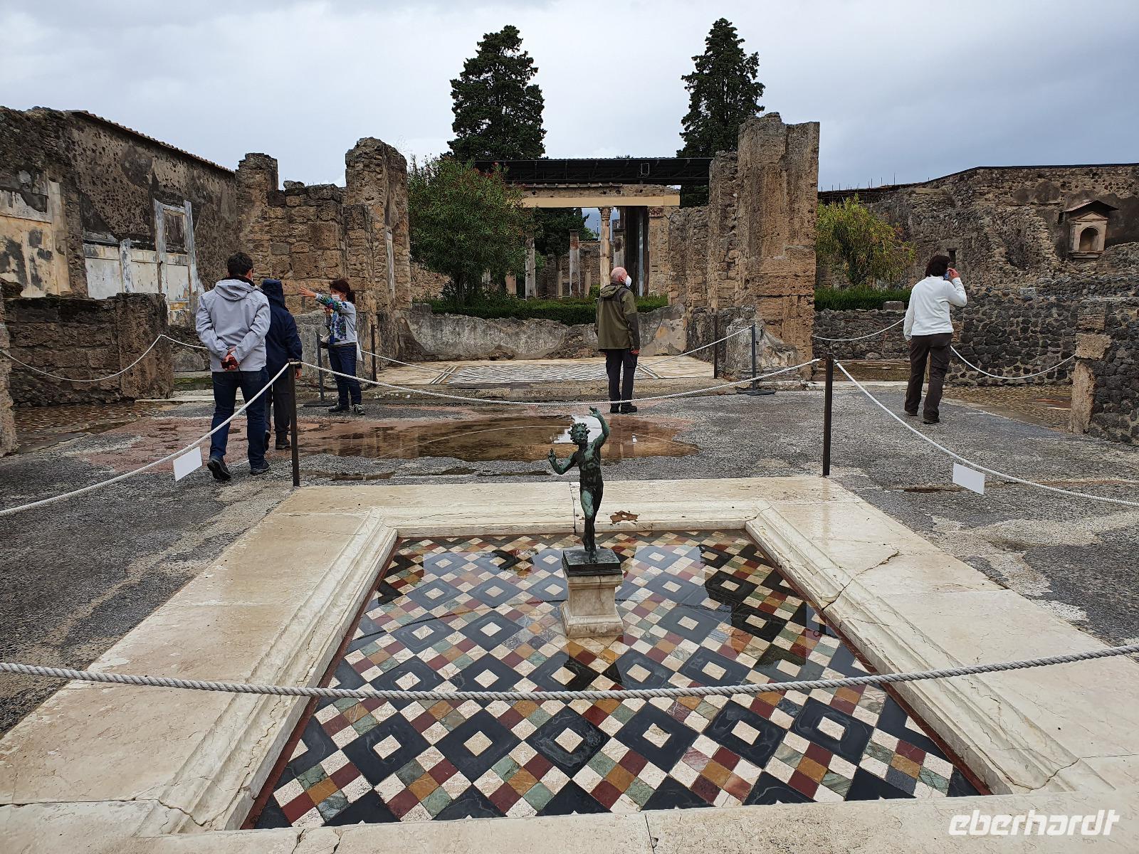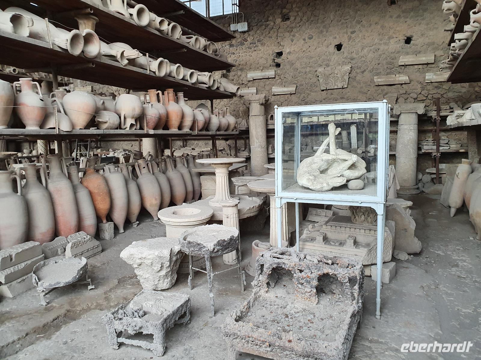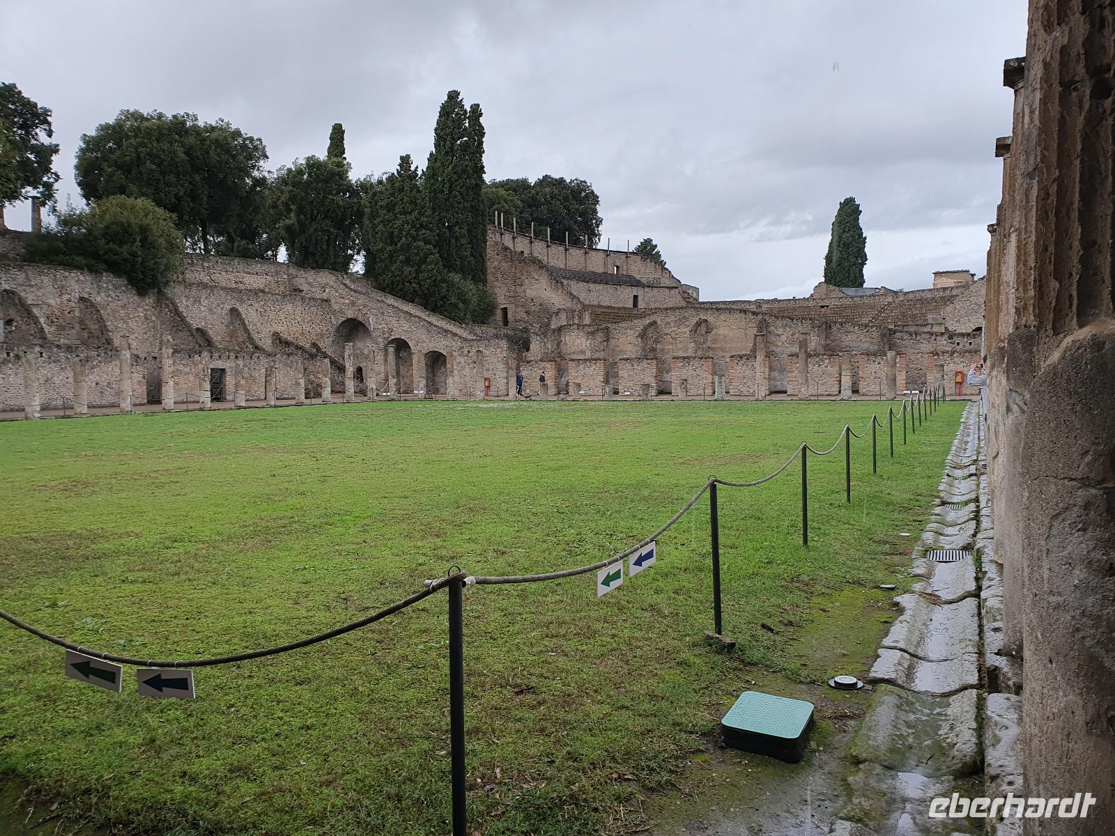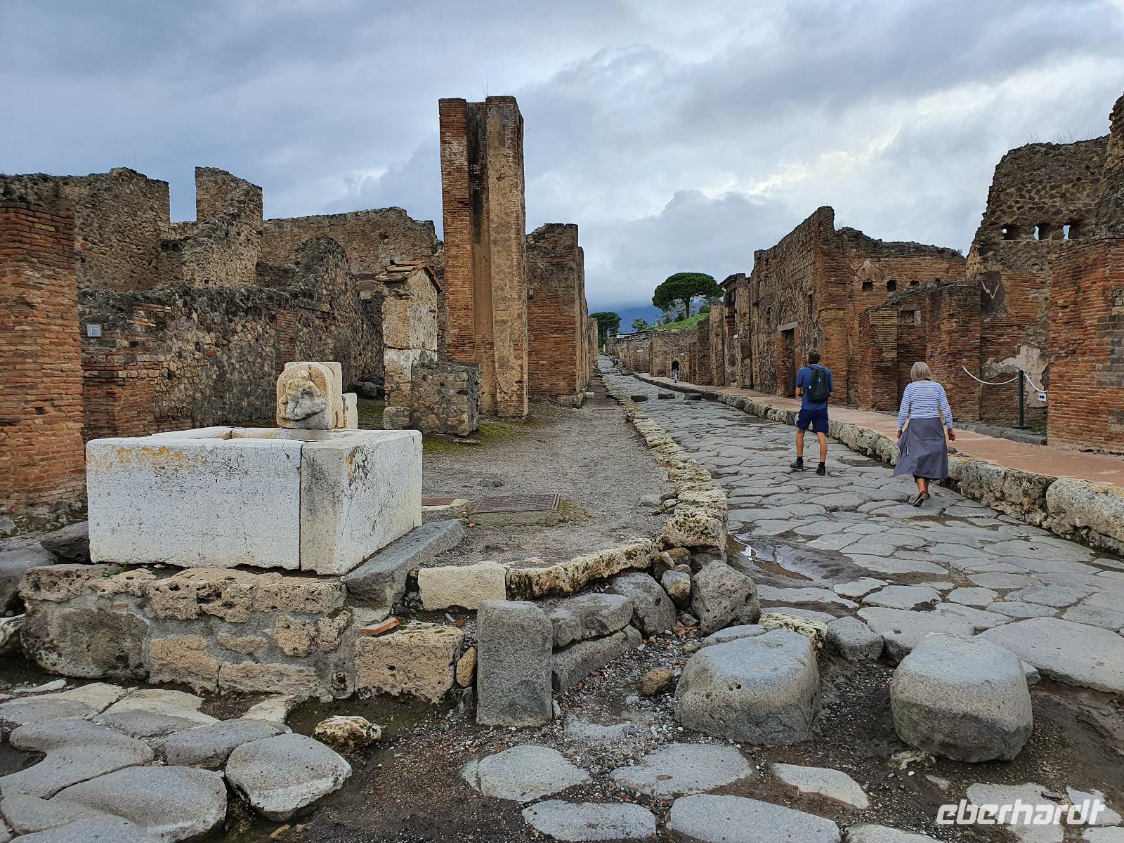 Annamaria erwartet uns schon, die Audiogerät werden verteilt und eine Hörprobe gemacht. Dann gehen wir zum Eingang Piazza Anfiteatro, durch die Sicherheitskontrolle und nun kann die Besichtigung beginnen. Wir starten mit der Besichtigung des Palestra Grande, wo viele wichtige Exponate ausgestellt sind und uns Annamaria einen guten Überblick geben kann. Weiter geht es ins Anfiteatro und dann über die Via dell Abbondanza vorbei an vielen gut erhaltenen Wohnhäusern. Leider können die Häuser nicht innen besichtigt werden und so erhaschen wir nur Blicke von aussen. An der Stasse sind die vielen Ausschankstellen sehenswert und die Casa e Thermopolium di Vetutius Placidus zeigt uns eine Ausschankstelle für warme Speisen. Wir besuchen die zentralen Thermen, die Casa del Fauno, den Forumsplatz mit den Magazingebäuden, wo heute Amphoren und Gipsabdrücke von Verstorbenen ausgestellt sind. Der berühmte Blick zum Vesuv bleibt uns verwehrt, weil schon wieder Wolken aufgezogen sind und Regen einsetzt. Wir gehen Richtung Ausgang Torre 1 und besuchen zuvor noch das Teatro Grande und den Quadriportico dei Teatri. 2,5 Stunden sind für Pompej natürlich zu wenig. Man braucht mehrere Tage, um alles zu sehen. Es lohnt also wieder zu kommen. Auf der Rückfahrt erfahren wir, dass für den kommenden Tag Unwetter angesagt sind und sogar die Schulen geschlossen werden. Also nix mit unserem Ausflug nach Capri. Wir brauchen ein Ersatzprogramm. Im Hotel beraten Annamaria und ich eine Alternative und die teile ich zum Abendessen den Gästen mit.