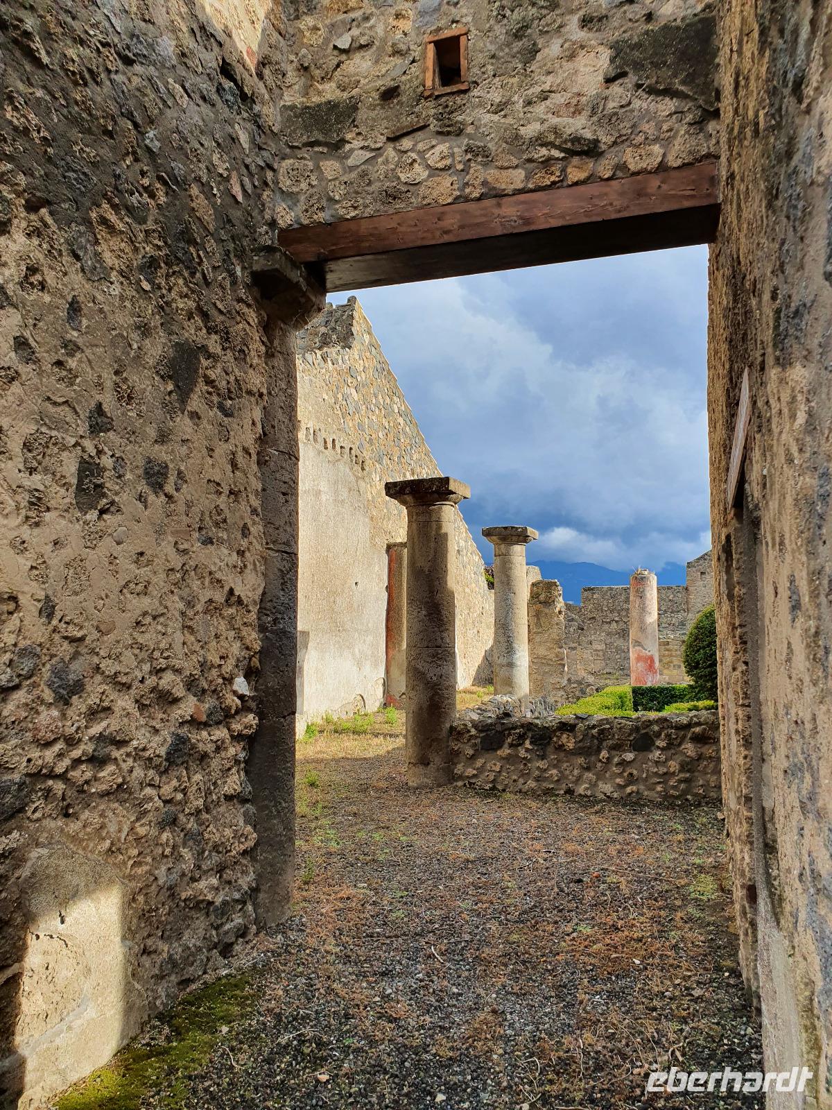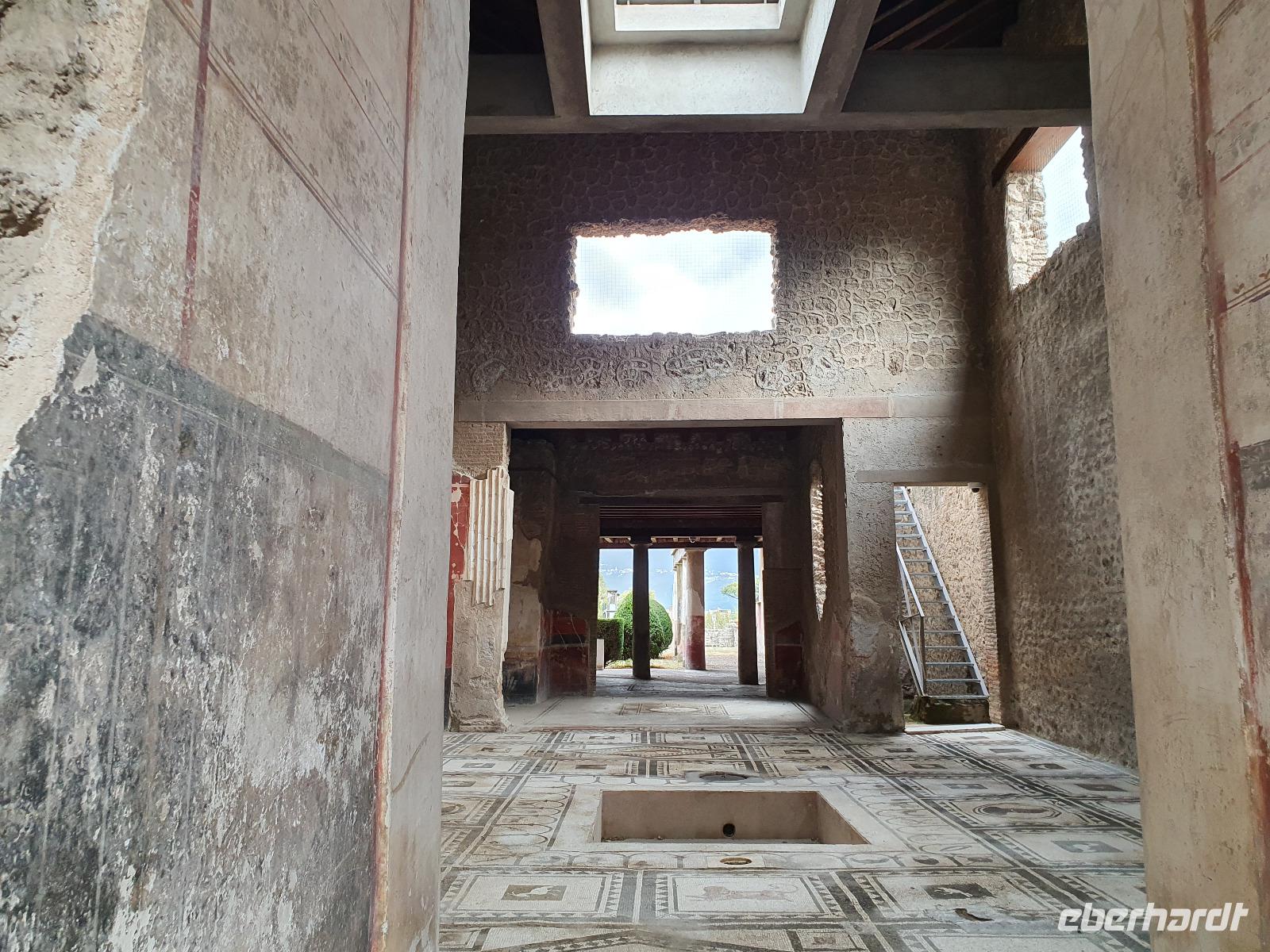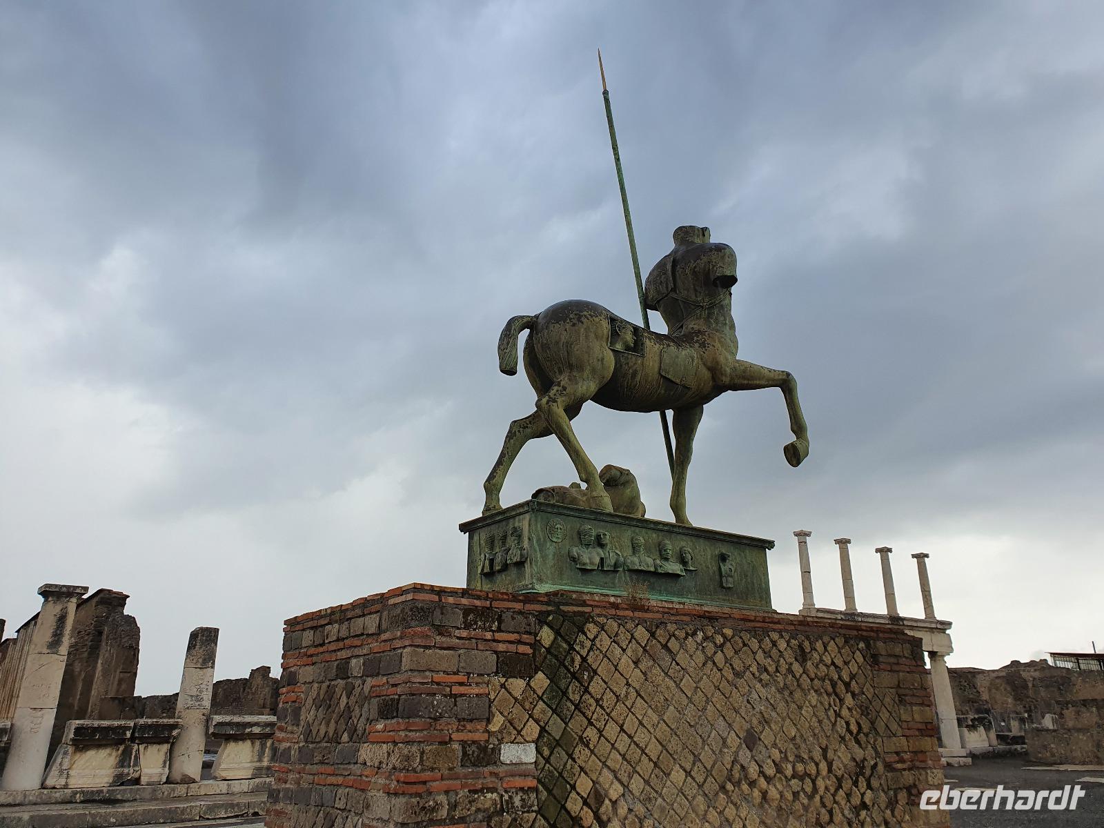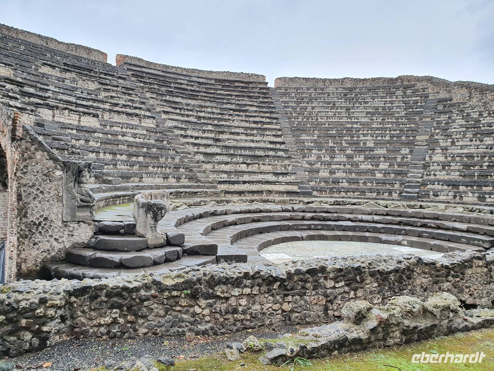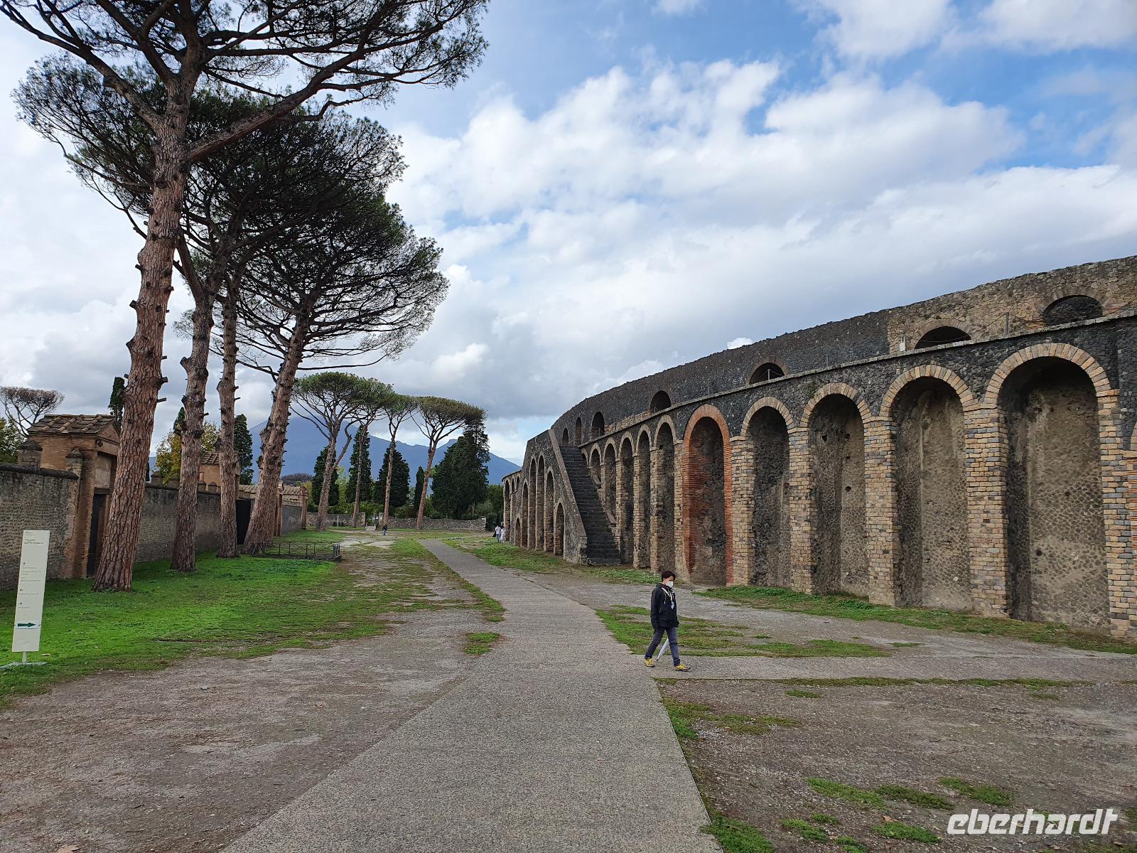 Annamaria erwartet uns schon, die Audiogerät werden verteilt und eine Hörprobe gemacht. Dann gehen wir zum Eingang Piazza Anfiteatro, durch die Sicherheitskontrolle und nun kann die Besichtigung beginnen. Wir starten mit der Besichtigung des Palestra Grande, wo viele wichtige Exponate ausgestellt sind und uns Annamaria einen guten Überblick geben kann. Weiter geht es ins Anfiteatro und dann über die Via dell Abbondanza vorbei an vielen gut erhaltenen Wohnhäusern. Leider können die Häuser nicht innen besichtigt werden und so erhaschen wir nur Blicke von aussen. An der Stasse sind die vielen Ausschankstellen sehenswert und die Casa e Thermopolium di Vetutius Placidus zeigt uns eine Ausschankstelle für warme Speisen. Wir besuchen die zentralen Thermen, die Casa del Fauno, den Forumsplatz mit den Magazingebäuden, wo heute Amphoren und Gipsabdrücke von Verstorbenen ausgestellt sind. Der berühmte Blick zum Vesuv bleibt uns verwehrt, weil schon wieder Wolken aufgezogen sind und Regen einsetzt. Wir gehen Richtung Ausgang Torre 1 und besuchen zuvor noch das Teatro Grande und den Quadriportico dei Teatri. 2,5 Stunden sind für Pompej natürlich zu wenig. Man braucht mehrere Tage, um alles zu sehen. Es lohnt also wieder zu kommen. Auf der Rückfahrt erfahren wir, dass für den kommenden Tag Unwetter angesagt sind und sogar die Schulen geschlossen werden. Also nix mit unserem Ausflug nach Capri. Wir brauchen ein Ersatzprogramm. Im Hotel beraten Annamaria und ich eine Alternative und die teile ich zum Abendessen den Gästen mit.