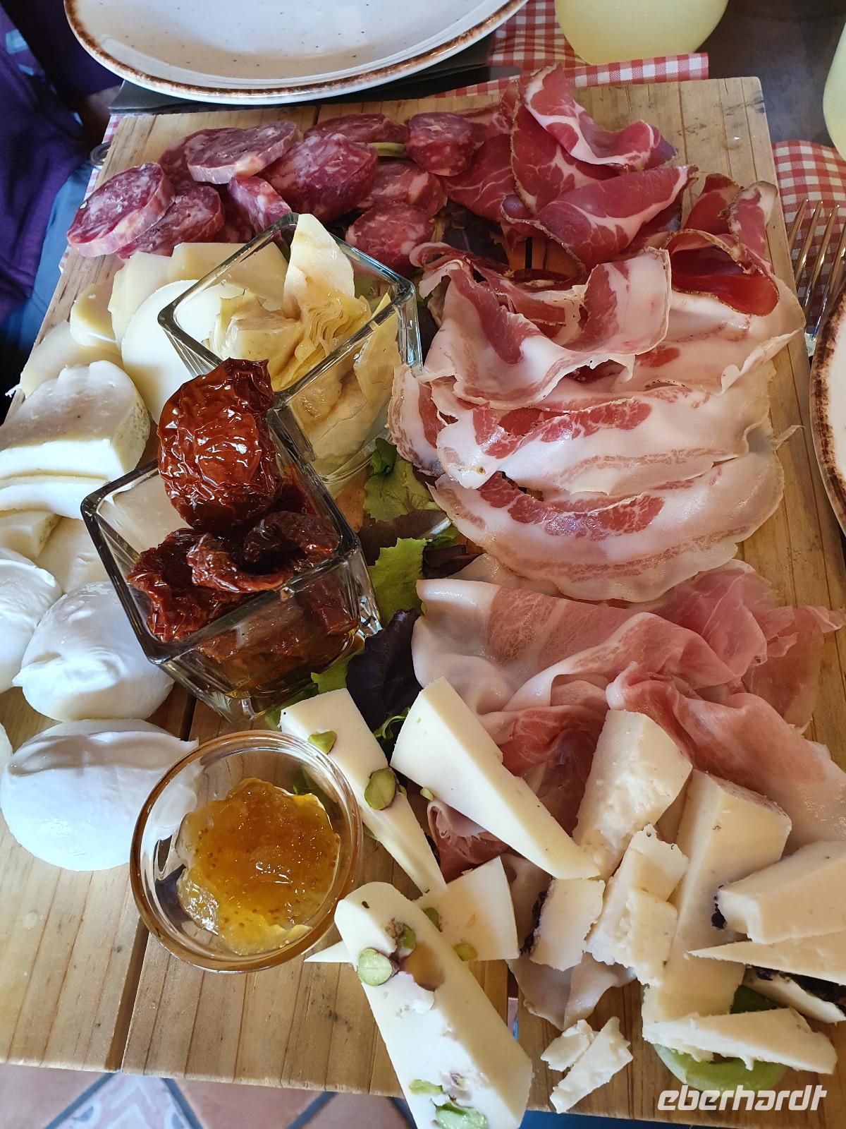 Dorthin wären wir bei gutem Wetter gewandert. Das Lokal für das Mittagessen wollten wir uns aber nicht entgehen lassen und das lohnte sich so richtig ! Von der Hauptstrasse mussten wir viele Stufen hinab steigen eben zum kleinen Wässerchen und dort erwartete uns eine Überraschung. 3 junge Leute haben die Initiative ergriffen und ein Lokal mit toller Aussicht und sehr gutem, hochwertigen Essen eröffnet. Wir bekamen verschiedenes frisch gebackenes Brot, frisch gepressten Zitronensaft und ein Holzbrett mit feinsten verschiedenen Wurst- und Schinkenarten, Büffelmozzarella, gefüllten Käsesorten, Feigenmarmelade, eingelegten Artischocken und getrockneten Tomaten. Beim Schreiben läuft mir heute noch das Wasser im Mund zusammen. Gut gestärkt trennte sich dann unsere Gruppe nach dem Mittagessen. 5 stiegen die vielen Treppen nach Amalfi hinunter und fuhren dann von dort mit dem Linienbus zurück. Alle anderen nahmen unseren Bus zurück nach Minori.