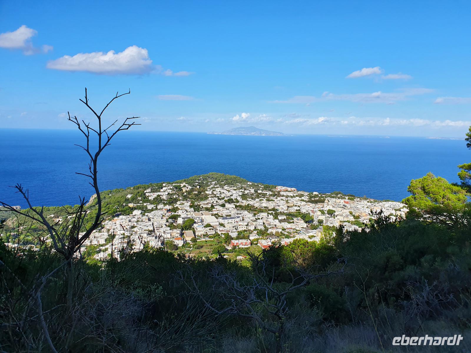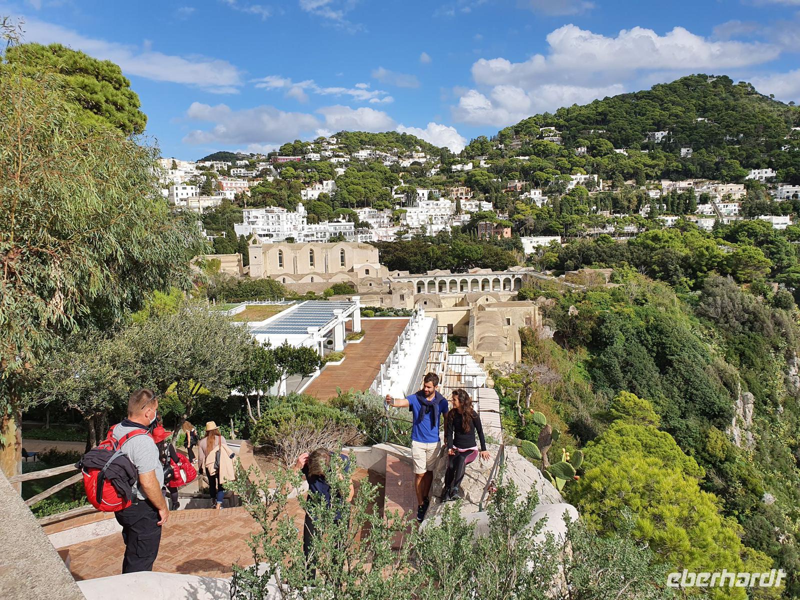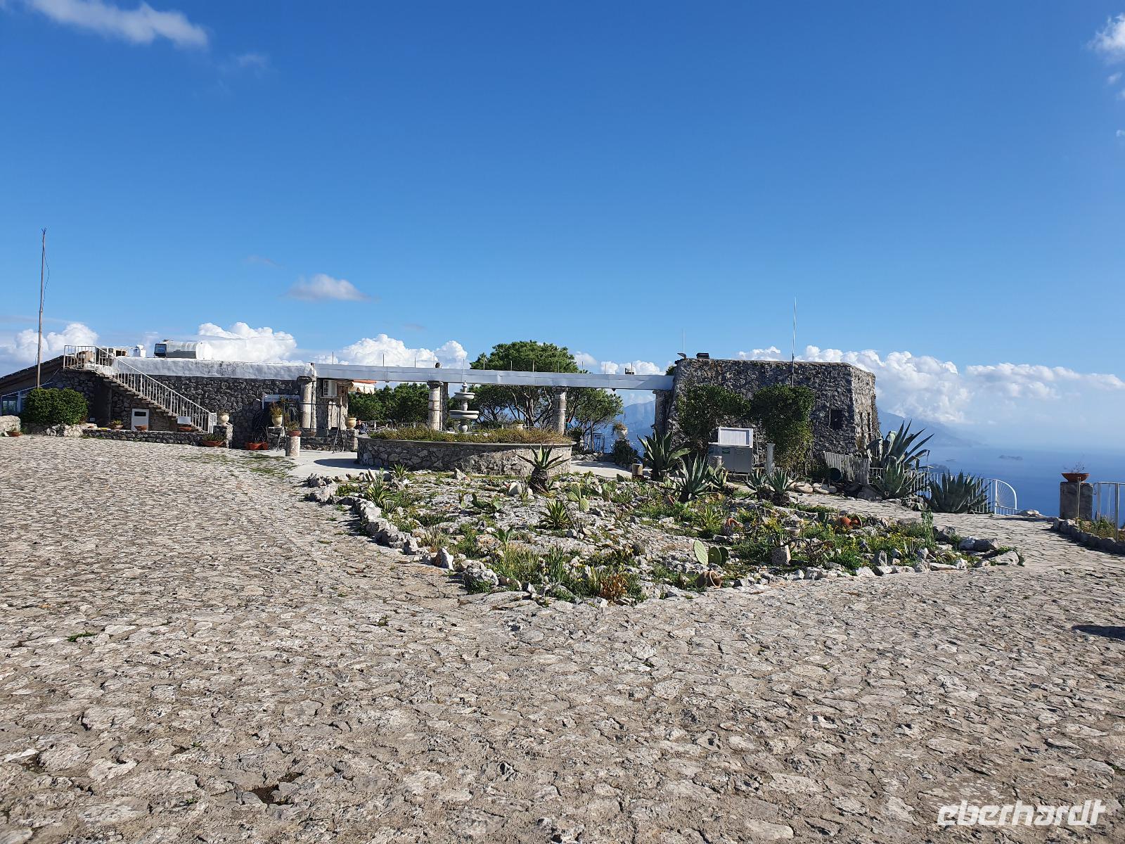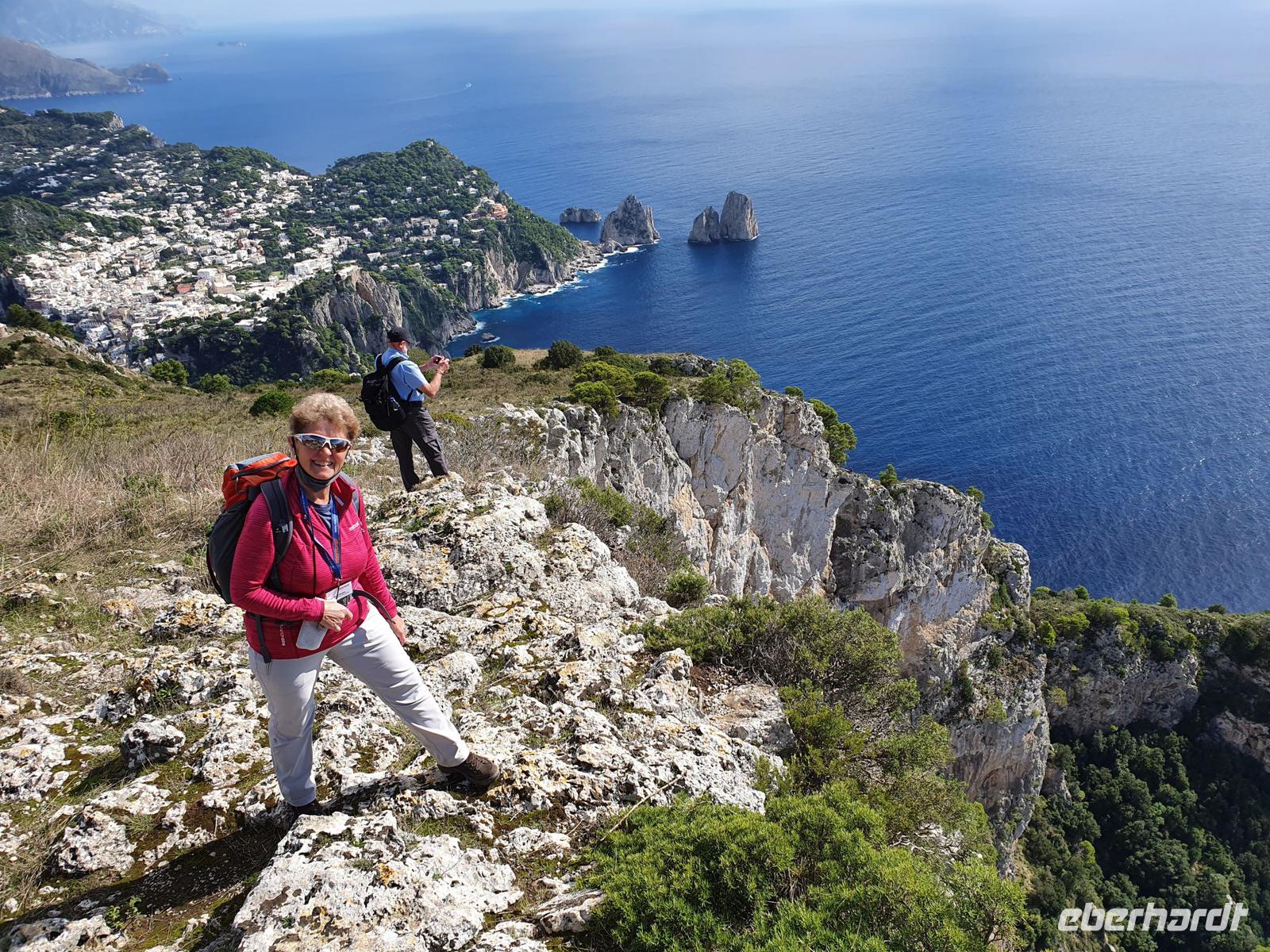 Der Weg auf den Monte Solaro verläuft auf einem alten Maultierpfad mit immer wieder schönen Aussichten auf Anacapri und die Inseln. Gleichzeitig ist er Kreuzweg zur Einsiedelei Santa Maria a Cetrella. Nach dem Pass geht es steil bergan auf schmalen Wegen mit Treppen. Oben angekommen ist das Gipfelplateau menschenleer, nur unsere 5 vom Sessellift geniessen schon den Kaffee. Wir spazieren rundherum, machen Fotos und geniessen diese traumhafte Aussicht. Dann steigen wir ein Stück ab und mit Blick auf Capri, die Faraglioni, die sorrentinische Halbinsel bis hin zur Amalfiküste verspeisen wir unsere Panini und sind einfach nur glücklich. Für den Abstieg schlägt Annamaria den steilen Weg an der Felskante vor, immer mit der eben beschriebenen Aussicht vor Augen. Nach Passieren der Einsiedelei erreichen wir wieden den Maultierpfad und werden von einer Ziegenherde begrüßt. Die Tiere sind sehr zutraulich, lassen sich füttern und streicheln und verfolgen uns schliesslich bis ins Tal. Wieder unten an der Seilbahn ist unsere Gruppe vollständig und gemeinsam erkunden wir Anancapri.