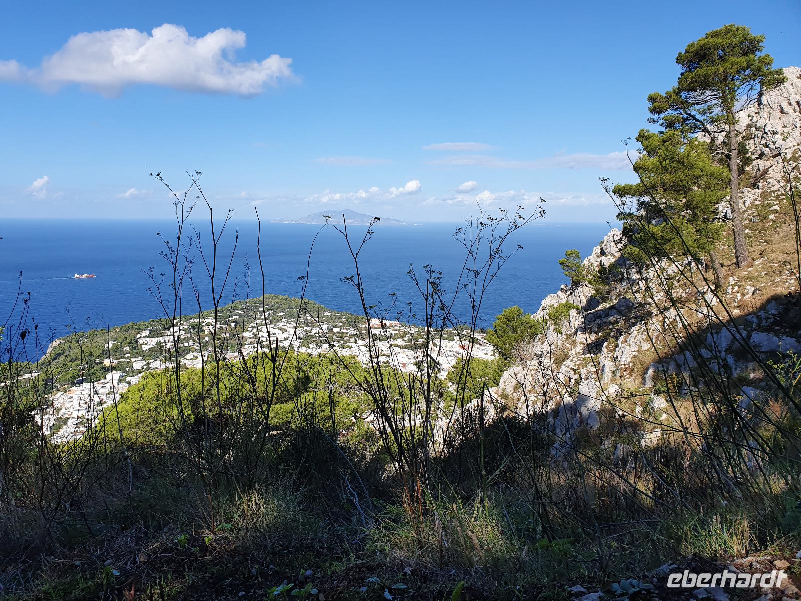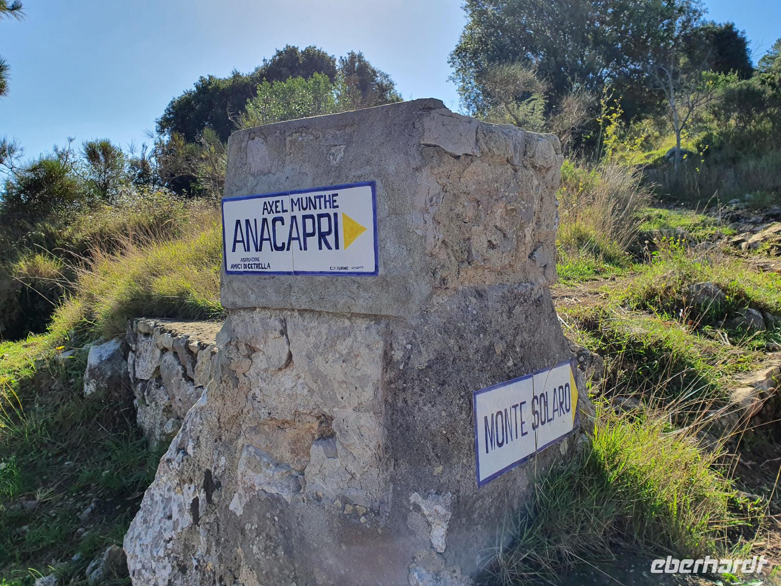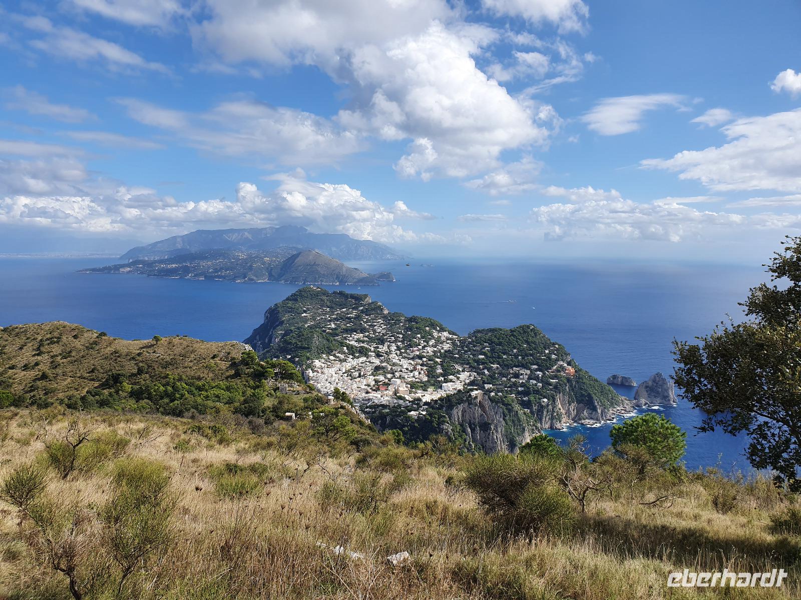 Der Weg auf den Monte Solaro verläuft auf einem alten Maultierpfad mit immer wieder schönen Aussichten auf Anacapri und die Inseln. Gleichzeitig ist er Kreuzweg zur Einsiedelei Santa Maria a Cetrella. Nach dem Pass geht es steil bergan auf schmalen Wegen mit Treppen. Oben angekommen ist das Gipfelplateau menschenleer, nur unsere 5 vom Sessellift geniessen schon den Kaffee. Wir spazieren rundherum, machen Fotos und geniessen diese traumhafte Aussicht. Dann steigen wir ein Stück ab und mit Blick auf Capri, die Faraglioni, die sorrentinische Halbinsel bis hin zur Amalfiküste verspeisen wir unsere Panini und sind einfach nur glücklich. Für den Abstieg schlägt Annamaria den steilen Weg an der Felskante vor, immer mit der eben beschriebenen Aussicht vor Augen. Nach Passieren der Einsiedelei erreichen wir wieden den Maultierpfad und werden von einer Ziegenherde begrüßt. Die Tiere sind sehr zutraulich, lassen sich füttern und streicheln und verfolgen uns schliesslich bis ins Tal. Wieder unten an der Seilbahn ist unsere Gruppe vollständig und gemeinsam erkunden wir Anancapri.