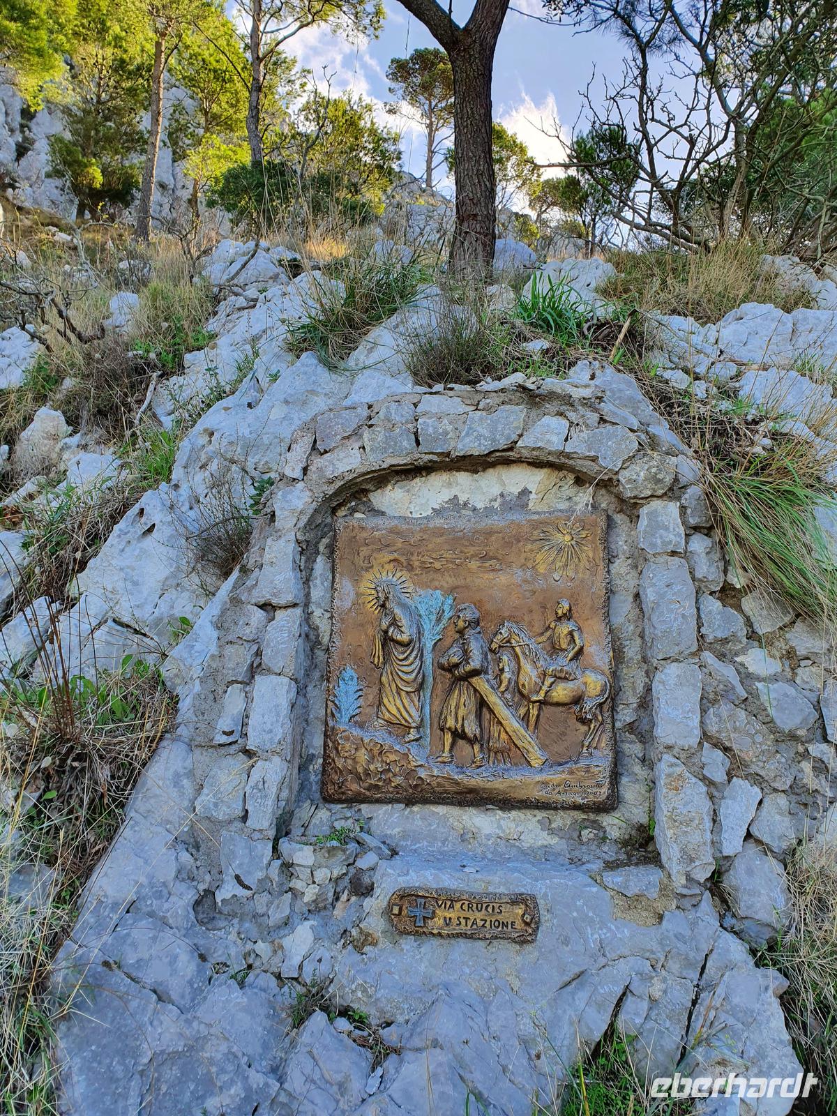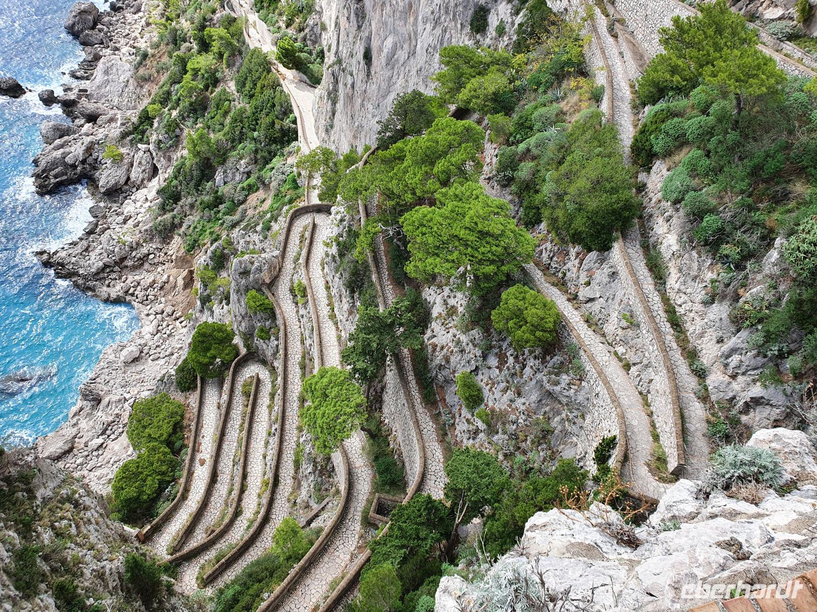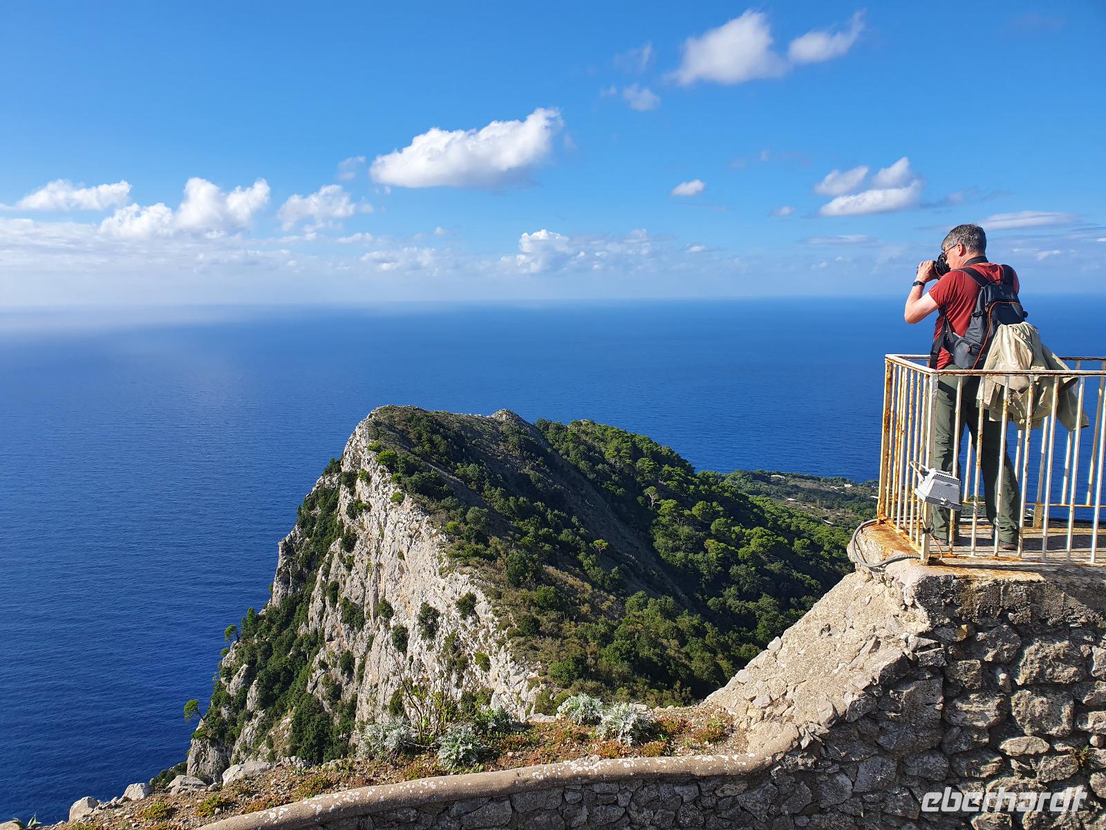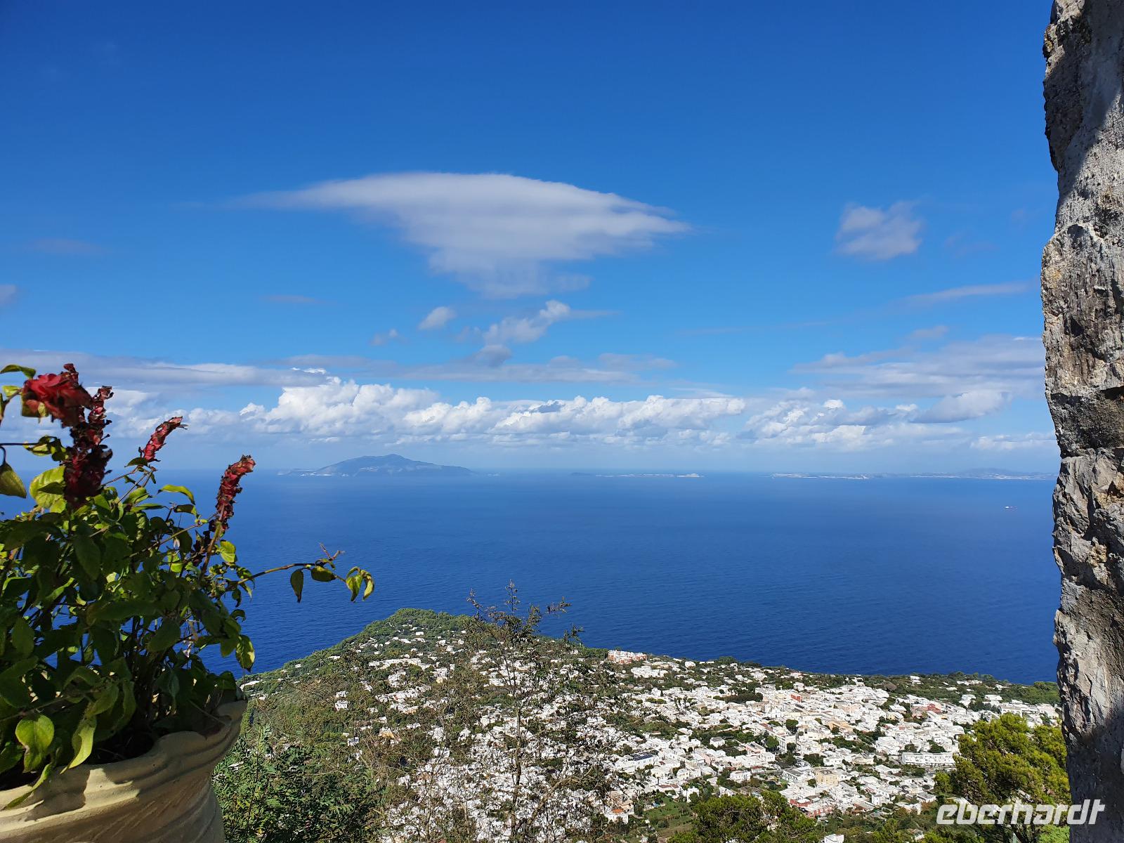 Der Weg auf den Monte Solaro verläuft auf einem alten Maultierpfad mit immer wieder schönen Aussichten auf Anacapri und die Inseln. Gleichzeitig ist er Kreuzweg zur Einsiedelei Santa Maria a Cetrella. Nach dem Pass geht es steil bergan auf schmalen Wegen mit Treppen. Oben angekommen ist das Gipfelplateau menschenleer, nur unsere 5 vom Sessellift geniessen schon den Kaffee. Wir spazieren rundherum, machen Fotos und geniessen diese traumhafte Aussicht. Dann steigen wir ein Stück ab und mit Blick auf Capri, die Faraglioni, die sorrentinische Halbinsel bis hin zur Amalfiküste verspeisen wir unsere Panini und sind einfach nur glücklich. Für den Abstieg schlägt Annamaria den steilen Weg an der Felskante vor, immer mit der eben beschriebenen Aussicht vor Augen. Nach Passieren der Einsiedelei erreichen wir wieden den Maultierpfad und werden von einer Ziegenherde begrüßt. Die Tiere sind sehr zutraulich, lassen sich füttern und streicheln und verfolgen uns schliesslich bis ins Tal. Wieder unten an der Seilbahn ist unsere Gruppe vollständig und gemeinsam erkunden wir Anancapri.