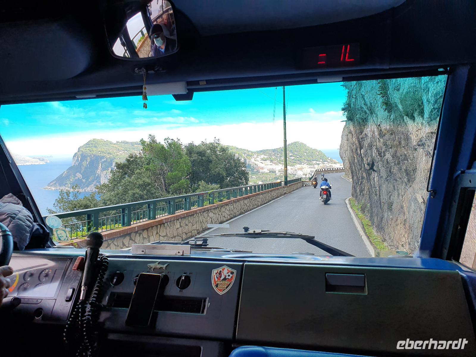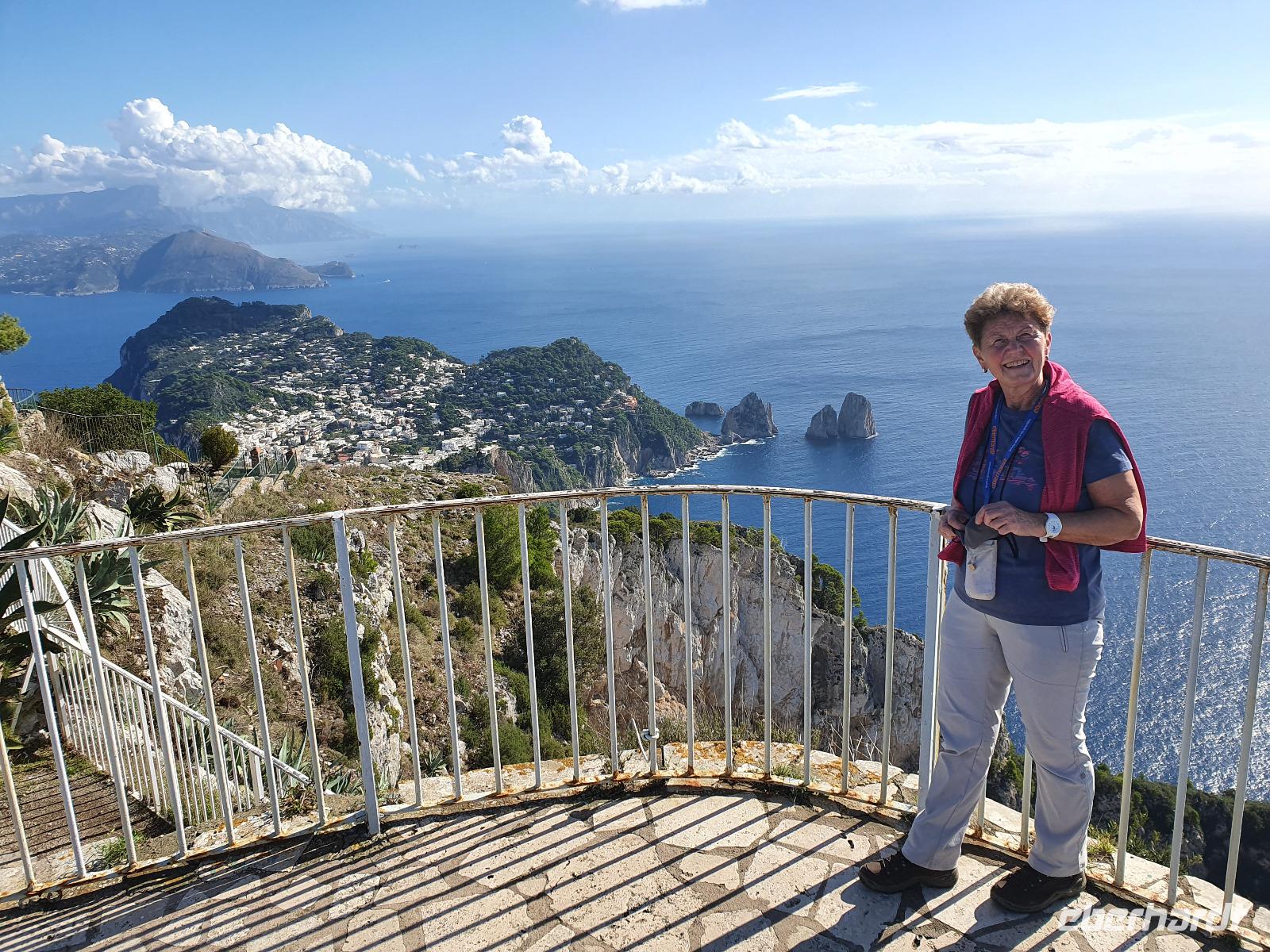 Unsere Kellner im Hotel hatten 6 Uhr schon das volle Frühstücksbuffet aufgebaut und so konnten wir uns stärken und mit dem Bus nach Sorrent fahren. Vom Busparkplatz gingen wir dann über die Treppen hinunter zum Hafen und dort waren weder Menschen noch Fährschiffe zu sehen. Am Schalter der Fährgesellschaft gab es aber die gute Nachricht, dass eine Fährgesellschaft den Betrieb aufrecht erhält. Wir kauften die Tickets und gingen zum Fährableger. Auf der Fähre machte sich dann Erleichterung breit und wir freuten uns alle sehr auf die Insel Capri. Das Meer hatte sich noch nicht beruhigt und so war die Hinfahrt ein wenig ruppig. In Capri dann waren wir fast alleine und schon 9.30 Uhr da. Ich kaufte Panini und Obst für alle und mit einem Privatbus fuhren wir direkt hinauf nach Anacapri. Zu Fuss gingen wir zur Seilbahnstation und 5 Gäste entschieden sich, mit dem Sessellift auf den Monte Solaro zu fahren.