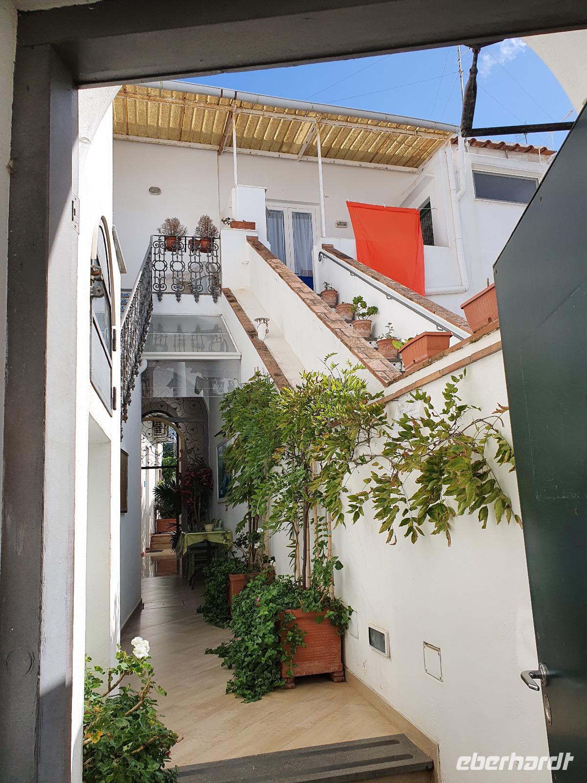 Im Jahr 2020 ist alles anders. Wir können nicht wie sonst gemeinsam nach Neapel fliegen, sondern nutzen die vorhandenen Linienflüge von München, Frankfurt, Stuttgart und Zürich nach Neapel. So kommen wir auch zu unterschiedlichen Zeiten an und sehen uns erstmals 19 Uhr in der Hotel Lobby, nachdem der letzte Gast mit dem Schiff von Capri eintrifft. Leider fehlt der Koffer einer Teilnehmerin und wir hoffen, dass er bald kommt. Wir nutzen das erste Treffen gleich für wichtige Informationen und stellen uns kurz vor. Annamaria, unsere Wanderreiseleiterin, stößt zu uns und so kann sie auch gleich noch Wichtiges für die Wanderwoche verkünden. Danach gehen wir zum Abendessen im Hotelrestaurant, wo man für unsere Gruppe einen langen Tisch reserviert hat. Jeden Abend stellen wir unser Wahlmenue selbst zusammen und lassen uns überraschen von dem was dann auf den Tellern liegt.