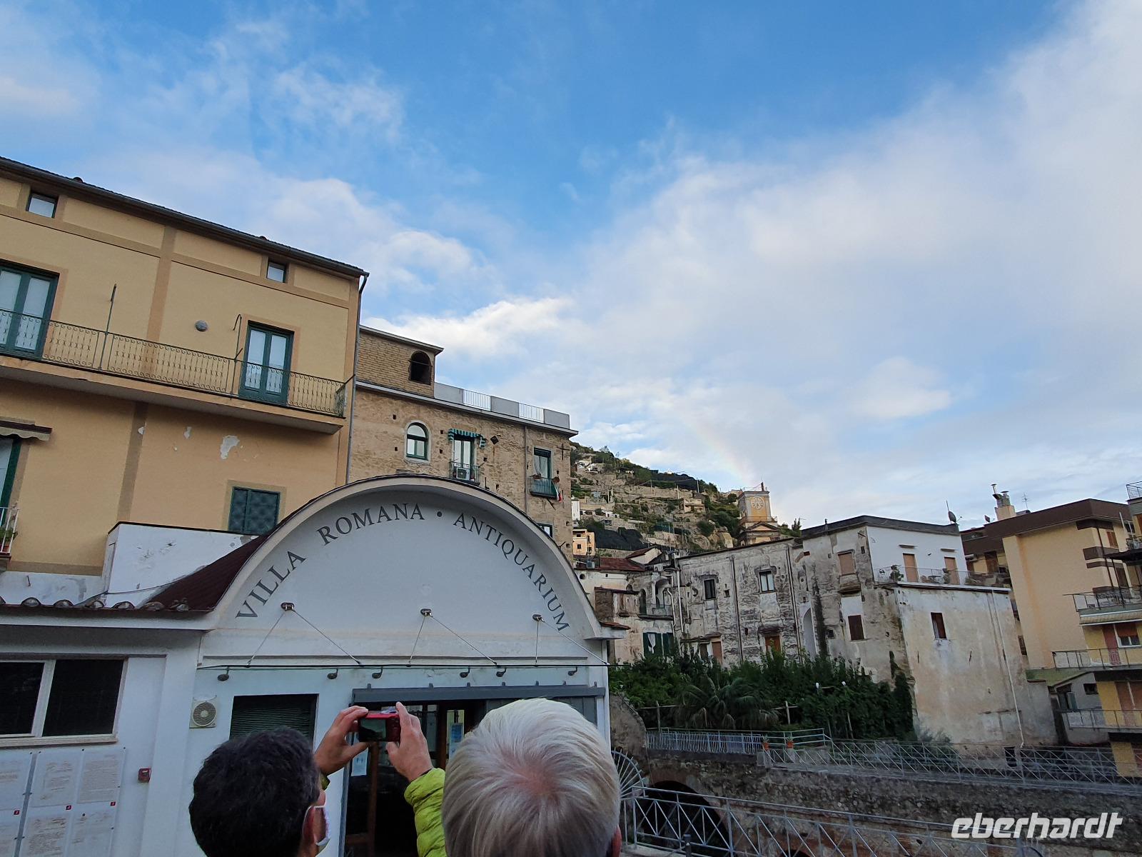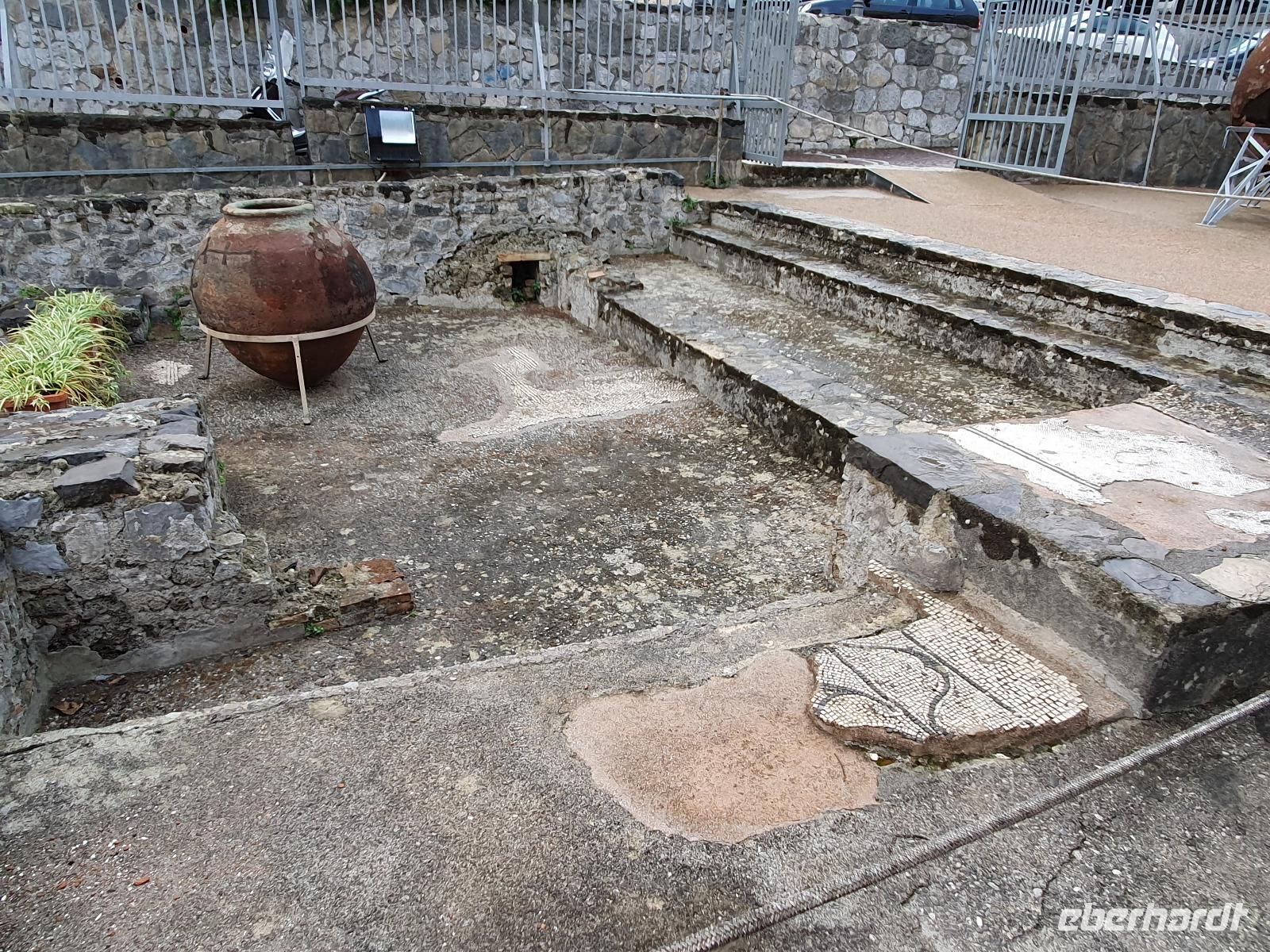 Am späten Nachmittag treffe ich mich noch mit einigen interessierten Gästen, um die Villa Romana im Stadtzentrum zu besichtigen. Entlang der Küste gab es viele solcher Villen von wohlhabenden Römern und die meisten gerieten in Vergessenheit und die Steine wurden für eigene Hausbauten gebraucht. Die Villa Romana fand man eher zufällig bei Bauarbeiten und legte die Teile frei, die noch nicht überbaut waren. Heute sind die Thermen noch gut zu erkennen und der Innenhof zeugt von der einstigen Größe der Villa. Einige Mosaike sind noch gut erhalten und die gefundenen Gegenstände werden in einem kleinen Museum gezeigt.