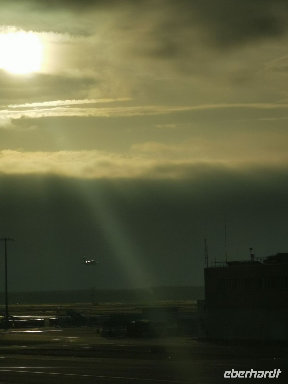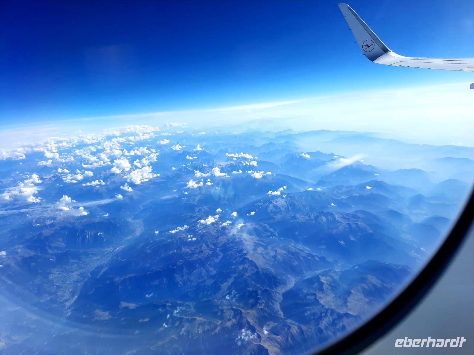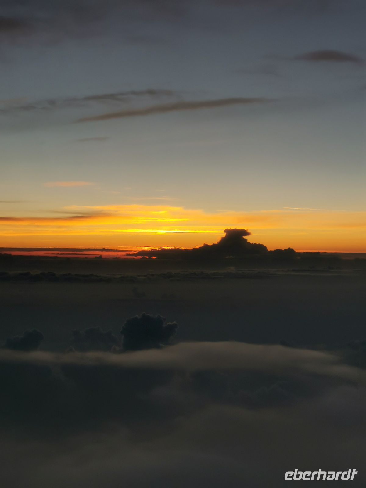 Die Abfertigung, die Kontrollen, alles ging recht zügig und reibungslos und der vollbesetze Flieger hob planmäßig Richtung Frankfurt ab, sodass wir, als wir die Wolkendecke durchquert hatten, einen herrlichen Sonnenaufgang erleben konnten. Schüttelfrei und mit präziser Landung setzte der Kapitän den Vogel auf der Landebahn auf.