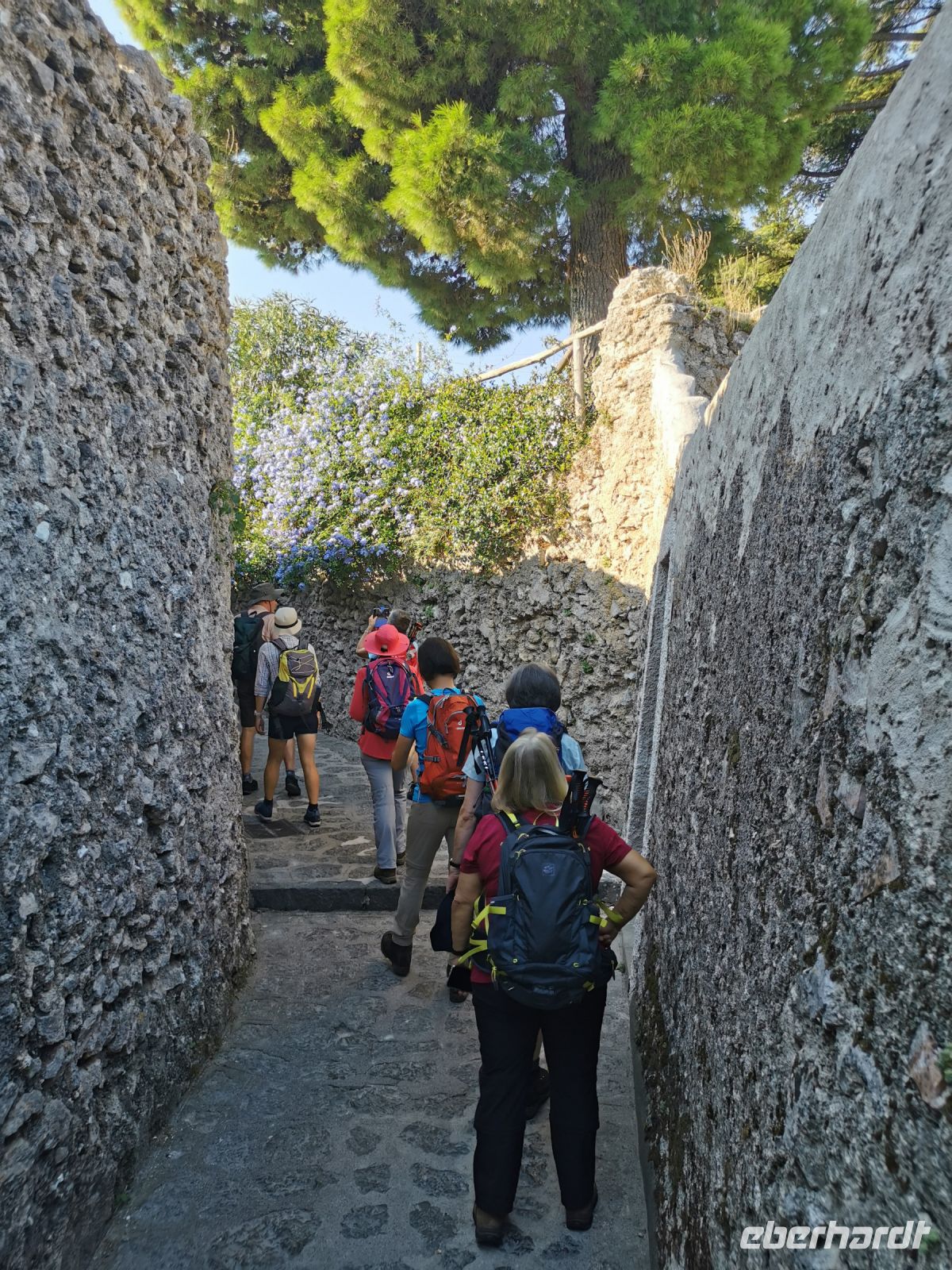 Frisch gestärkt, die Wasserflaschen gefüllt, so marschierten wir frohen Herzens weiter auf den alten Eselswegen und Mulipfaden durch das Valle dei Mulini. Dem Mühlental, einem Tal zwischen den „Milchbergen“, den Monte Lattari, hinunter nach Amalfi.