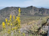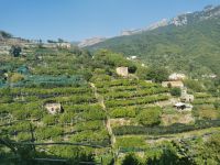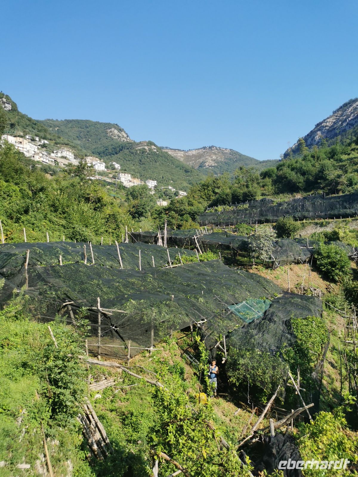 Anfänglich begleiteten uns zahllose Zitronenplantagen, abgedeckt mit einem Meer aus schwarzen Netzen, sodass man die Früchte darunter nur erahnen konnte. Ab und zu tat sich ein Loch auf, wo man sie teilweise sehen konnte. Meist noch grün und man musste genau hinschauen um sie zu entdecken. Manchmal hatte man Glück und es leuchteten dazwischen vereinzelt schöne reife Früchte in goldener Farbe. Die Zitronenernte ist hauptsächlich im Juli-August und dann wieder im Spätherbst.Der Duft von rotem Basilikum und wildem Fenchel begleitete uns hinauf zum Sella die Mandrino, einem Gipfel der Monte Lattari bis hinüber ins Tal von Tramonti.