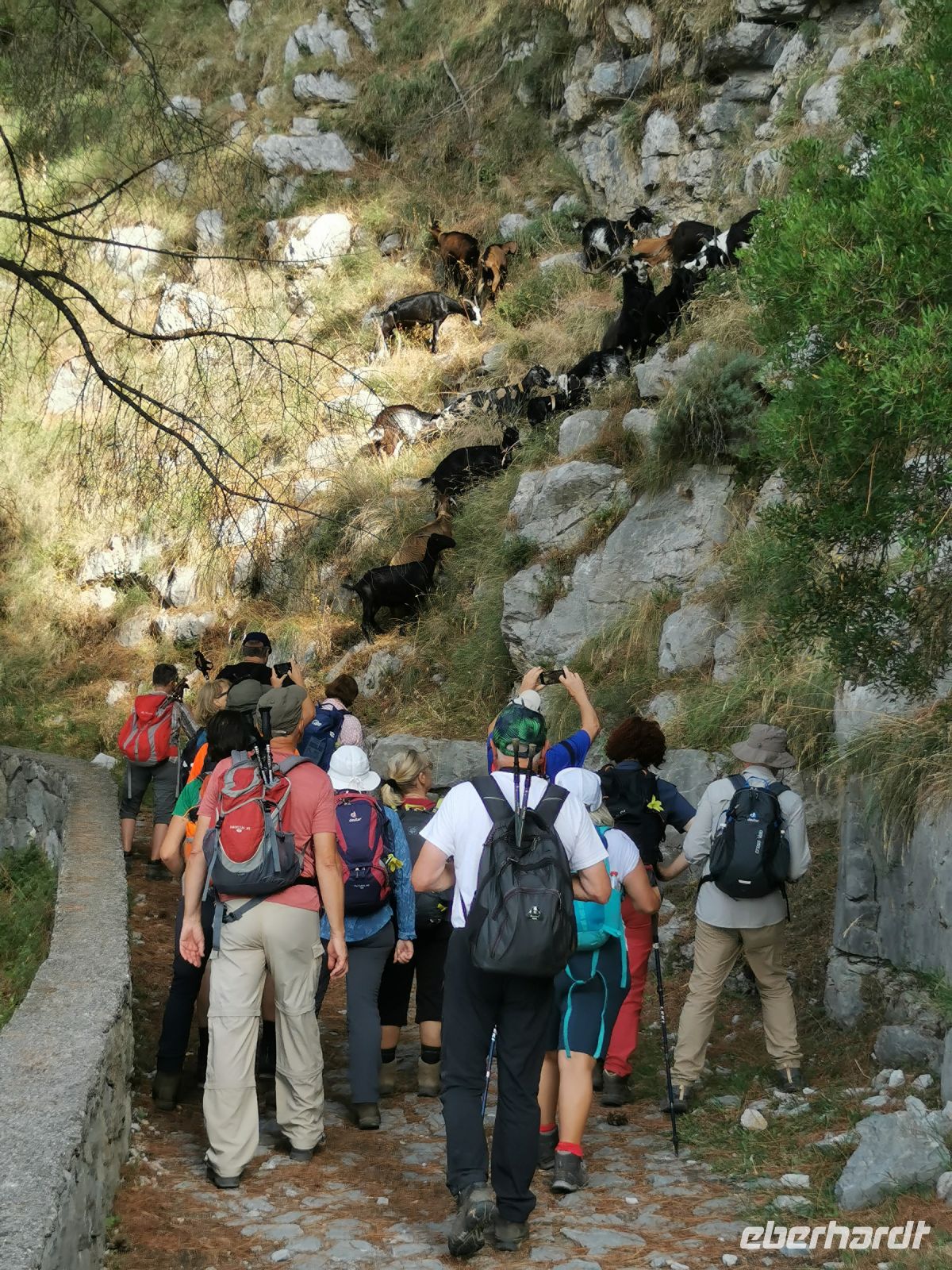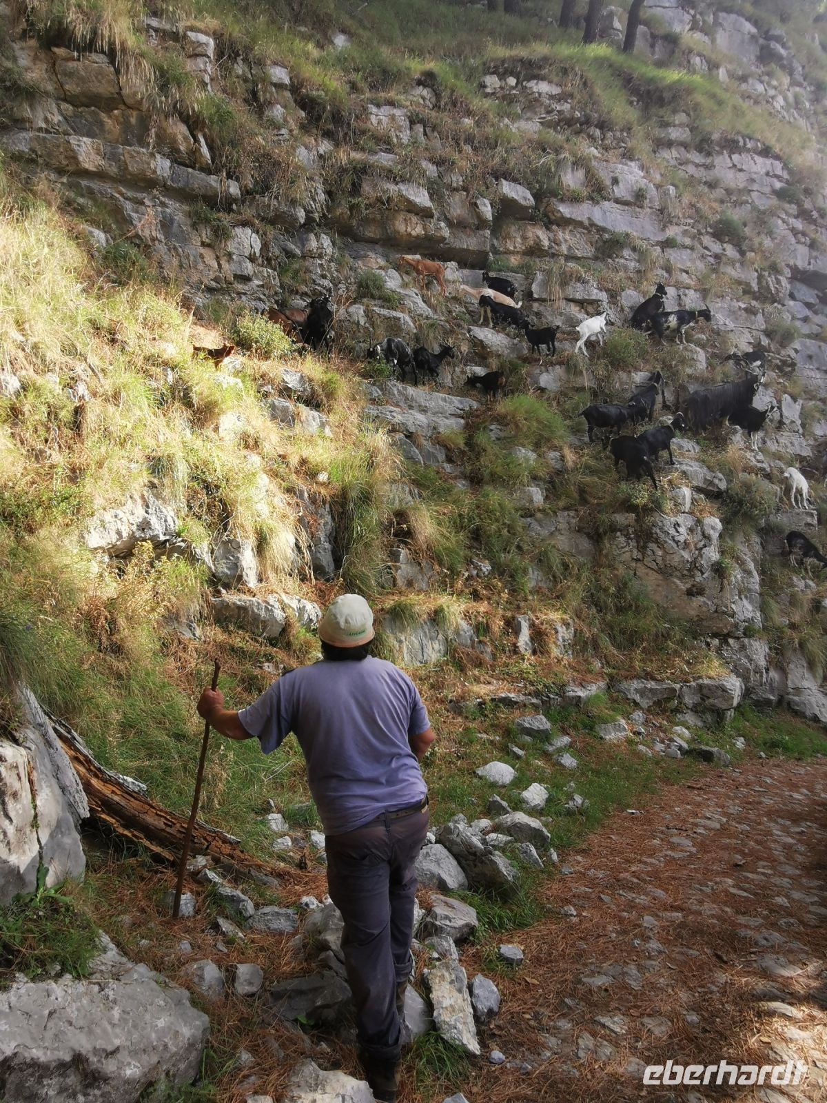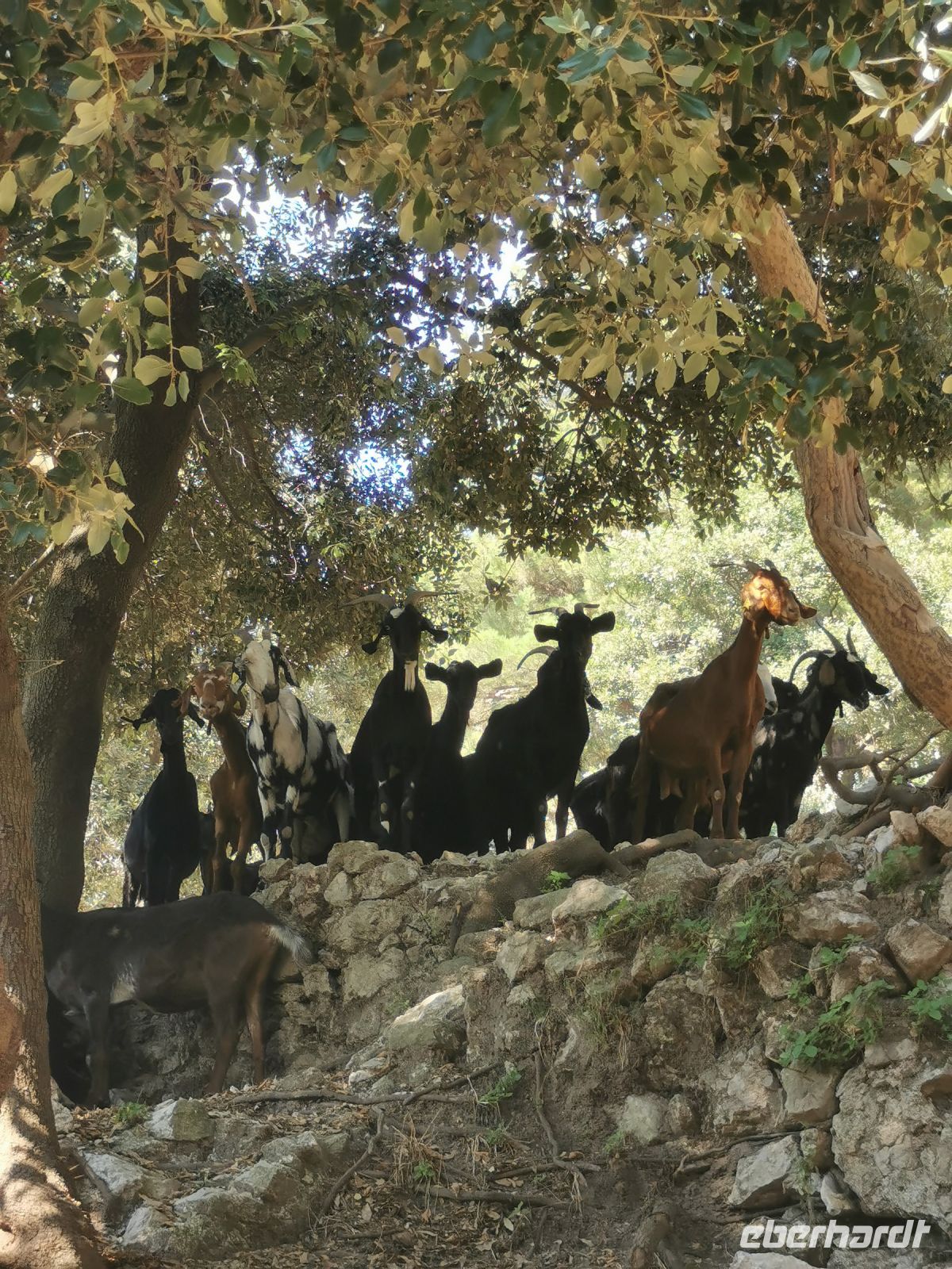Da war mitten im Wald der Ziegenhirte, den man durch die sonnengebräunte Hautfarbe kaum von den Bäumen unterscheiden konnte. Plötzlich stand er am Wegesrand und pfiff seine Melodie, lächelte uns zu und erzählte, dass er mit seinen Hunden und dem Maultier geduldig auf seine Ziegen wartet. In der Ferne konnte man schon die Glocken seiner Herde hören. Der Herr kennt seine Ziegen und die Ziegen ihren Herrn. Unweit des Hirten sah man wie die Herde dem Hirten bereits entgegen lief, unter den achtsamen Augen des Ziegenbockes, der auch schon mal energisch etwaige Langweiler antreiben musste.