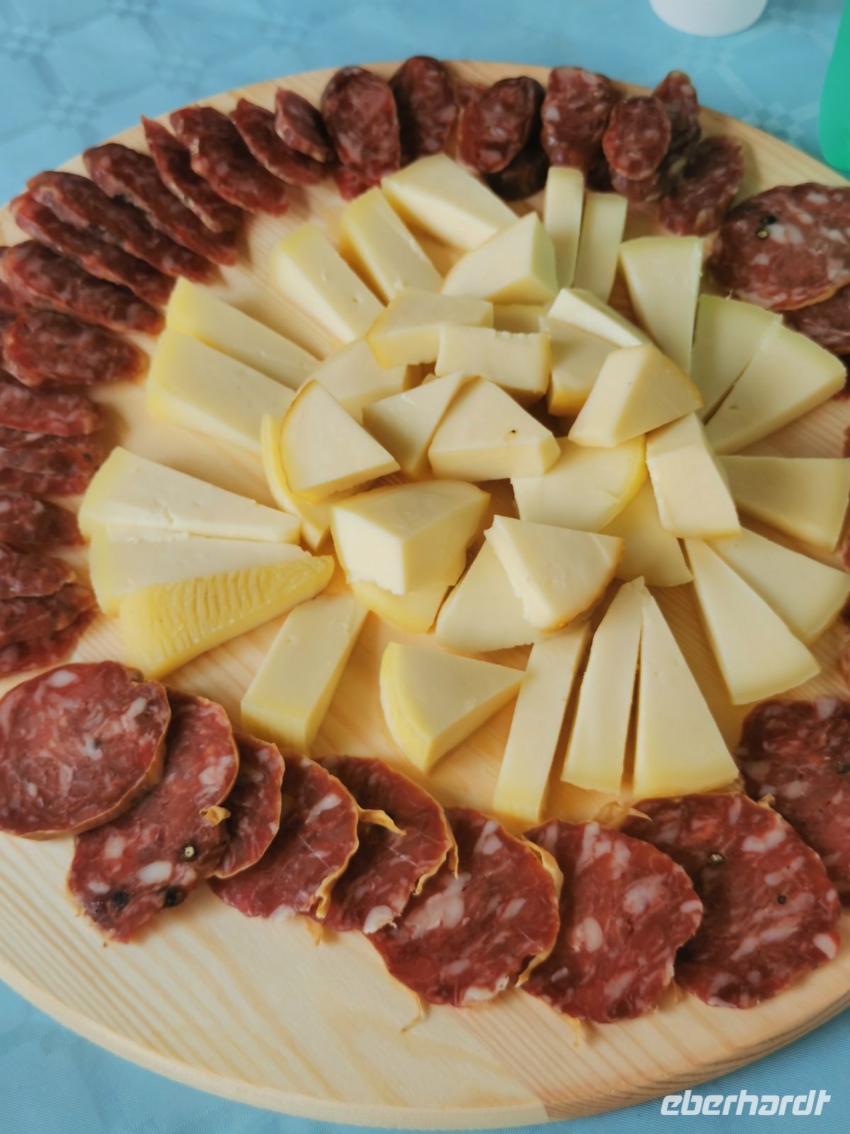 Als Hauptspeise hausgemachte Salami mit verschiedenen Käsesorten, unter anderem ein geräucherter Kuhkäse. Dazu der Tintare und man konnte die Zeit vergessen. Man konnte auch vergessen, dass man eigentlich zum Wandern unterwegs ist.