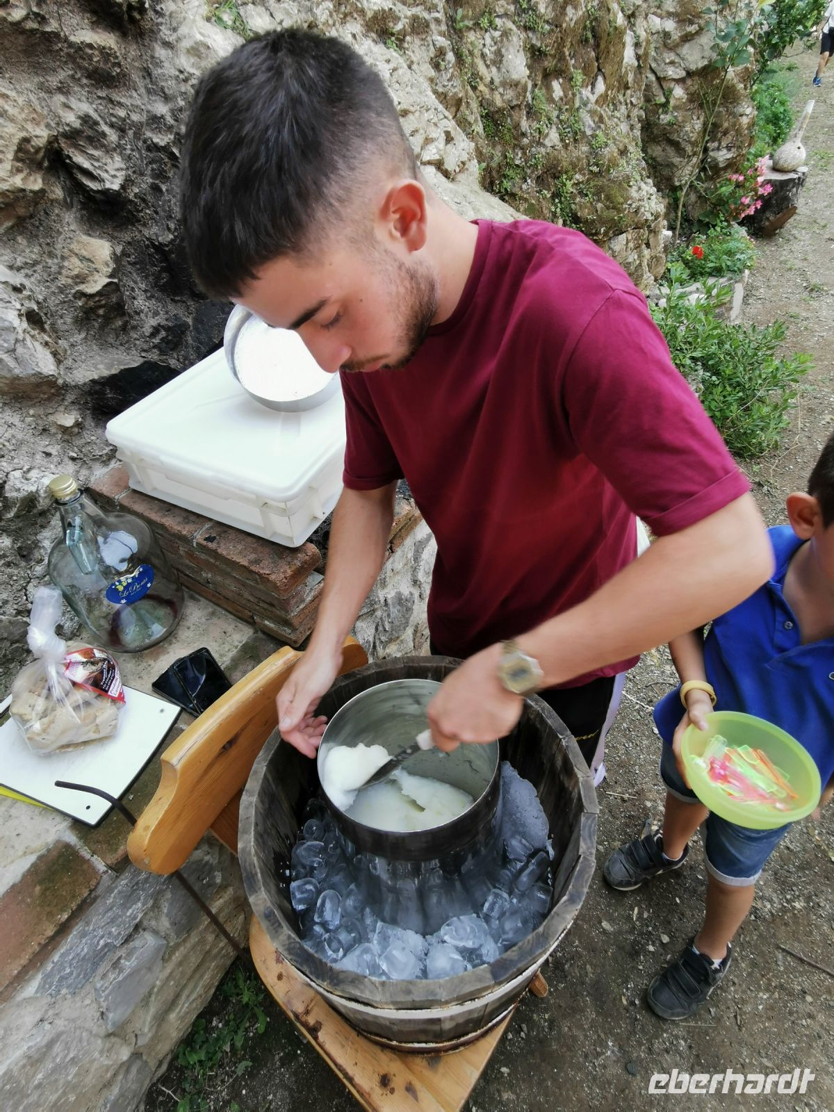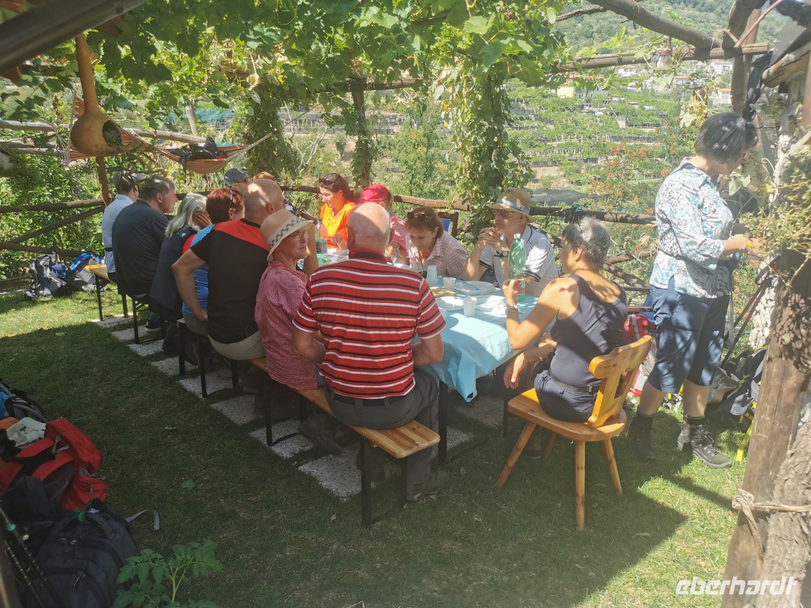 Die Luft, die Atmosphäre, der leichte Wind, die Gespräche, die Familie die bereitwillig alle Fragen mit einer Herzlichkeit beantwortete. All dies, verbunden in einer Einheit, stimmte die Gemüter froh und glücklich. Da war der kleine Junge, der einer unserer weiblichen Wanderin mit Freude die Weinberge erklärte und kurz darauf sich mit dem Bruder stritt, weil dieser ihm nicht erlaubte bei der Herstellung von Granita mithelfen und er daraufhin weinend zur Mutter lief.