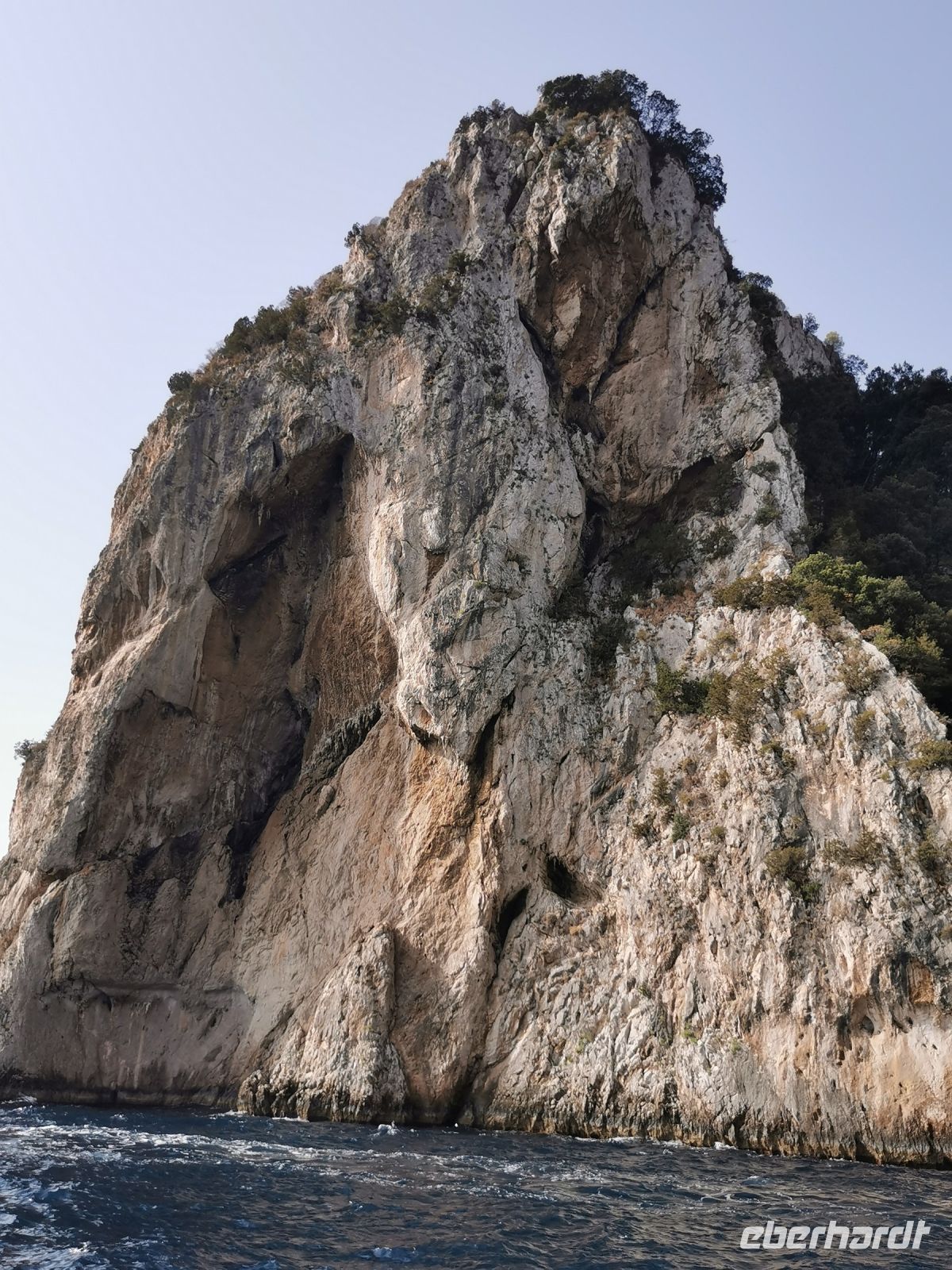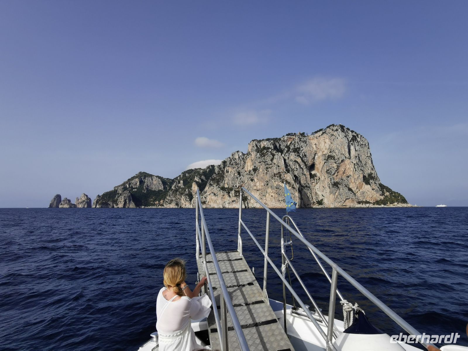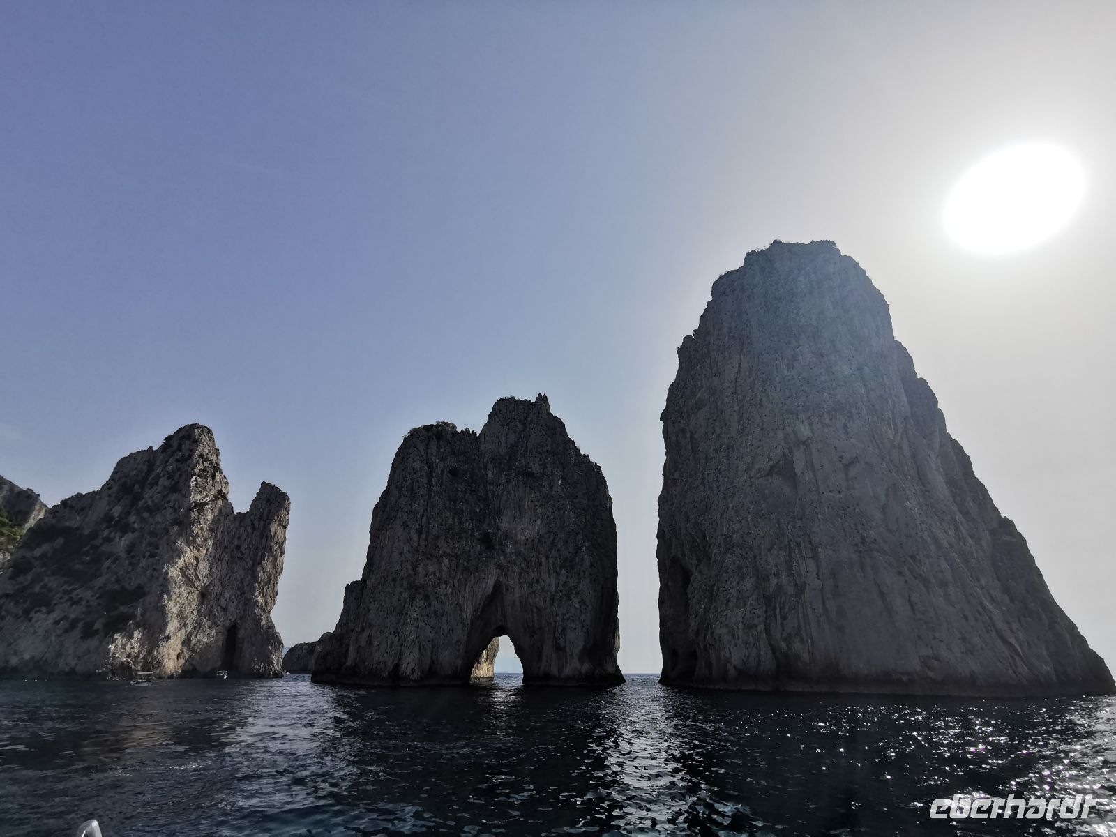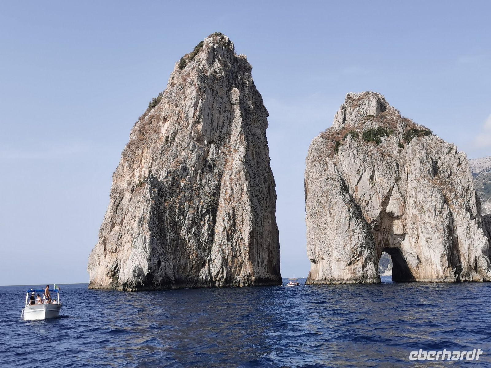 Auch wir gehörten heute zu den Auserwählten. In gut eineinhalb Stunden brachte uns das Boot von Minori hinüber zur Insel. Da kein Gesang zu vernehmen war, mussten wir nicht irgendwo im Boot festgebunden werden, als wir die Sirenenfelsen passierten. Unser Kapitän steuerte sein Schiff direkt auf die kegel- und nadelförmige Felsenformation der Faraglioni zu. Faraglione stammt vom griech. Wort Pharos ab, was Leuchtfeuer bedeutet. Früher befanden sich auf den Felsen Leuchtfeuer zur Orientierung der Schiffe.