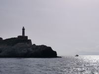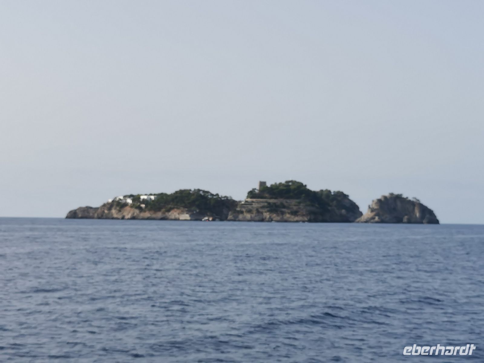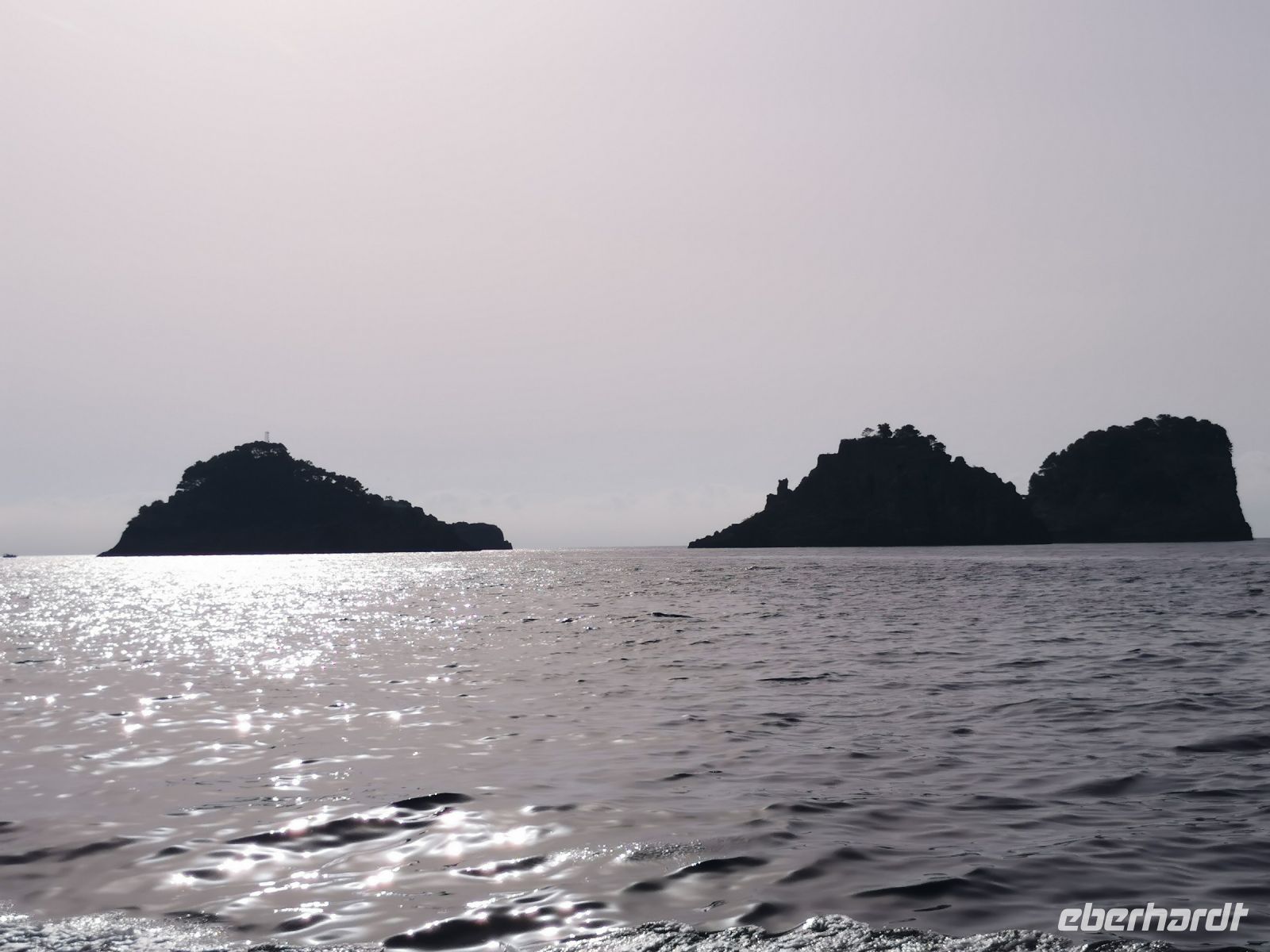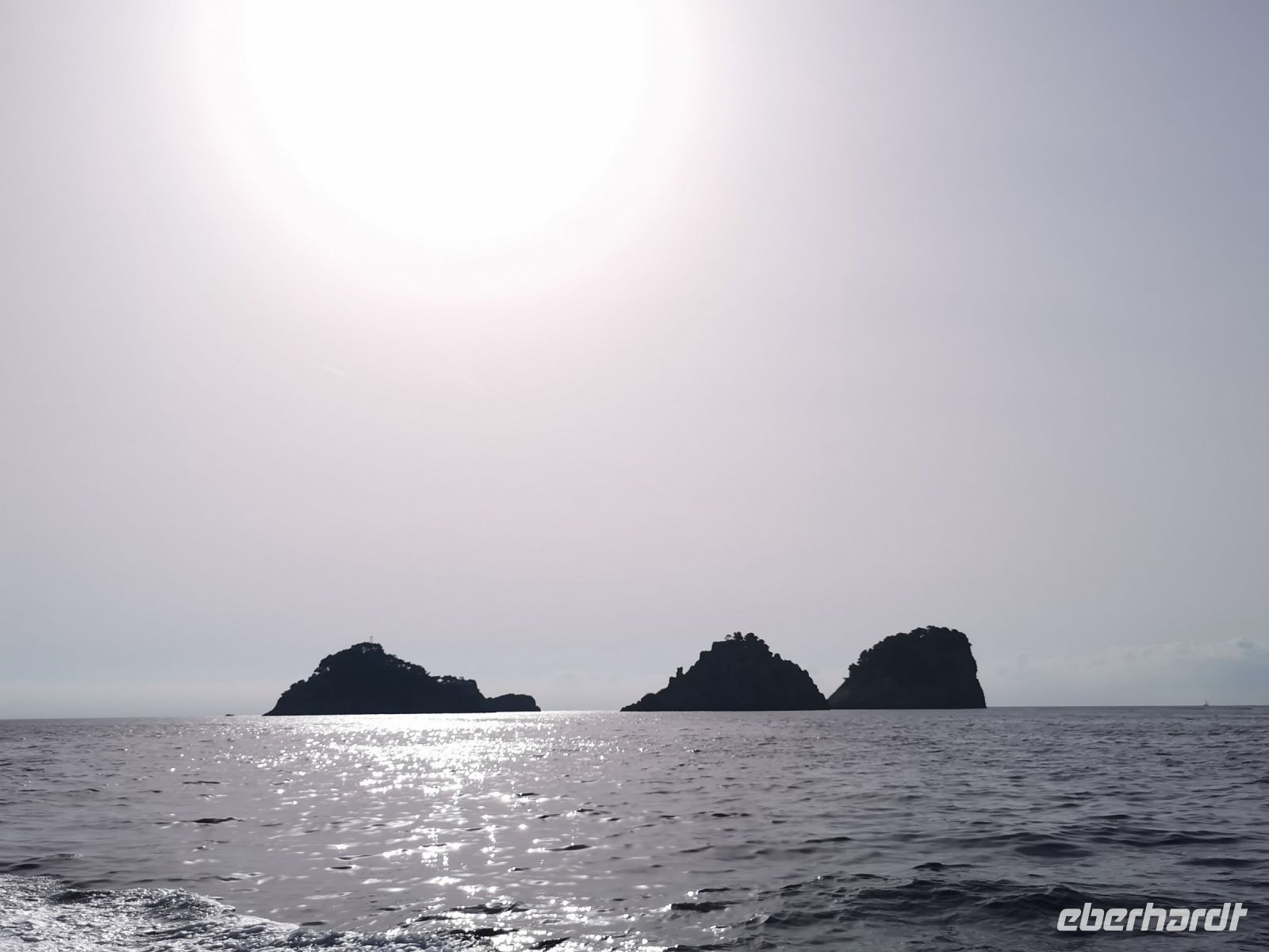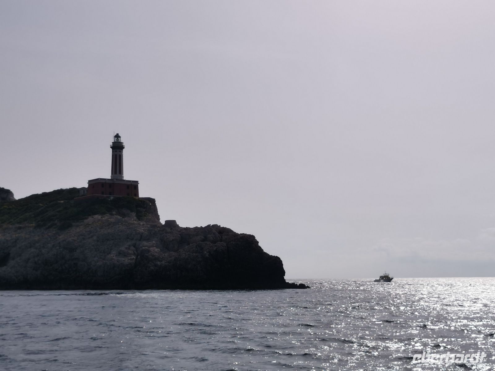 Auch wir gehörten heute zu den Auserwählten. In gut eineinhalb Stunden brachte uns das Boot von Minori hinüber zur Insel. Da kein Gesang zu vernehmen war, mussten wir nicht irgendwo im Boot festgebunden werden, als wir die Sirenenfelsen passierten. Unser Kapitän steuerte sein Schiff direkt auf die kegel- und nadelförmige Felsenformation der Faraglioni zu. Faraglione stammt vom griech. Wort Pharos ab, was Leuchtfeuer bedeutet. Früher befanden sich auf den Felsen Leuchtfeuer zur Orientierung der Schiffe.