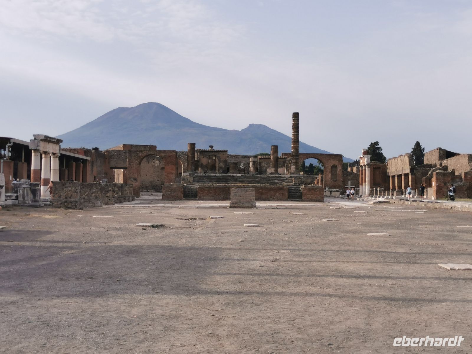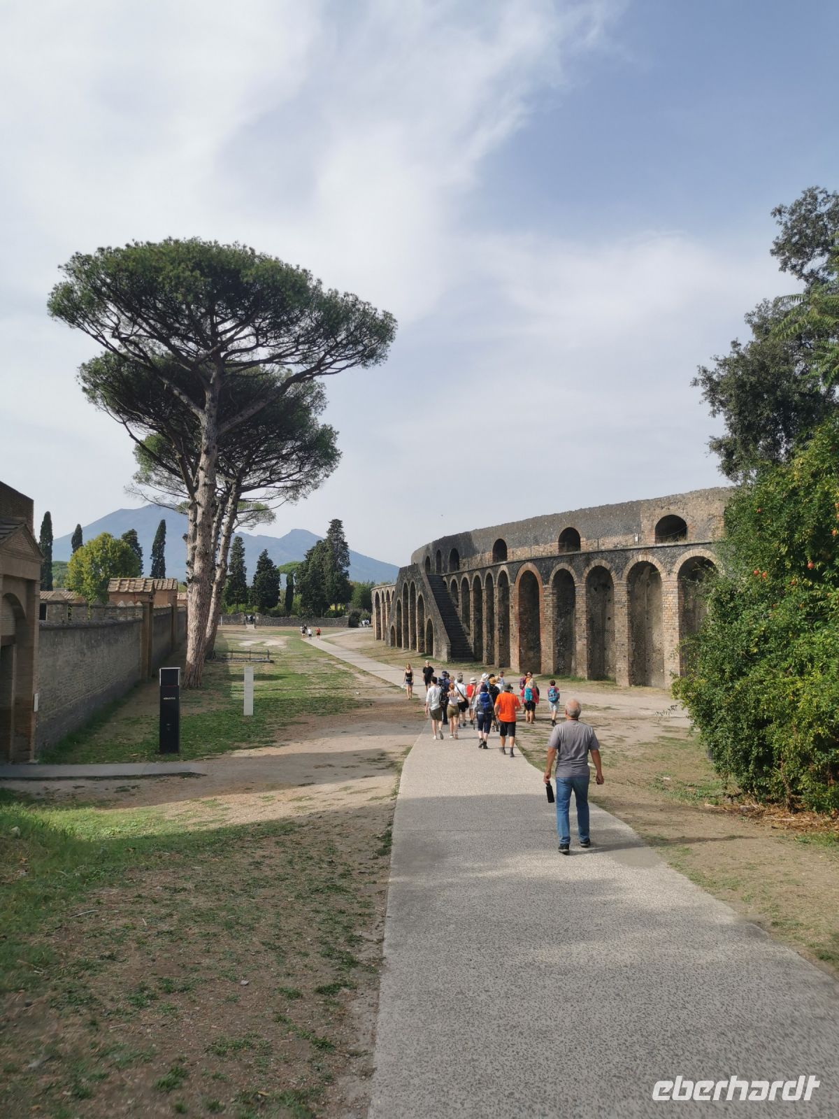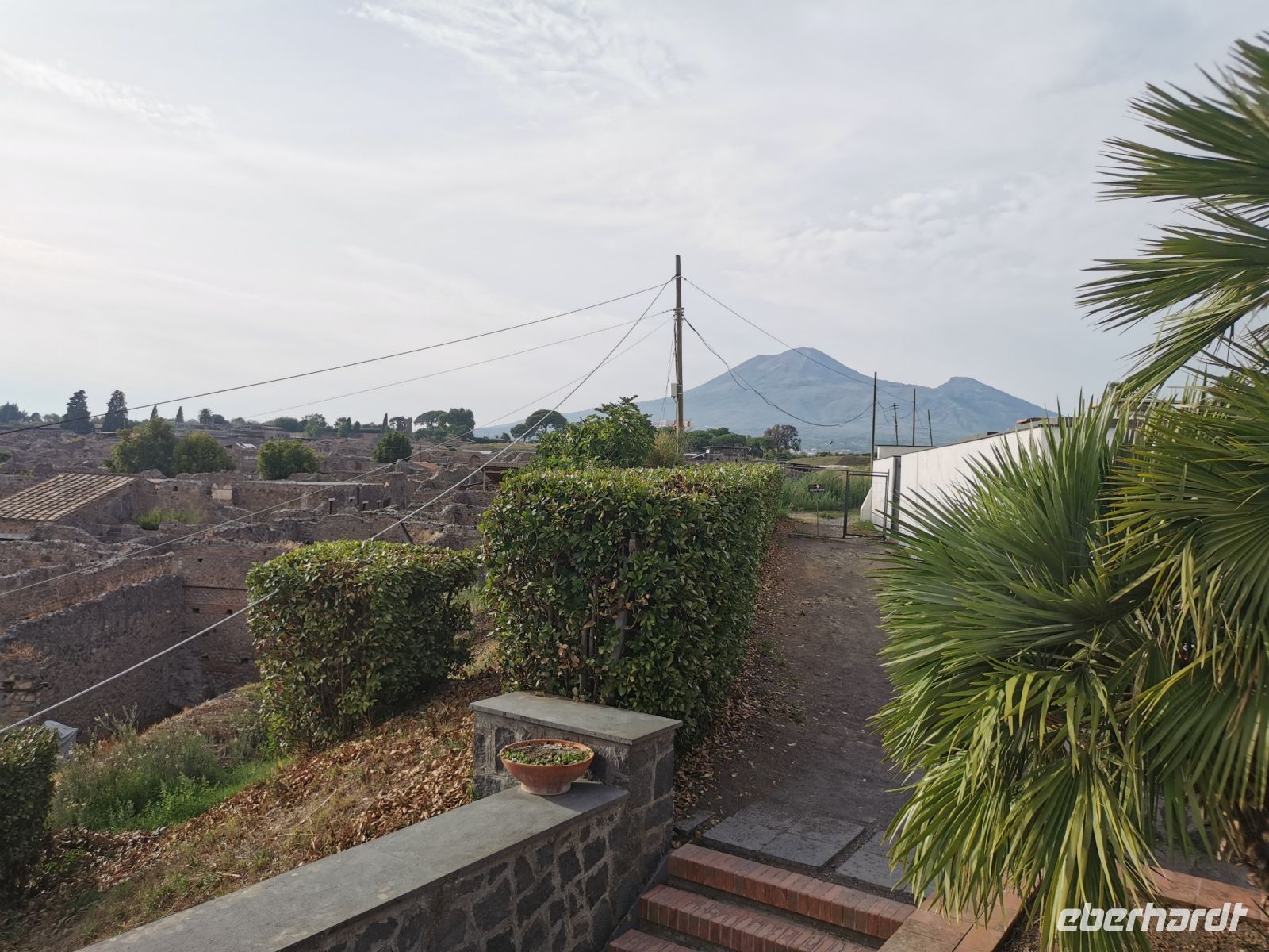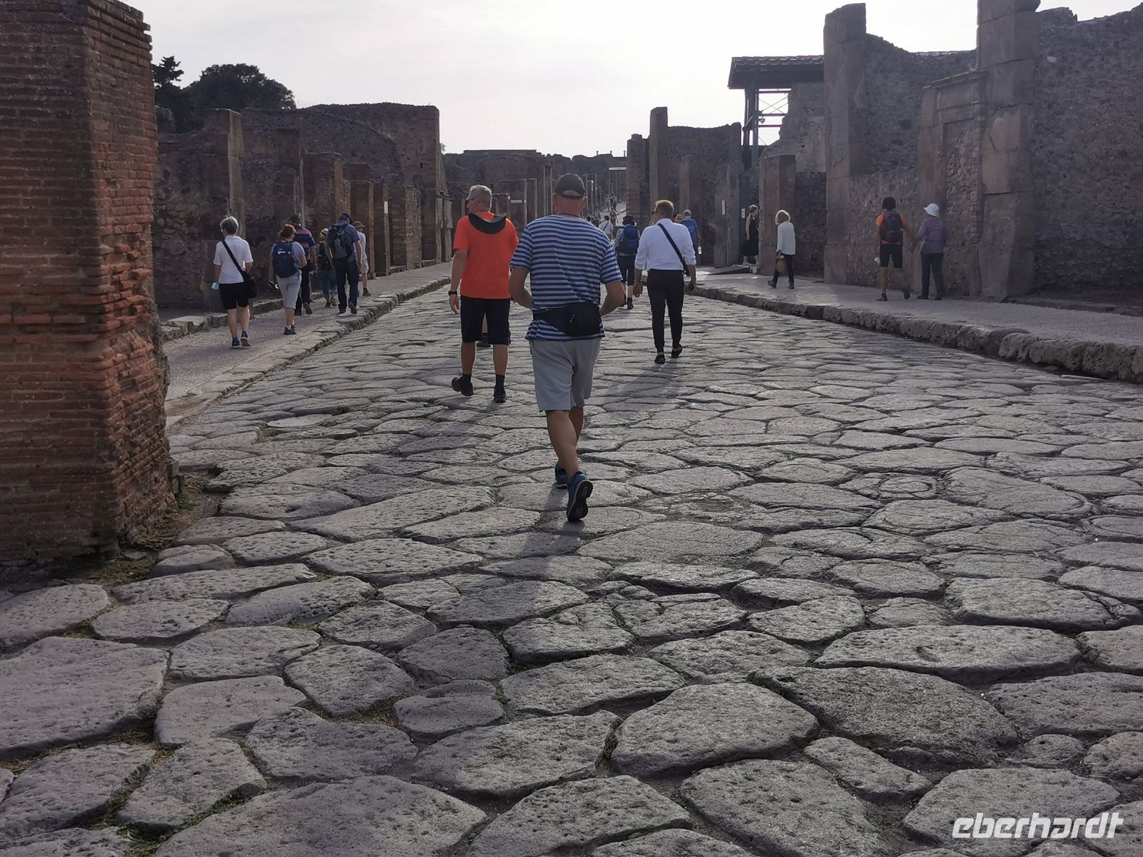 Unser Weg durch die Stadt führte uns angefangen am Amphitheater, im äußersten Westen, vorbei am exclusiven kleinen Weingarten Foro Boario im Norden, zum Haus des Meander, hinauf ins Thermopolium, wo es Toiletten gab und man eine herrliche Aussicht über Pompeji hat. Über den ausgegrabenen Teil und dem Teil, an dem noch gearbeitet wird. Unser Weg führte weiter Richtung Osten über das Forum, dem eigentlichen Hauptplatz des antiken Pompejis zum Ausgang bei Porta Marina.