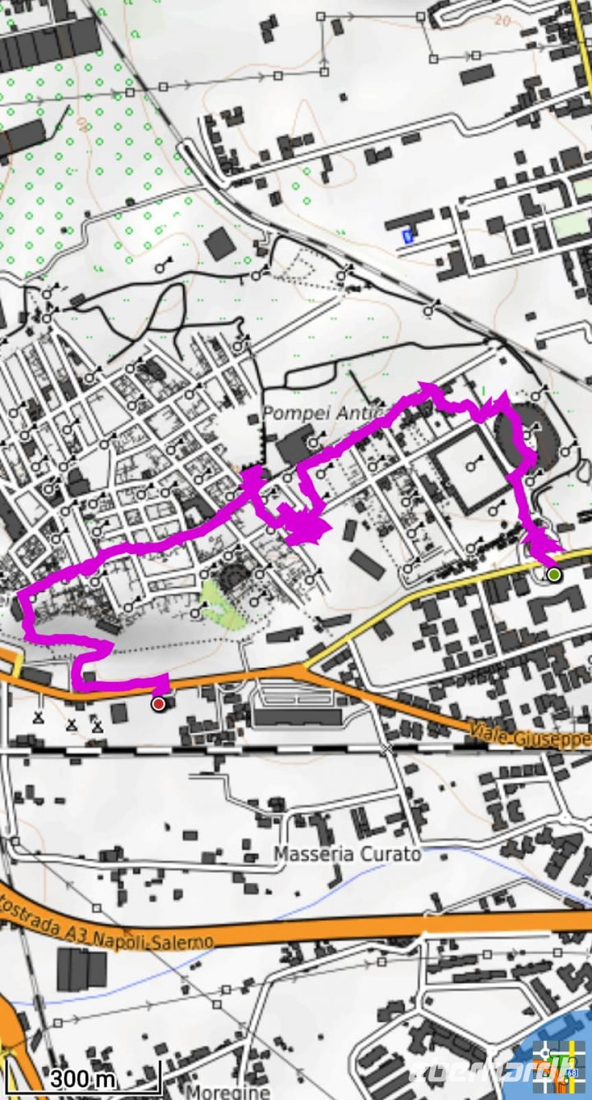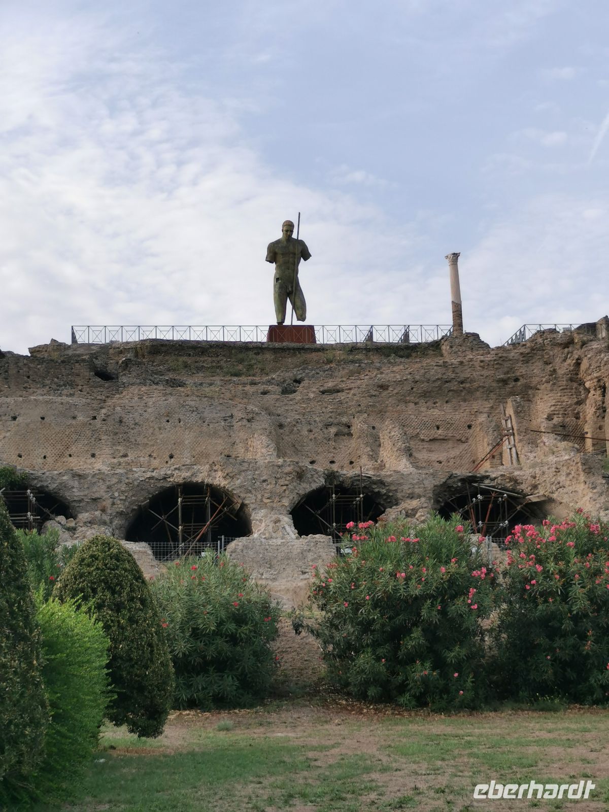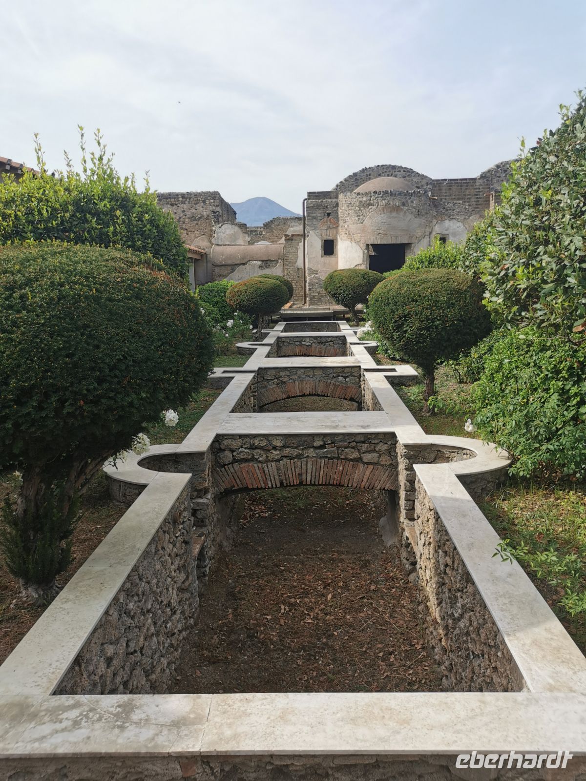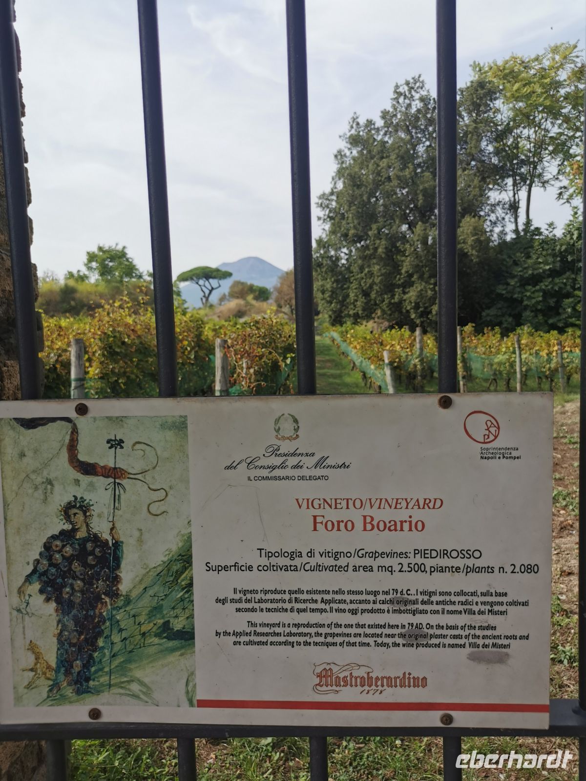 Unser Weg durch die Stadt führte uns angefangen am Amphitheater, im äußersten Westen, vorbei am exclusiven kleinen Weingarten Foro Boario im Norden, zum Haus des Meander, hinauf ins Thermopolium, wo es Toiletten gab und man eine herrliche Aussicht über Pompeji hat. Über den ausgegrabenen Teil und dem Teil, an dem noch gearbeitet wird. Unser Weg führte weiter Richtung Osten über das Forum, dem eigentlichen Hauptplatz des antiken Pompejis zum Ausgang bei Porta Marina.