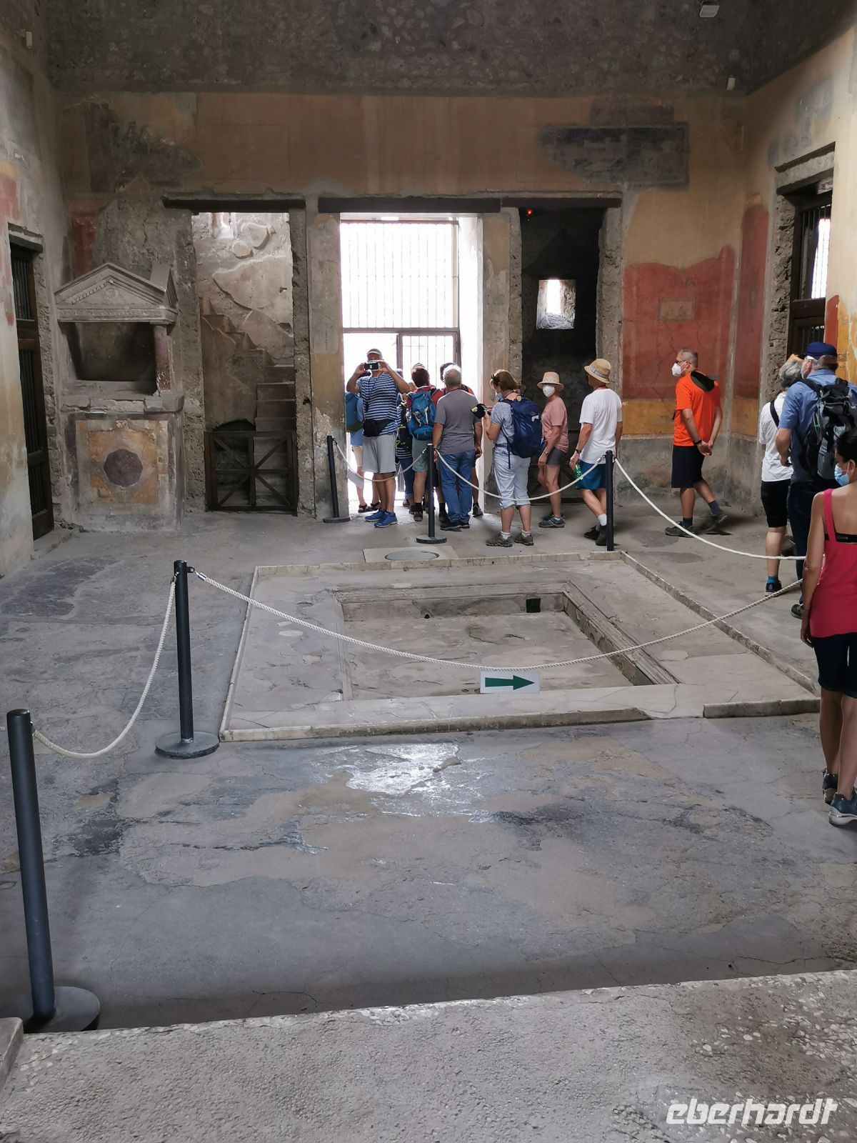 Während der Wanderung durch die Stadt erfuhren wir dass Pompeji einst durch 4 Bürgermeister regiert wurde, zwei für interene und zwei für externe Angelegenheiten. Wie die Geschäfte aufgebaut waren, wie viel ein durchschnittlicher Geschäftsmann am Tag mit der Ausgabe von Speisen verdienen konnte, umgerechnet heute ca. 1000€. Dass Kaiser Tiberius hier die Urinsteuer einführte und das daraufhin hier auch der Spruch entstand „Geld stinkt nicht“. Dass hier Personen untergebracht waren, die an der Ermordung Cäsars beteiligt waren und als Dankeschön ein schönes Haus erhielten.