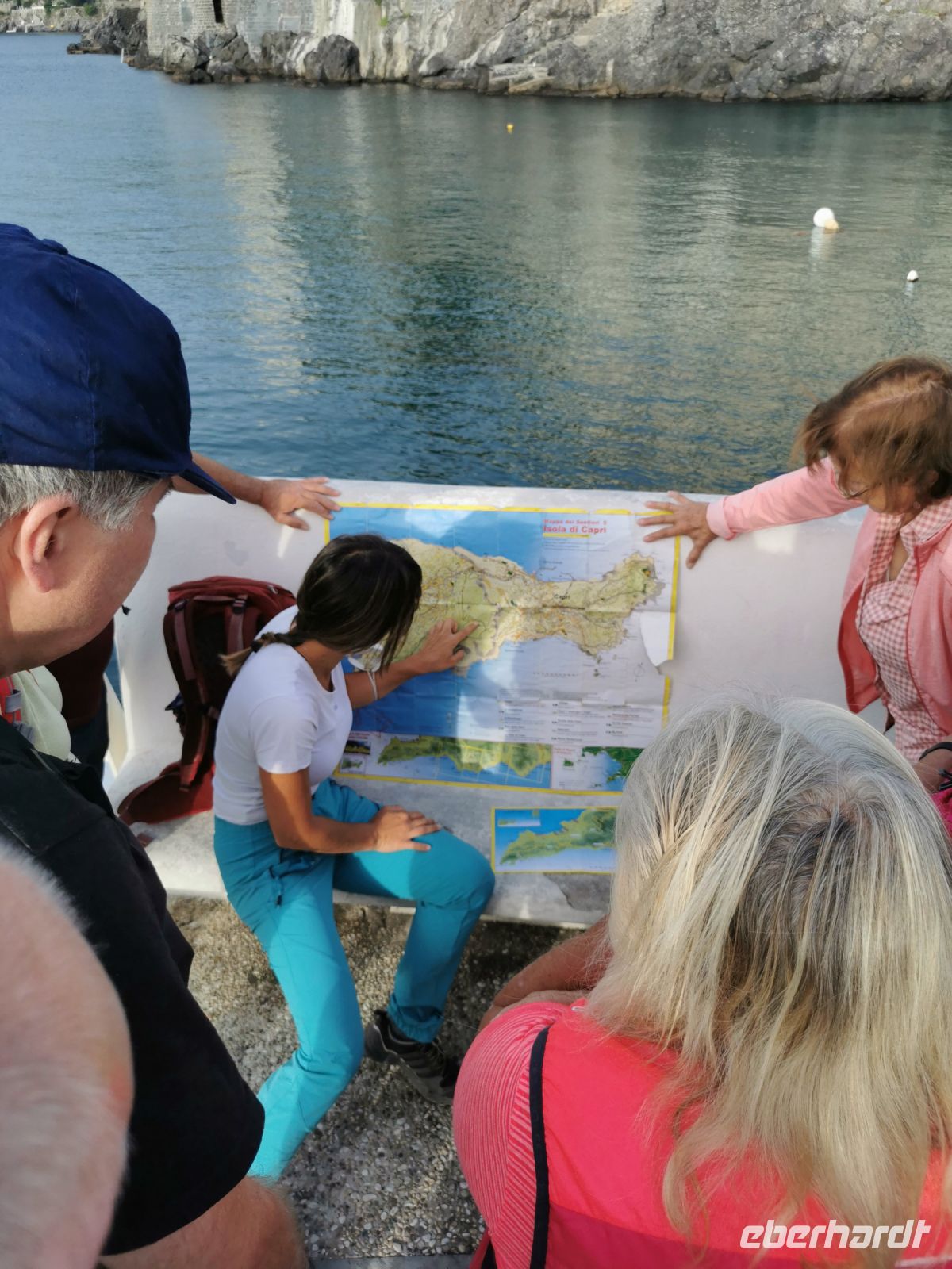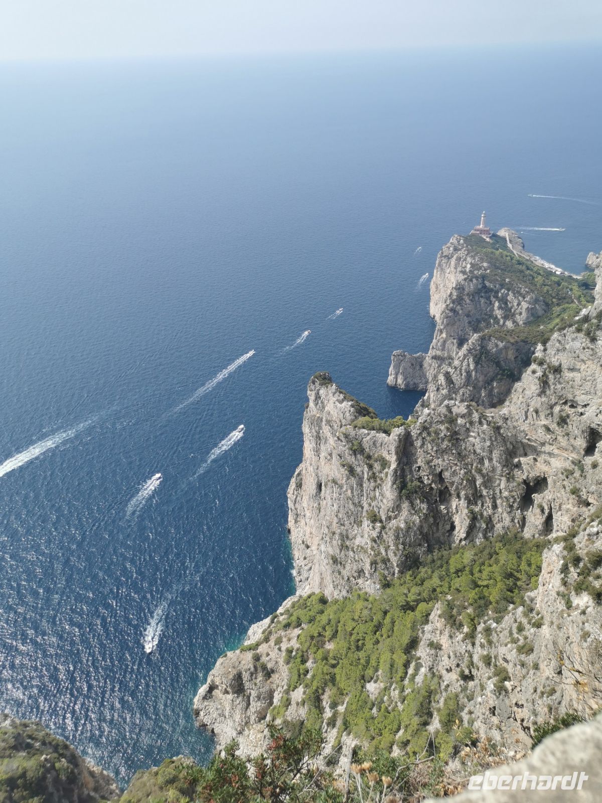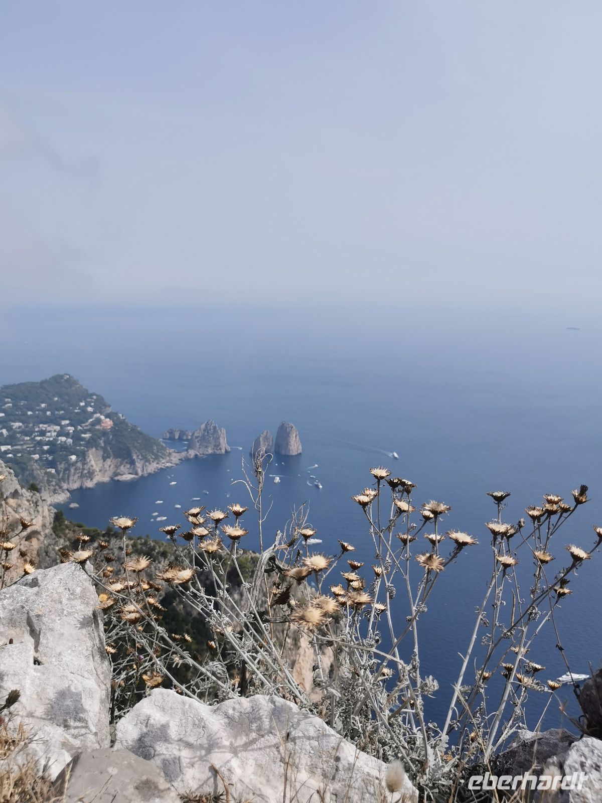 Von Anacapri aus, der Stadt oberhalb von Capri mit etwa 7000 Einwohnern, da wo das Leben noch bescheidener und ruhiger ist, führte uns Veronika heute auf dem schönsten Panoramaweg der Insel hinauf zum Monte Solare, dem Sonnenberg. Zuerst durch dem Ort hinüber zur Westküste mit gewaltigem Ausblick aufs Meer und Leuchtturm. 300 Meter unter uns zogen unzählige Boote weiße Fäden durch das tiefblaue Meer. Und dann im steilen Anstieg auf wilden Wegen hinauf auf den 600m hohen Gipfel. Immer wieder diese imposanten Ausblicke auf das türkis- und smaragdfarbene Meer, die Kalkfelsen entlang der Küste, die Fraglionifelsen und auf der anderen Seite die Blicke über die ganze Insel und Anacapri. Die Weichheit der Farben und das malerische Licht ließen unsere Herzen höher schlagen, besonders das der Fotografen, und machten den Ausflug zu einem Highlight der Reise.