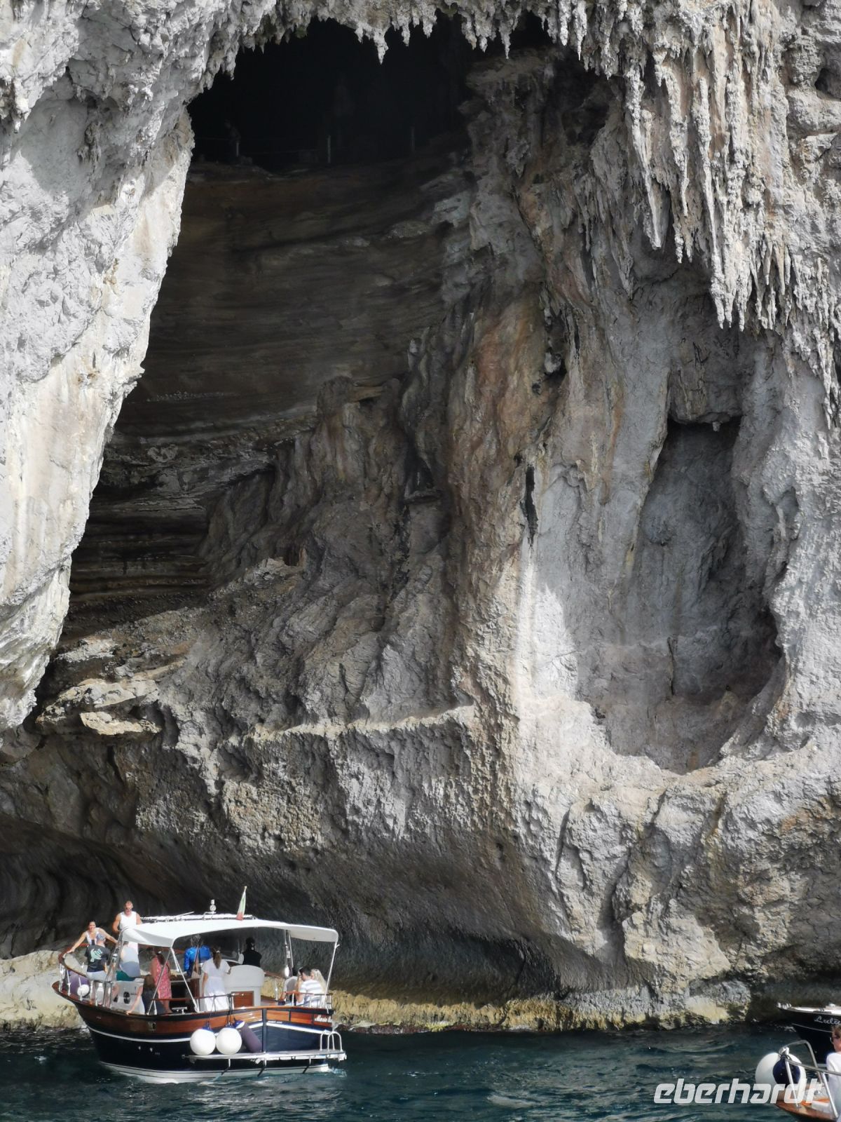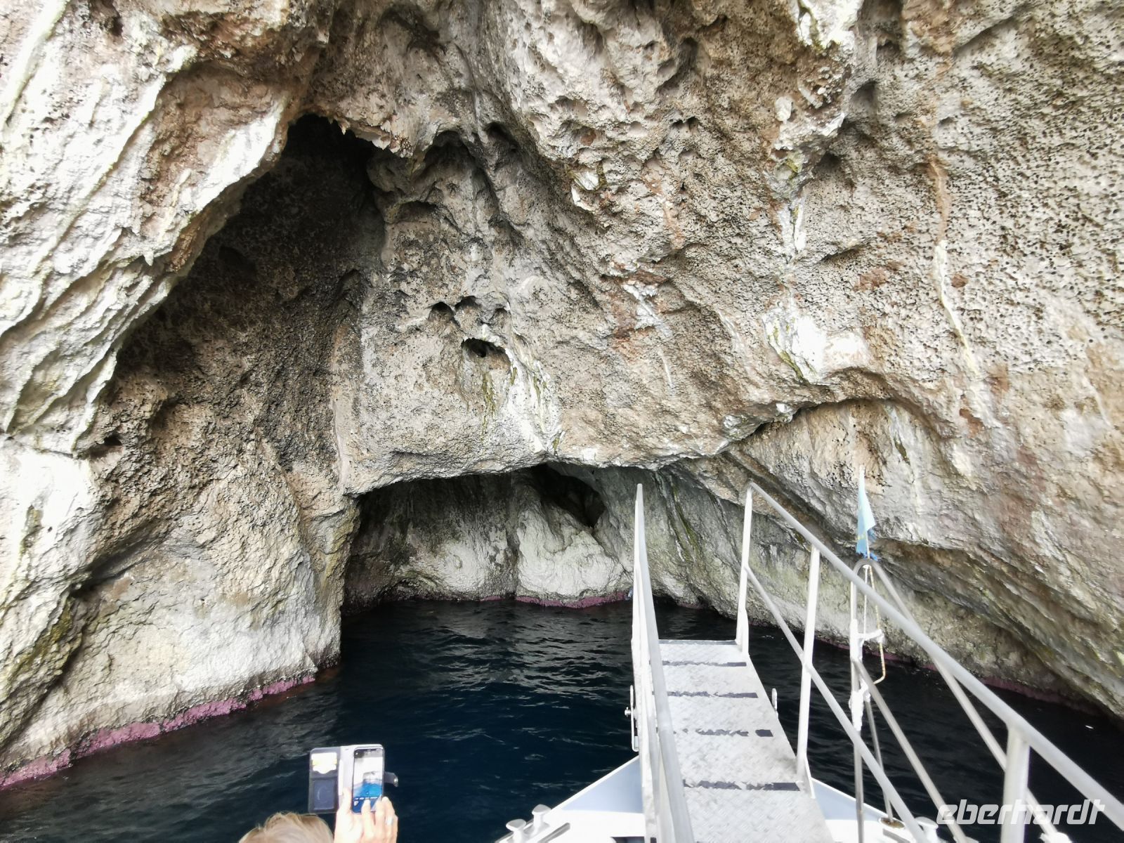 Ein wunderbares Erlebnis einmal die Insel mit dem Schiff zu umrunden und den Blick vom Meer aus zu genießen. Die Fahrt durch den von Erosion entstandenen Bogen in einem der Felsen verheißt für Verliebte, die sich in der Mitte küssen, ewige Liebe. Vorbei am gewaltigen Felsbogen am Pizzo Lungo hinüber zur Korallen- und zur weißen Grotte. Unser Kapitän steuerte sein Schiff so weit wie möglich in die Grotten hinein. Die Korallengrotte verzauberte uns durch seine rote Farbe im inneren und die weiße Grotte mit einem Stalagmit der aussah wie eine weiße Madonna.
