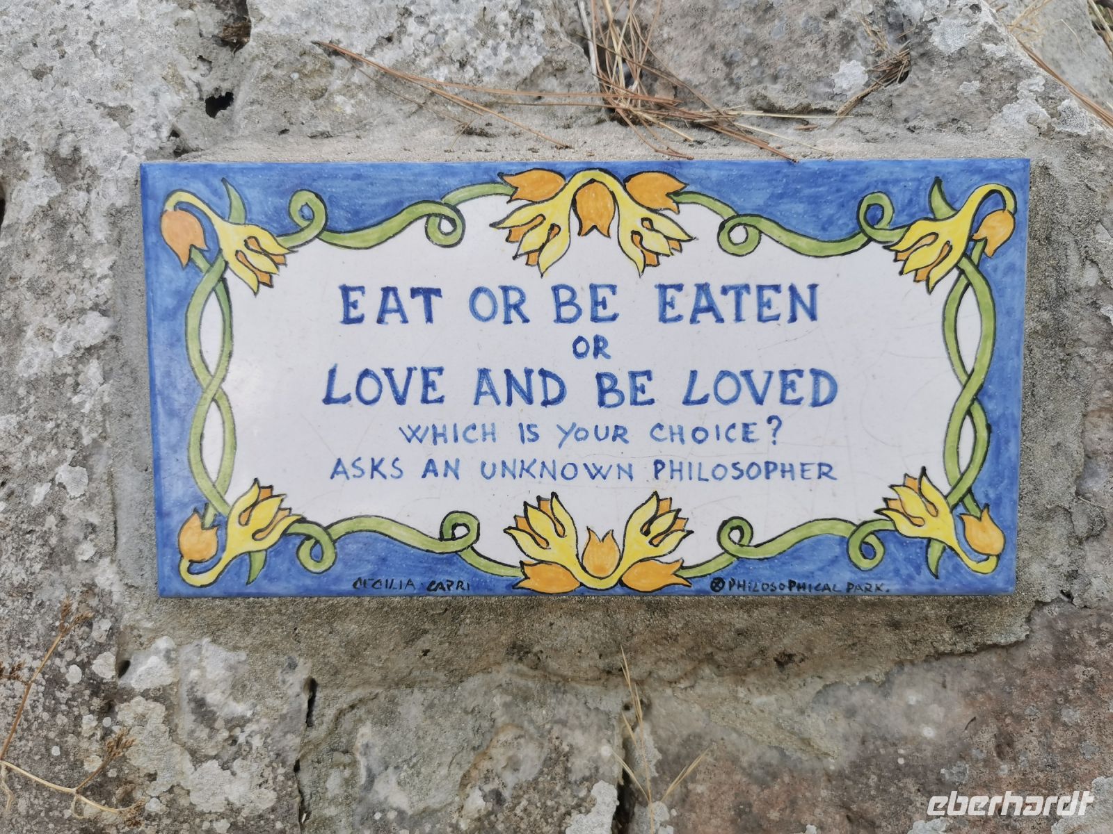 Für die Herkunft des Namens Capri gibt es zwei Möglichkeiten. Capri, kommt von dem Wort Caprese, was übersetzt Ziege bedeutet, aber im griechischen Wildschwein. Und wie wir bereits erfahren haben, wurde die Küstengegend hier in grauer Vorzeit von Römern und Griechen besiedelt. Vielleicht war Capri damals ein Weideort für Ziegen in dem es auch Wildschweine gab. Zur Erinnerung, vielleicht ist es einigen von euch aufgefallen, in den vergangenen Tagen hatten wir auf unseren Wanderungen des öfteren aufgewühltes Gelände gesehen. Diese Spuren stammten von Wildschweinen.