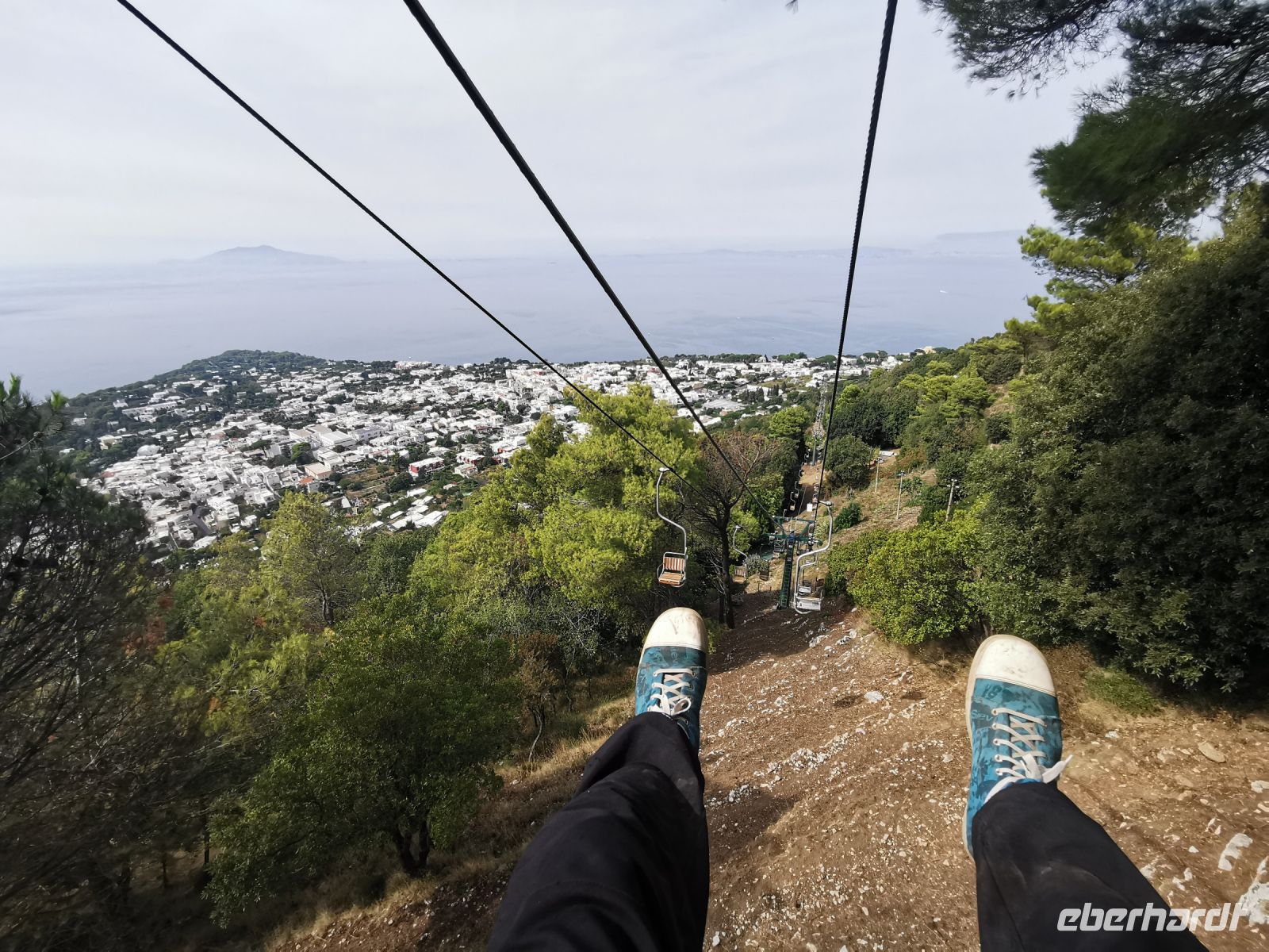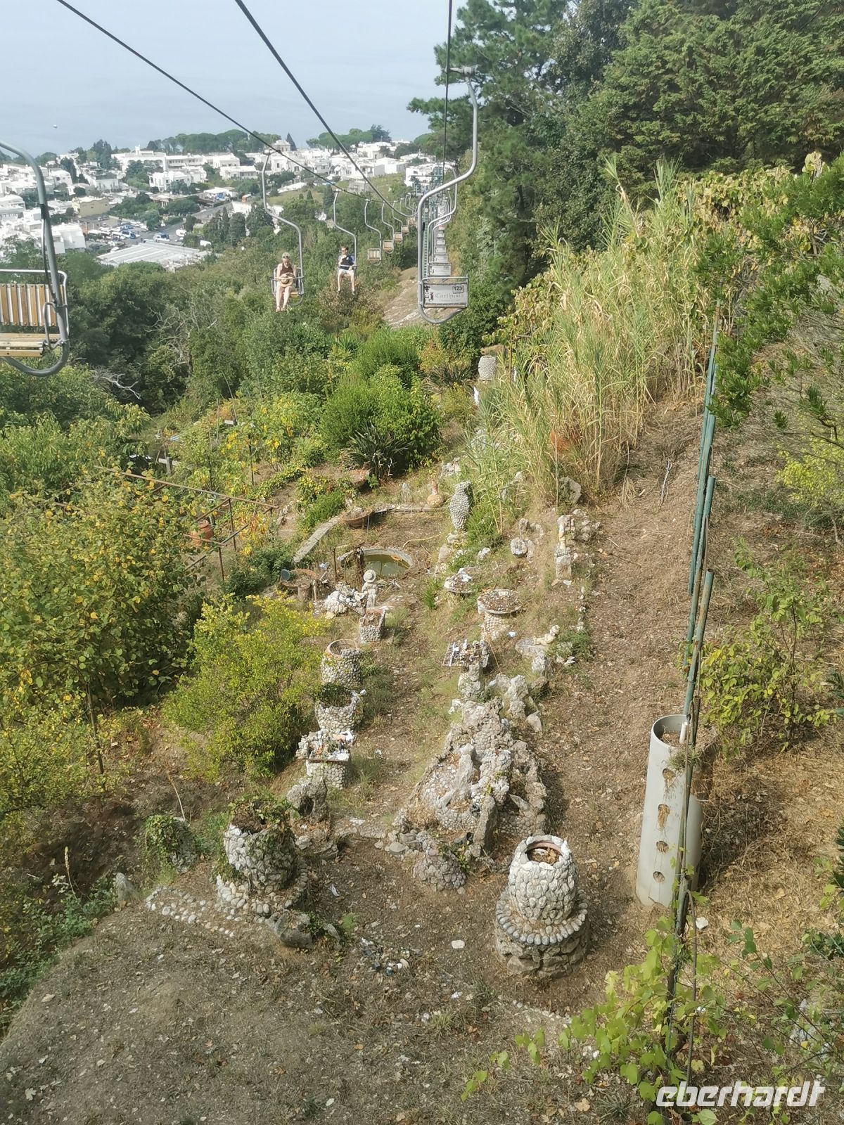 Da wir eine eingeschworene Gemeinschaft waren und jeder jeden half, wurde das Problem ganz schnell gelöst. Kurzerhand beschloss man einstimmig den Sesselift nach unten zu nehmen. "Genug gewandert wurde zur Devise, wir fliegen hinunter und genießen die herrlichen Blicke über die Insel". Gemütlich und ruhig schwebten wir über die Dächer und Gärten hinunter nach Anacapri, die uns Einblicke in den Privatbereich der Insulaner gaben.