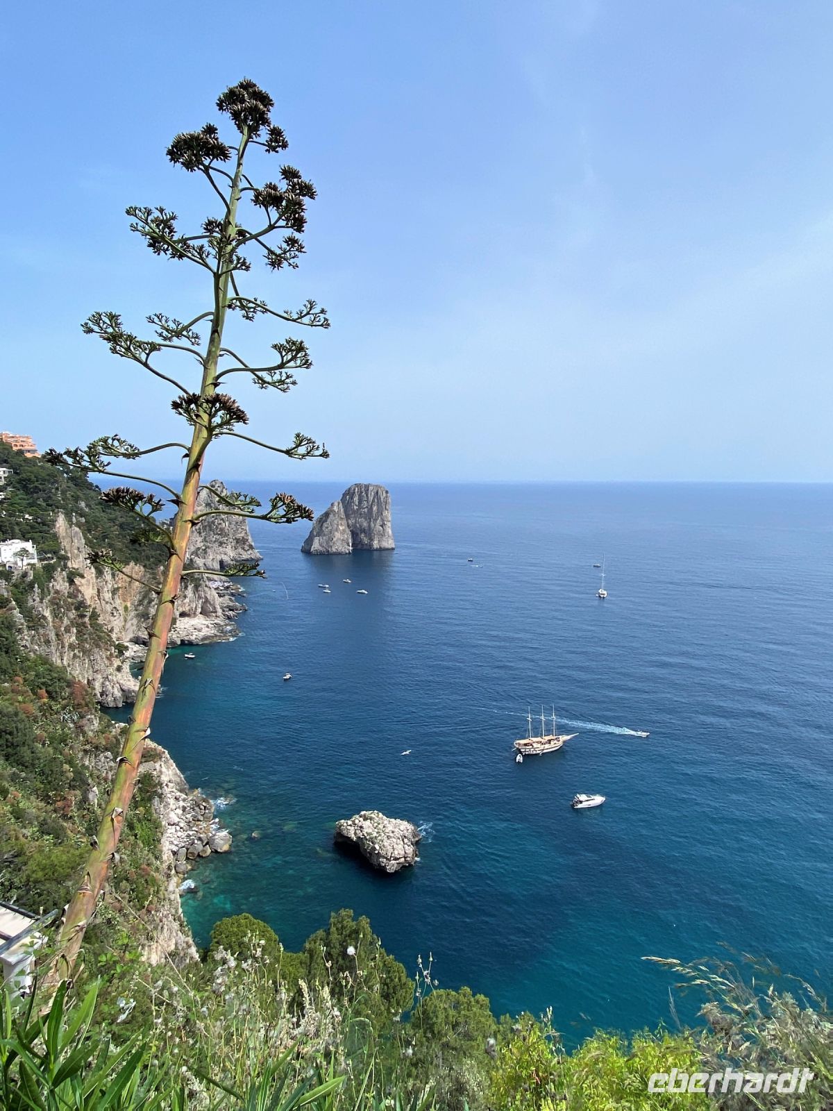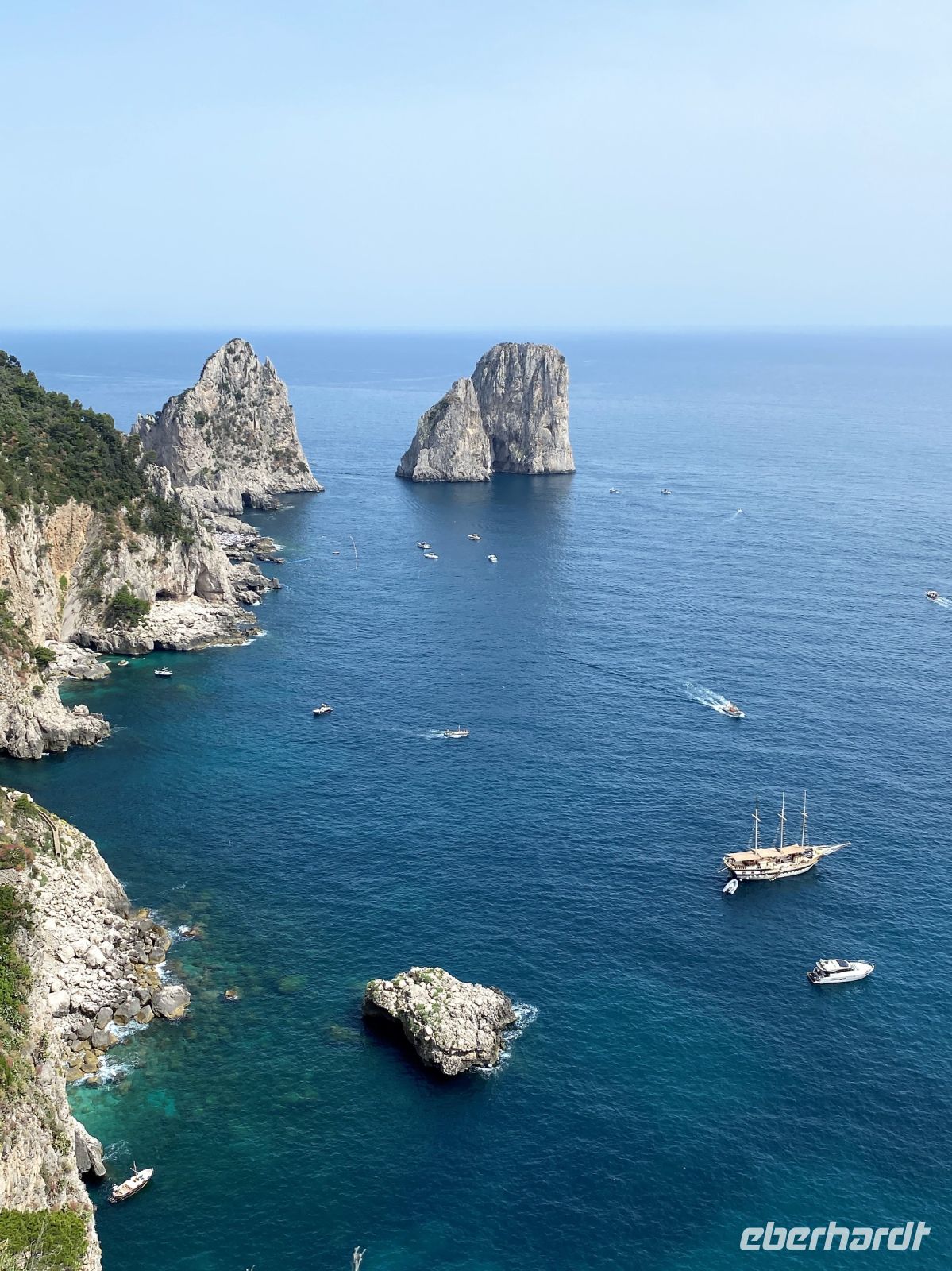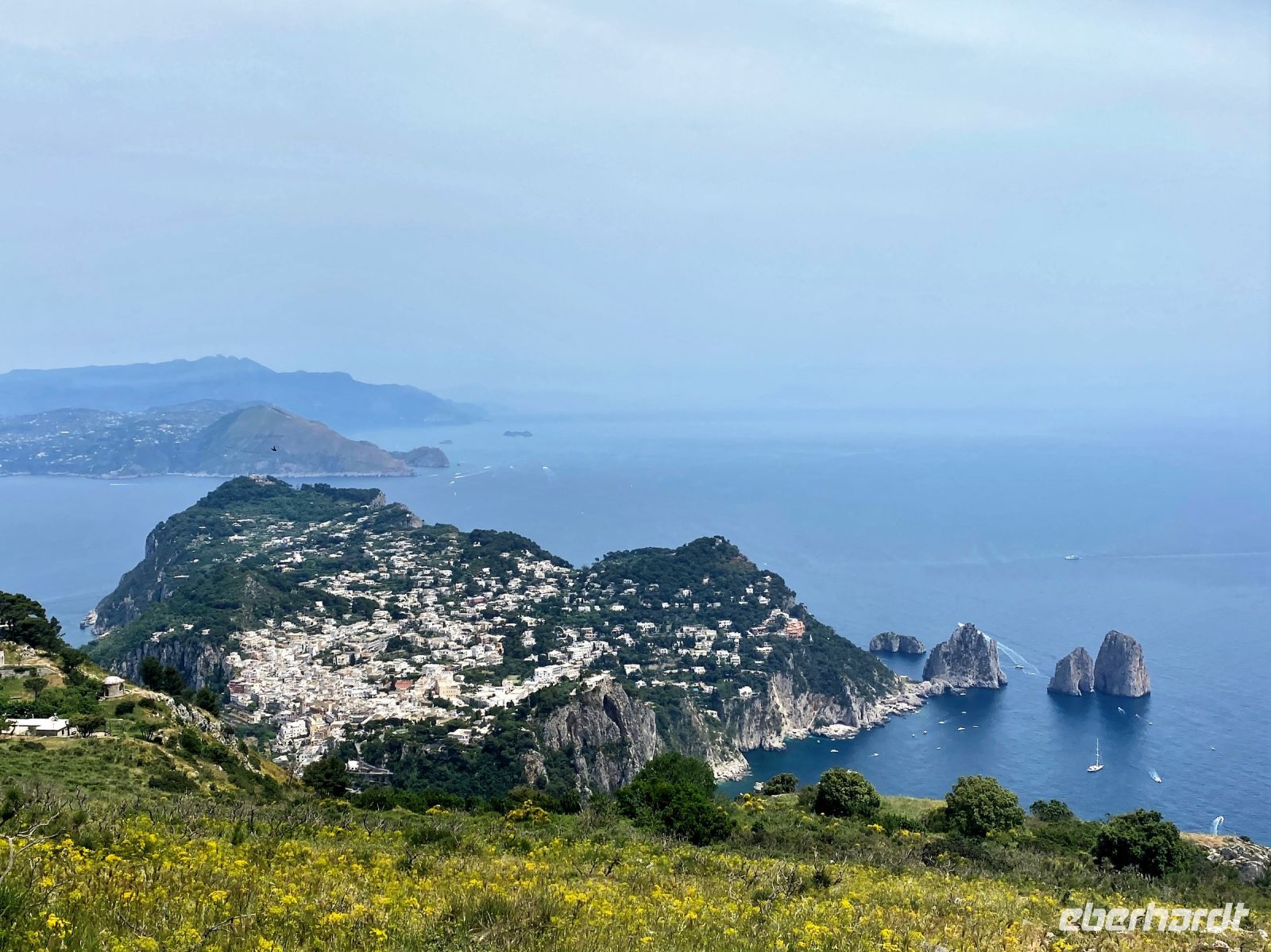 Optisch bildet der Vesuv den Ausgangspunkt im Golf von Neapel. Ein weiterer exponierter Bezugspunkt im Golf ist ohne Frage die vorgelagerte Insel Capri. Die kleine Insel vor der sorrentinischen Halbinsel überrascht als Wandergebiet und darf bei unserer Reise natürlich nicht fehlen. Und so begeben wir uns am Morgen von Minori aus mit dem Boot auf die zweitgrößte Insel im Golf von Neapel. Der Name Capri stammt übrigens vom lateinischen „capraeae“ (Ziegen) und wie bei den meisten griechischen Kolonien gab es auch auf dieser Insel zwei Ansiedlungen, die eine an einer geeigneten Landstelle, die andere auf einer Anhöhe. Aus den ursprünglichen Ansiedlungen sind die heutigen Gemeinden Capri und Anacapri (Oberes Capri) entstanden. Letztere ist unser erstes Ziel. Mit dem Bus machen wir uns vom Hafen in Capri auf und erreichen nur wenige Fahrminuten später Anacapri. Hier erkunden wir die kleine Ortschaft zu Fuß, bevor wir den Monte Solaro, die höchste Erhebung der Insel, besteigen. Nur wenige von uns wählen heute den steilen Weg zu Fuß nach oben. Wer nicht läuft nutzt die Möglichkeit mit dem Sessellift ganz bequem zur Aussichtsterrasse zu kommen. Egal auf welchem Weg wir nach oben kommen, von hier bietet uns sich uns allen ein prachtvoller Rundblick auf die Insel und sowohl auf den Golf von Neapel als auch von Salerno. Der ideale Punkt, um unser kleines Picknick mit Panini, Rotwein und Limoncello zu genießen. Am Nachmittag bringt uns der Bus zurück nach Capri, wo wir den schönen botanische Garten Augusto besuchen und etwas Zeit individuell nutzen, um diese charmante Stadt kennenzulernen, bevor wir am späten Nachmittag die Heimreise mit dem Linienschiff antreten.