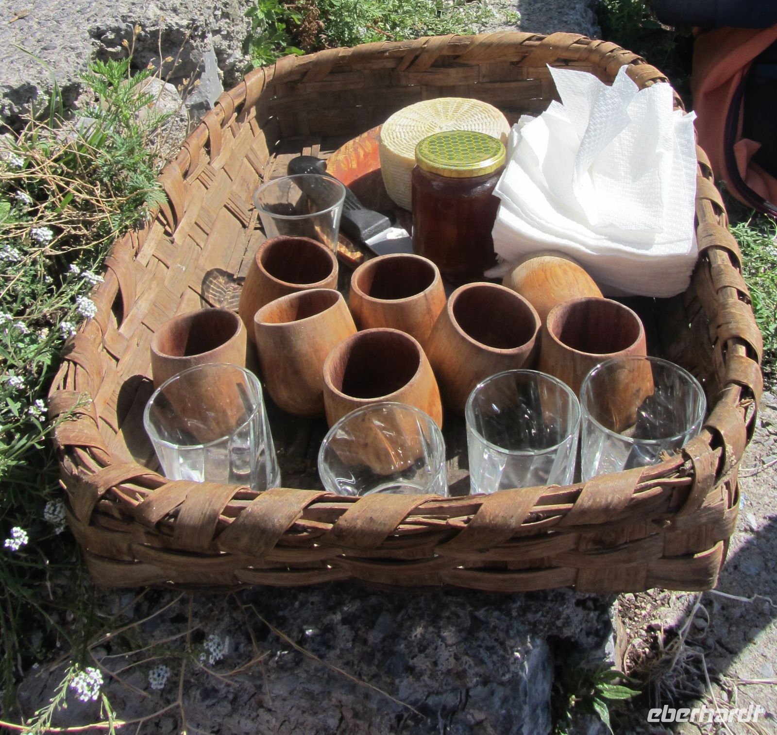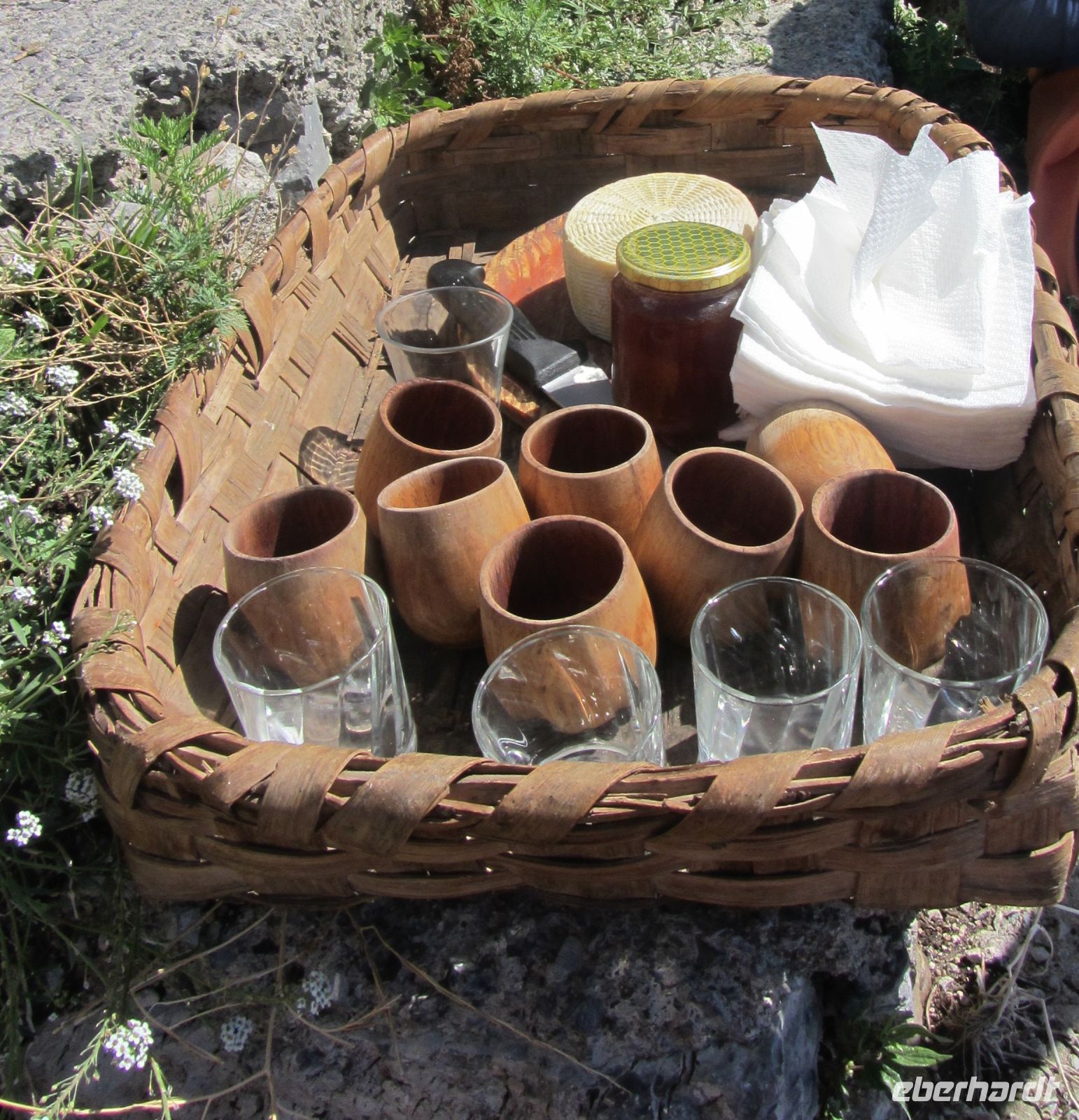 Der Weg ist für alle angenehm zu gehen, oft im Schatten, an einem kleinen Flußlauf entlang, den wir dann auch überqueren. Voher werden noch schnell die Füße gekühlt und die Flaschen an der Quelle gefüllt, eine Wohltat.