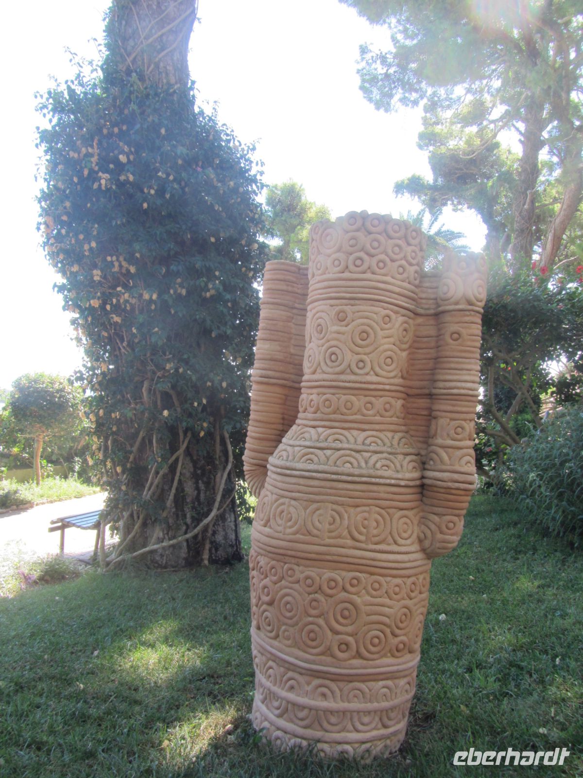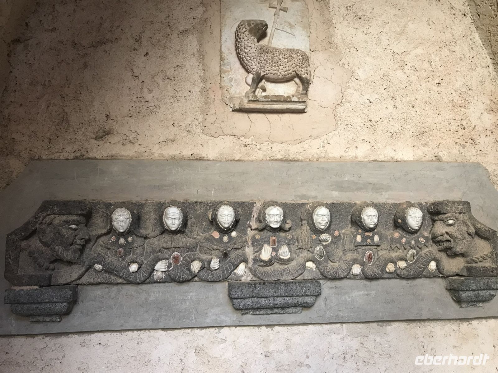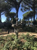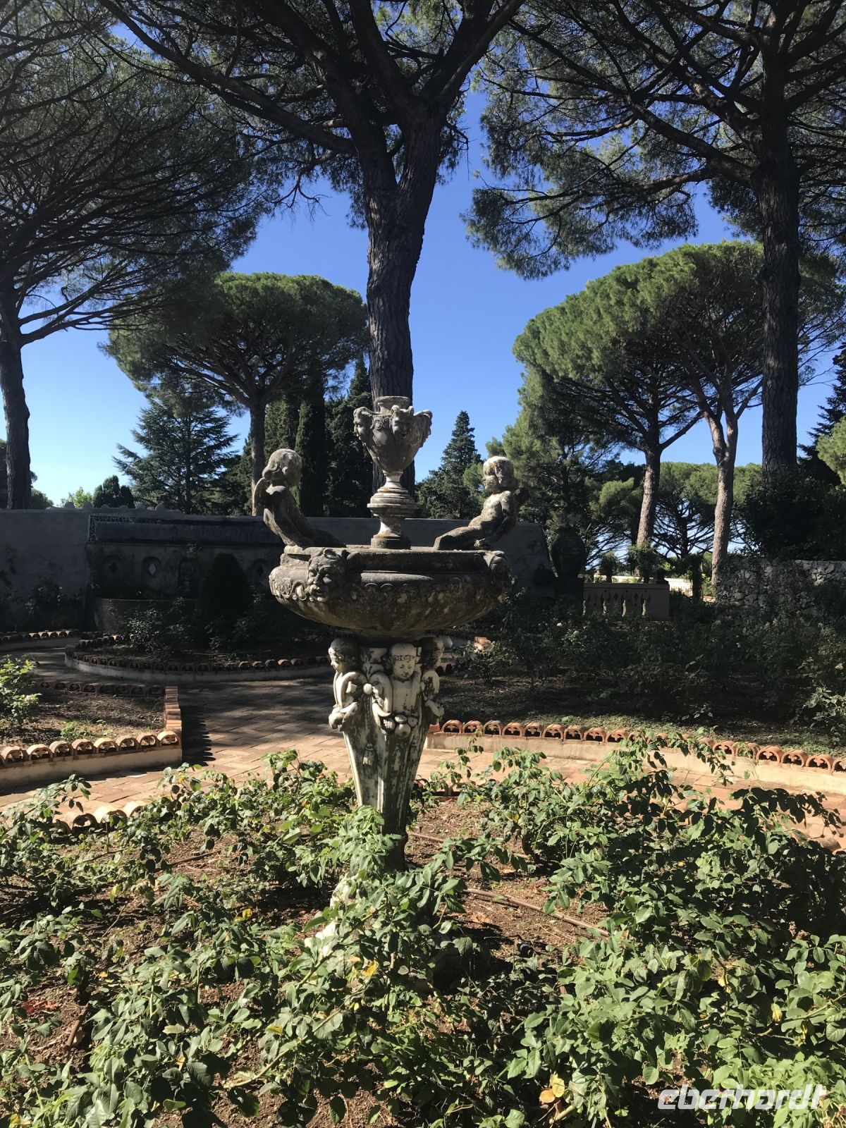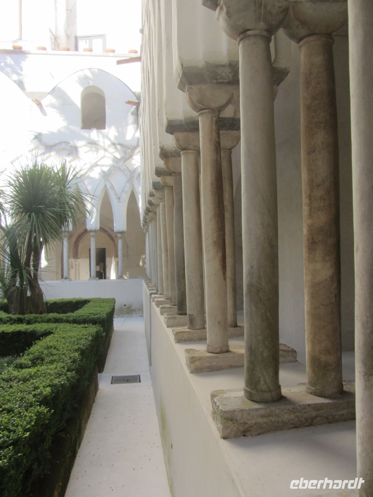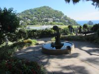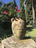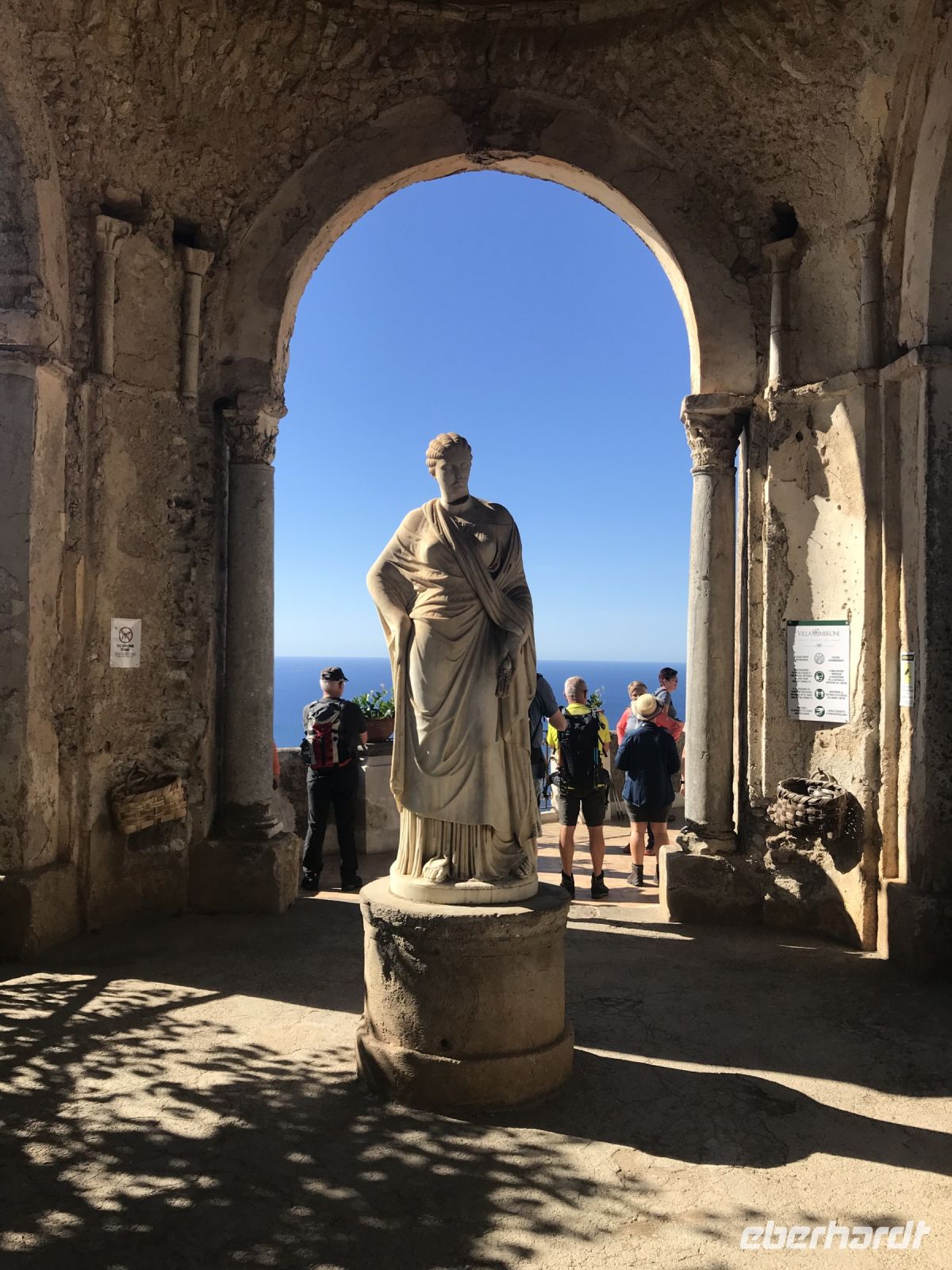 Beim Anreisetag hingen uns die Wandersteifel schwer an den Füßen. Jetzt kommen sie endlich zum Einsatz. Nachdem sich unser kleiner Bus bis ins entzückende Ravello die Kurven hoch geschraubt hat, schalten wir auf den Wandermodus um. Vorbei an dem ungenutzten Festspielhaus von Oskar Niemeyer, das architektonisch gelungenen aber akustisch mißraten ist, geht es aufwärts vorbei an der berühmten Villa Rufolo und weiter zur nicht weniger eindrucksvollen Villa Cimbone. Hier hat einst ein exzentrischer Millionär seine Träume ausgelebt und aus der Ruine eines Palazzos aus dem 14. Jahrhundert ein neues Haus und drum herum einen Landschaftsgarten entstehen lassen. Statuen, Brunnen und dickbauchige Amphoren schmücken den Garten. Den Rosen fehlt etwas gärtnerische Pflege und Fürsorge, den wunderbaren Ausblicken auf das Meer über die ausladenden Schirmpinien hinweg tut das keinen Abbruch. An der Darstellung der sieben Todsünden müssen wir feststellen, dass wir keinesfalls ganz frei von Sünde sind, ein bisschen Faulheit, ein wenig Neid, müssen wir zugeben.