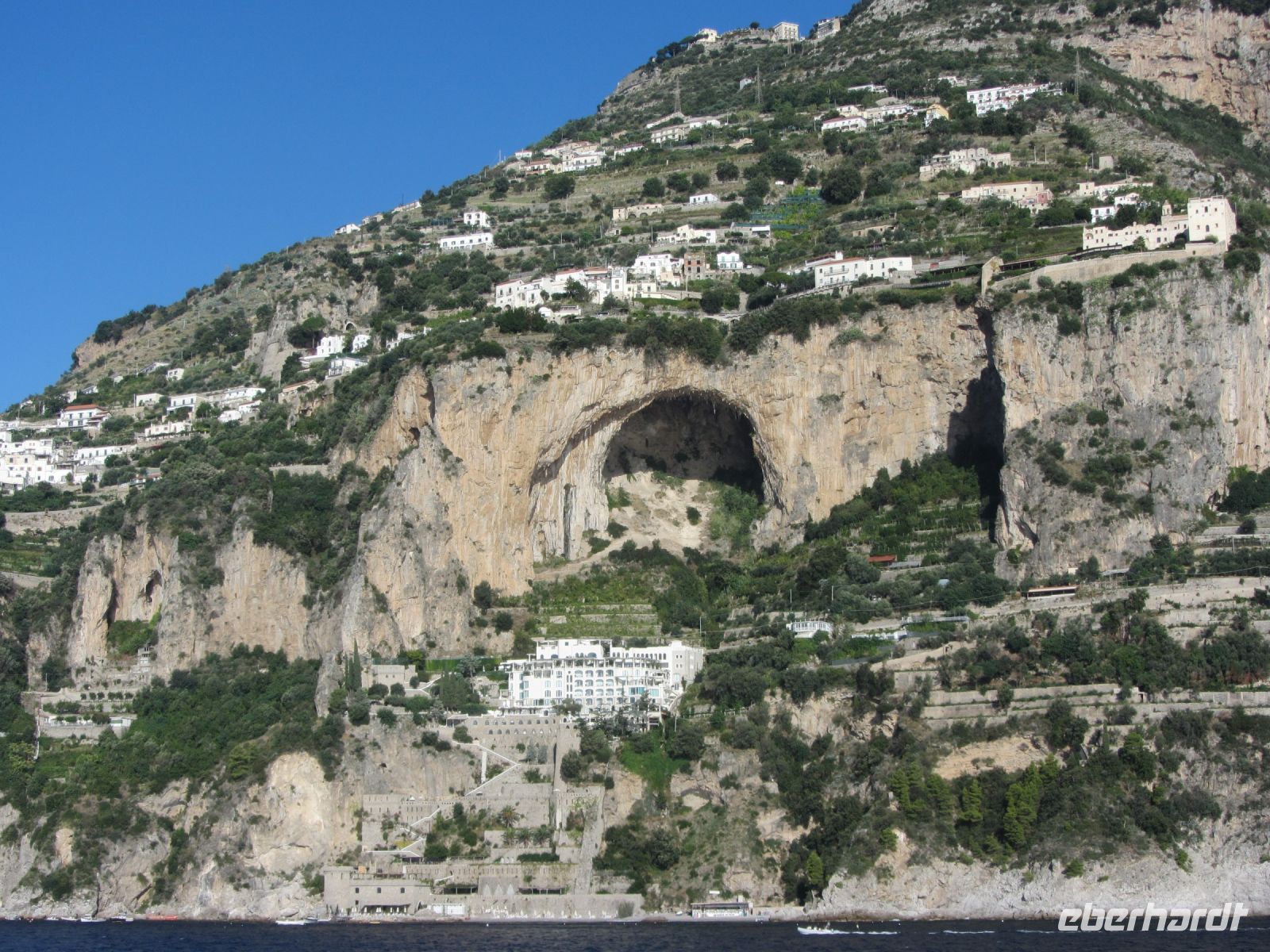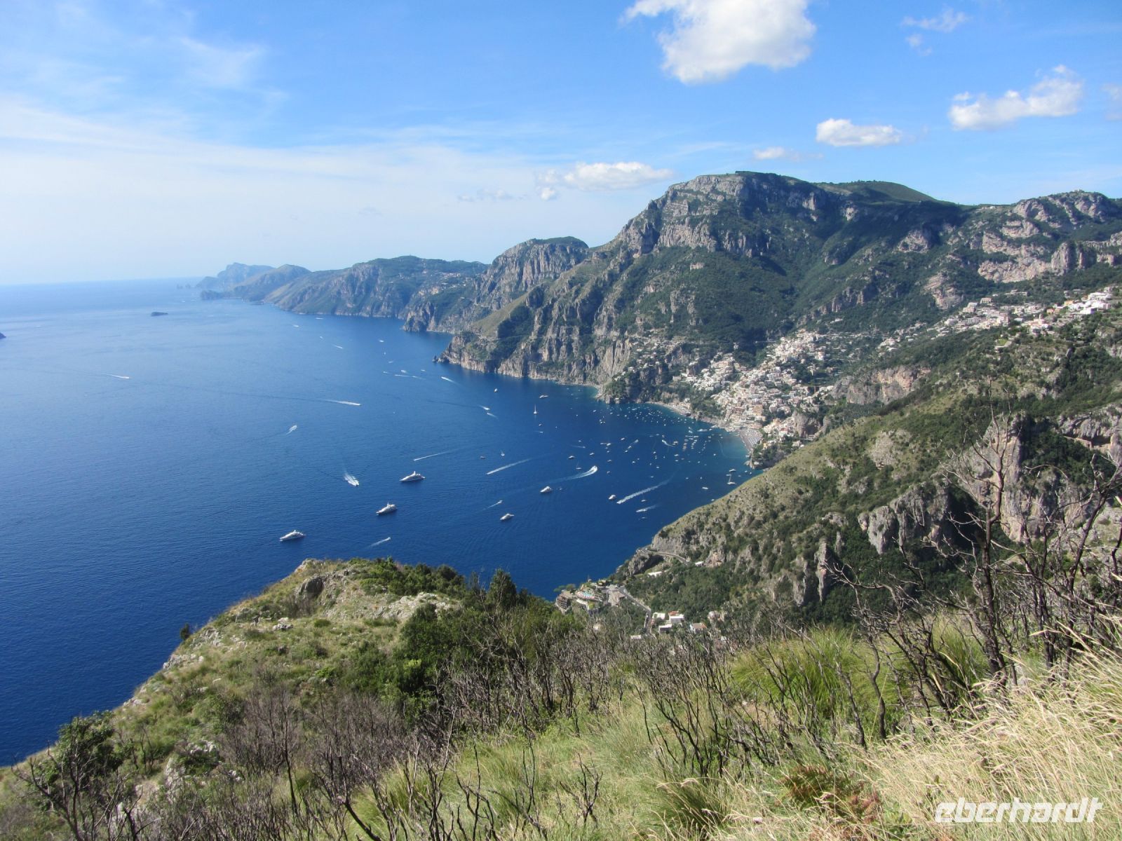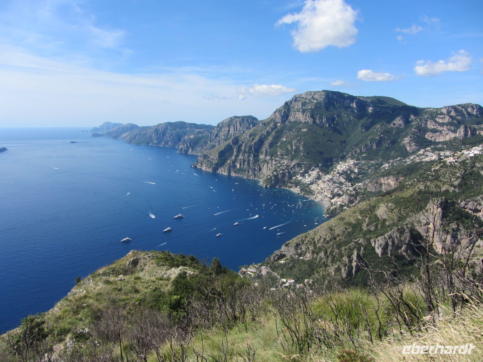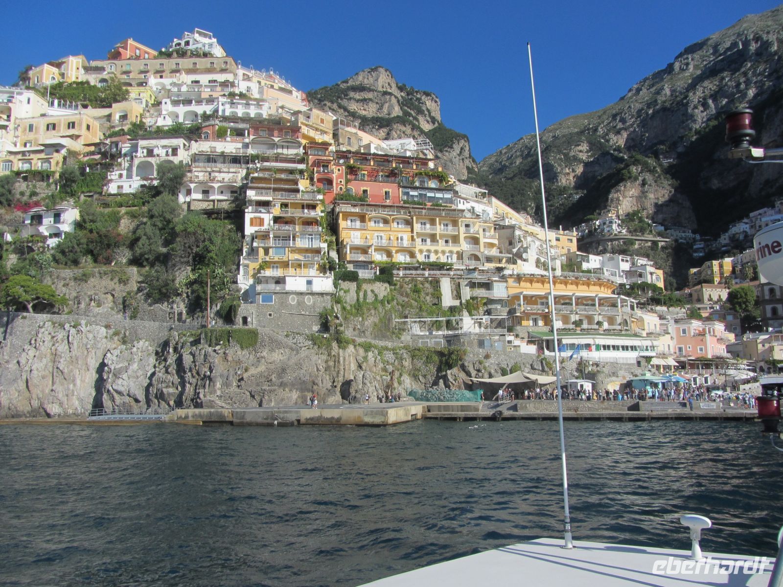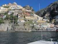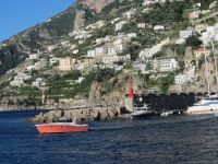 Für einige ist hier die Wanderstrecke zu Ende, Knie und Hüften schmerzen und wir sind dankbar, dass es einen Bus nach Positano gibt. Allerdings ist die Faht hinunter kein Vergnügen. Wie die Ölsardinen stecken wir in dem Bus. Der Fahrer hat schlechte Laune und läßt uns das in jeder Kurve spüren und die engen Straßen mit Gegenverkehr tragen nicht zur Entspannung bei. Schließlich sind wir unten in Positano. Früher war der Ort, der sich vertikal den Hang hinaufzieht, als billiges Winterquartier von armen Schriftstellern und Malern geschätzt. Nach einer von John Steinbeck verfassten Lobeshymne auf Positano entdeckten die Reichen und Schönen dieser Welt den Ort für sich. Jackie Kennedy, Pablo Picasso und Paul Newman kamen ebenso wie Altkanzler Gerhard Schröder und Leonardo di Caprio. Der russische Tanzstar Rudolf Nurejew kaufte die kleinen vor Positano liegenden Inseln i Gialli. Hier sollen nach der Mythologie die Sirenen gesessen haben, die mit ihrem lieblichen Gesang die Seefahrer ins Verderben stürzten. heute lauert das verderben möglicherweise in den edlen Geschäften, die die Gassen säumen, Man schiebt sich an teuren Cafes und Restaurants entlang und es geht ums Sehen und Gesehen werden. Wir sind durchaus froh, als unser Boot im Hafen Einfahrt hat und wir entlang der Küste zurück ins unspektakuläre und ruhige