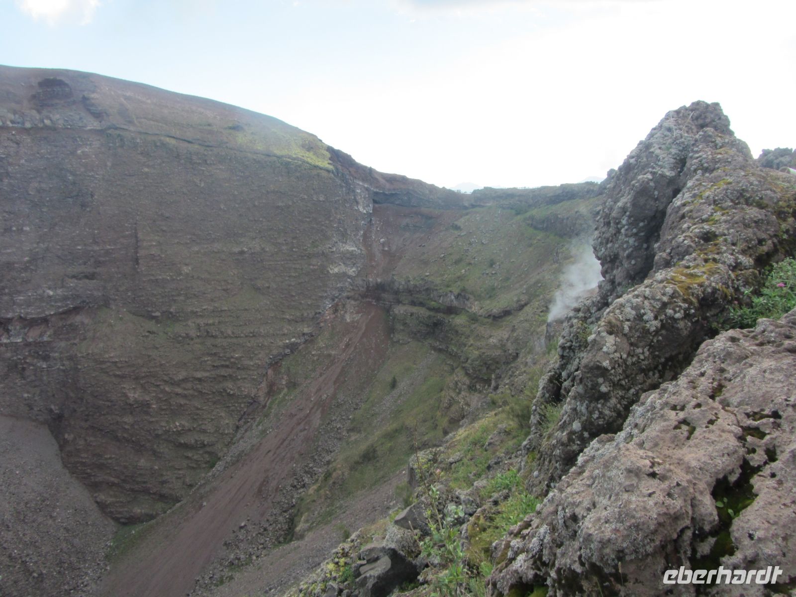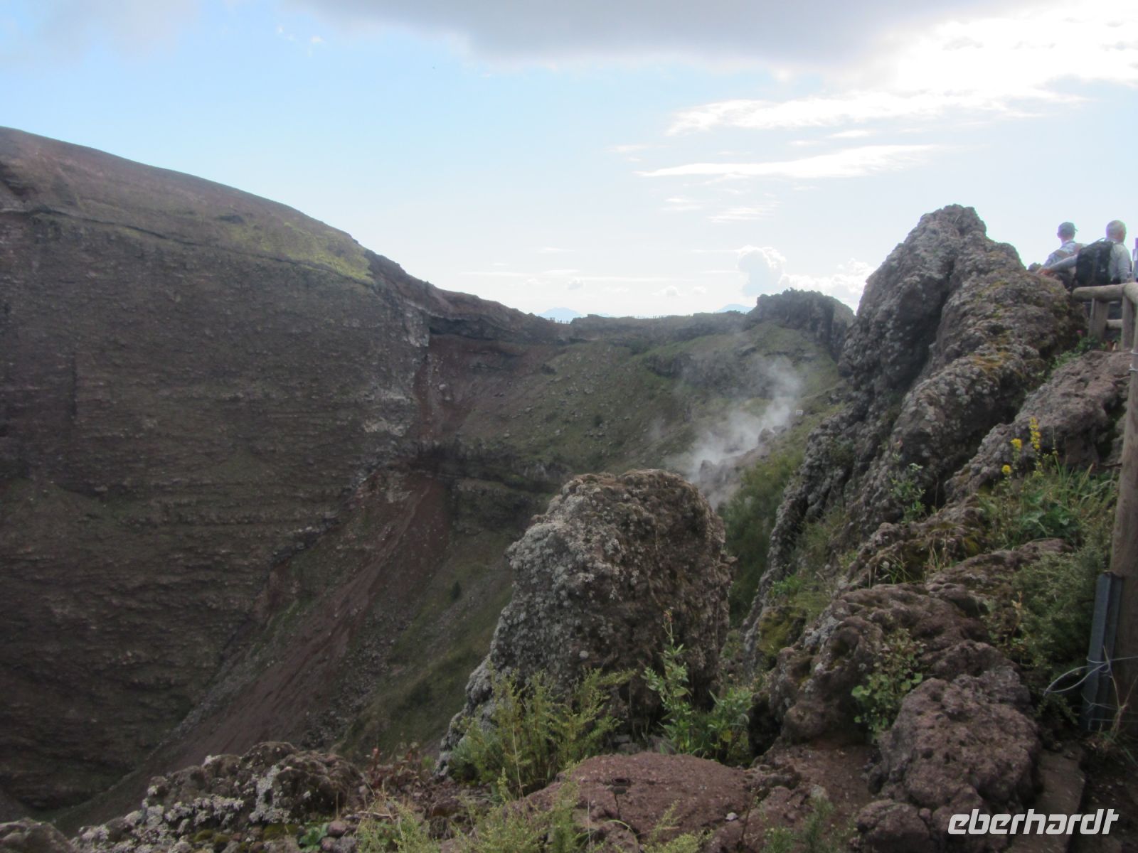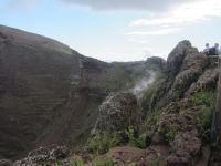 Bei der Ankunft in Neapel hatten wir schon einen ersten Blick auf den Somma geworfen, den Berg, aus dem nach dem berühmten Vulkanausbruch im Jahr 79 nach Christus der Vesuvio als neuer Gipfel entstanden ist. Vor dem berühmten Ausbruch war der Berg sicherlich noch sehr viel höher, heute misst er immerhin 1281 Meter. Der Aufstieg schreckt uns nicht - problematischer ist die Tatsache, dass es keine Zeit und keine Möglichkeiten für eine Toilettenpause gibt. Am Kraterrand, von wo es etwa 200 Meter in die Tiefe geht, weist uns Antonio, ein Vulkanologe,auf all die Dinge hin, die wir sehen, aber nicht auf den ersten Blick verstehen. Dank seiner Erläuterungen können wir die rostigen eisernen Seile der beim letzten Ausbruch 1944 zerstörten Seilbahn identifizieren. Antonio liefert uns den Text von dem berühmten Schlager über funiculi funicola gleich dazu. Auch die Rauchzeichen, die der Vesuv von sich gibt, faszinieren. Doch es ist unbestritten, sowohl die in der Ferne liegenden phlegräischen Felder als auch der Vesuv gleichen einer tickenden Zeitbombe und die Gefahr eines Ausbruchs ist nicht von der Hand zu weisen.