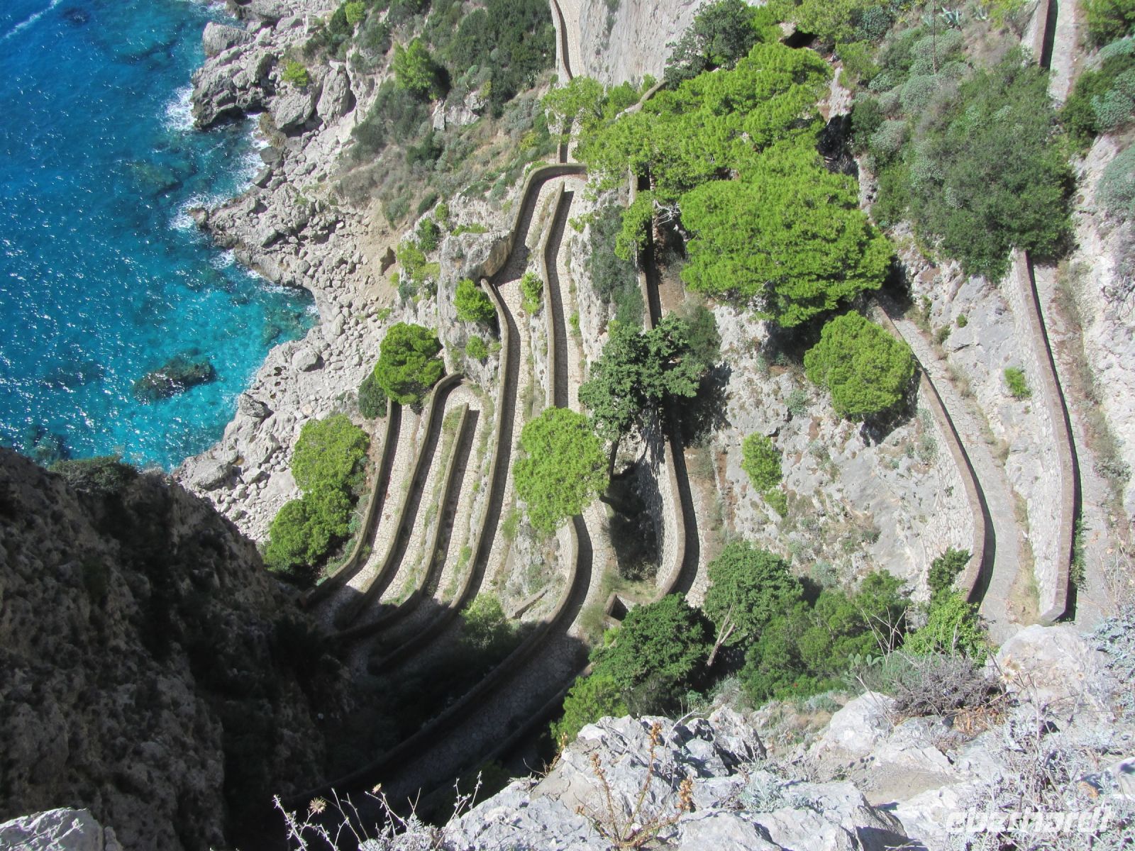 Capri, ach ja. Genau genommen sind es zwei Inseln, nämlich Capri und Anacapri und in der Mitte thtont der Monte Solaro als höchster Berg mit einer Höhe von 589 Metern. Eine Seilbahn führt hinauf, doch Andrea geht auf schmalen, steilen Wegen, für die man gute Trittsicherheit und eine Portion Mut braucht. Die andere Gruppe fährt mit der Standseilbahn nach oben, flaniert durch Capri an den Läden entlang, genießt den Blick vom Augustusgarten auf die Via Krupp, die um 1900 gebaut wurde und geht dann im Spazierschritt bis zur Villa Tiberius. Von der hohen Felskante in luftiger Höhe soll Tiberius seine Sklaven hinuntergestürzt haben, wenn sie ihm nicht gehorchten. Er hatte sich auf diese Ziegeninsel im Golf von Neapel zurückgezogen um - so jedenfalls wird es berichtet- hier ungestört seinen Lüsten und Ausschweifungen frönen zu können.
