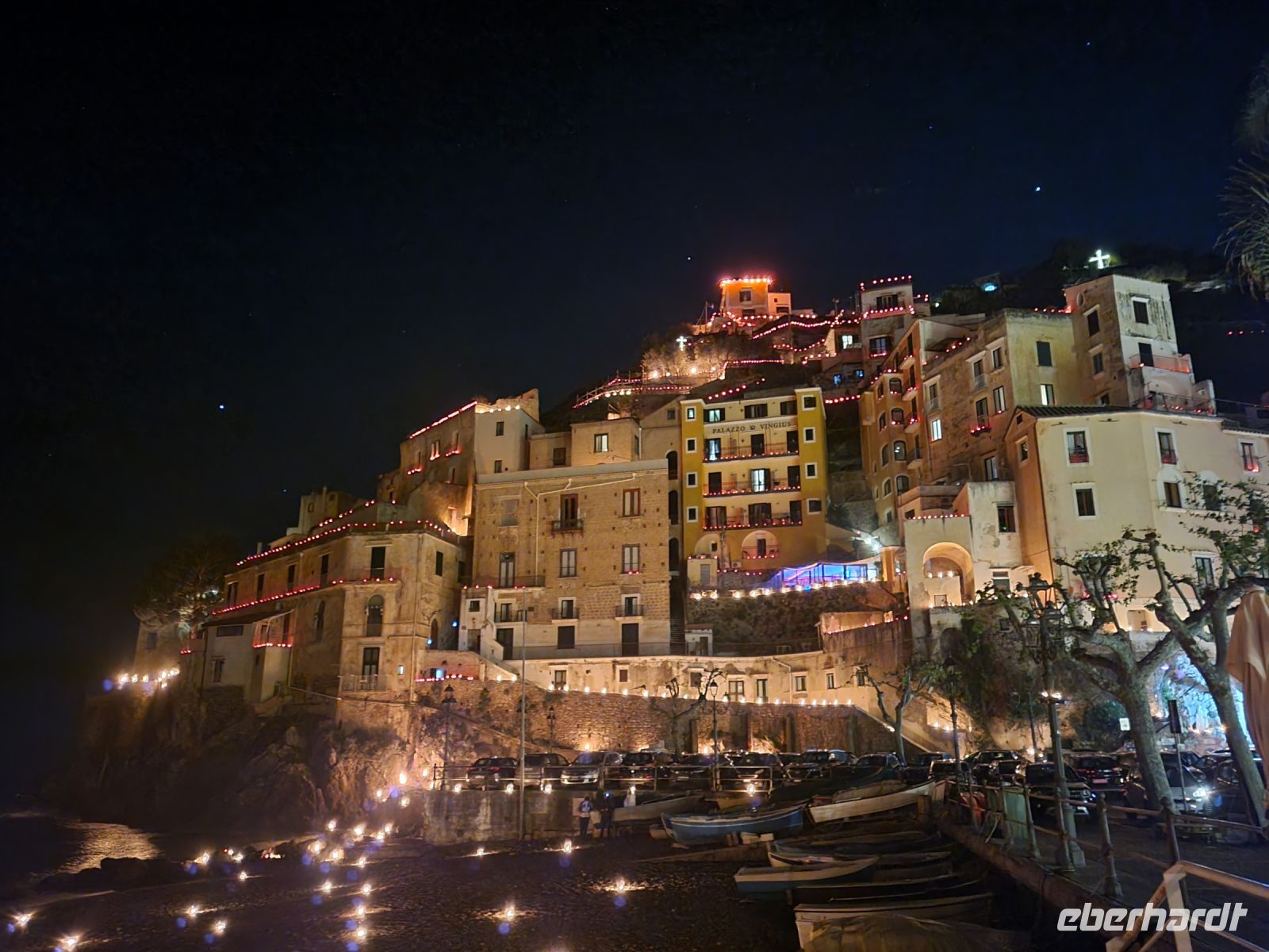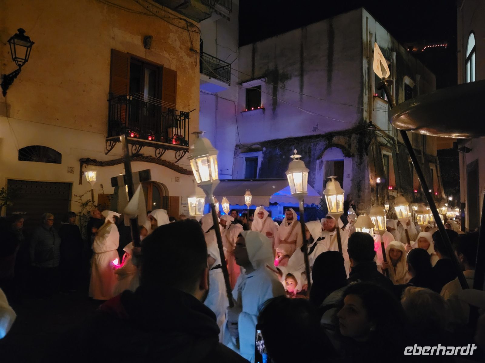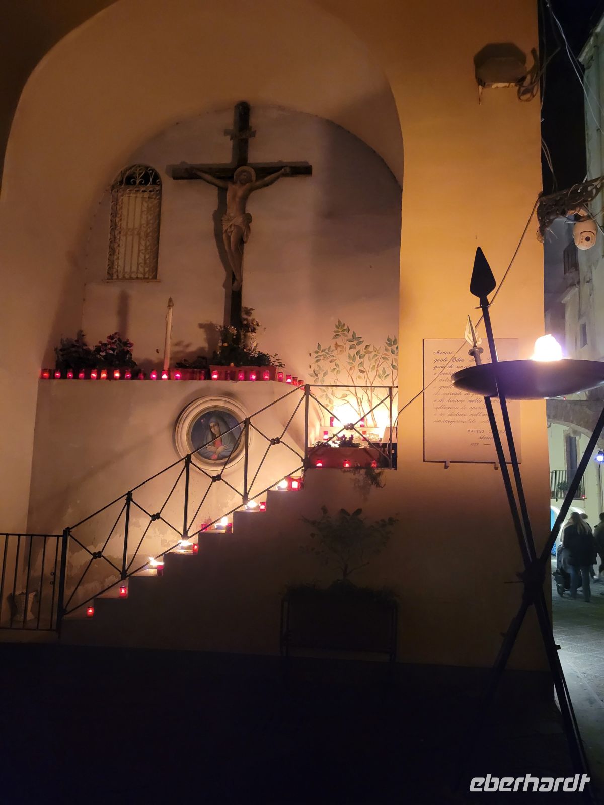 Anschließend begeben wir uns zur abendlichen Karfreitagsprozession, die an der Kirche von Minori startet und durch den Ort führt. Die elektrischen Leuchten sind fast überall ausgeschaltet. Am Strand, an den seitlichen Hängen, die die Bucht rahmen, und an den Häuserfronten im Ort – in Fenstern, auf Balkonen und Terrassen – brennen Kerzen. All das erzeugt eine ganz besondere Kulisse und ergreifende Atmosphäre, die wir bestimmt nicht vergessen werden.