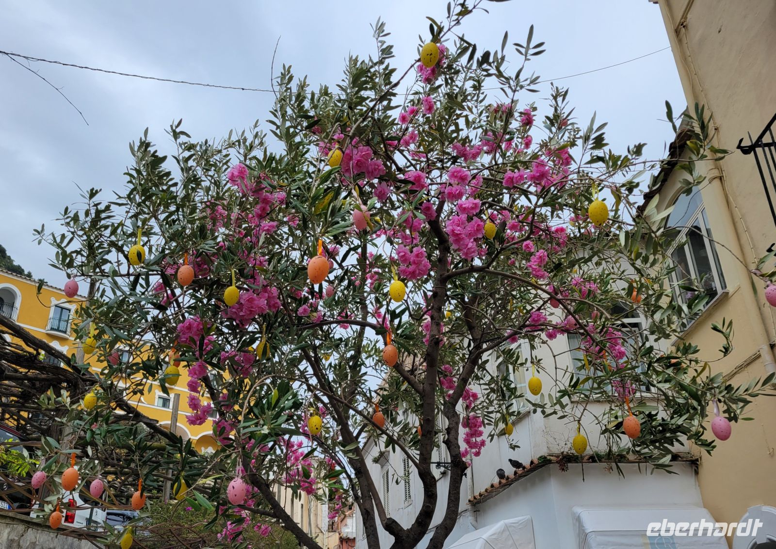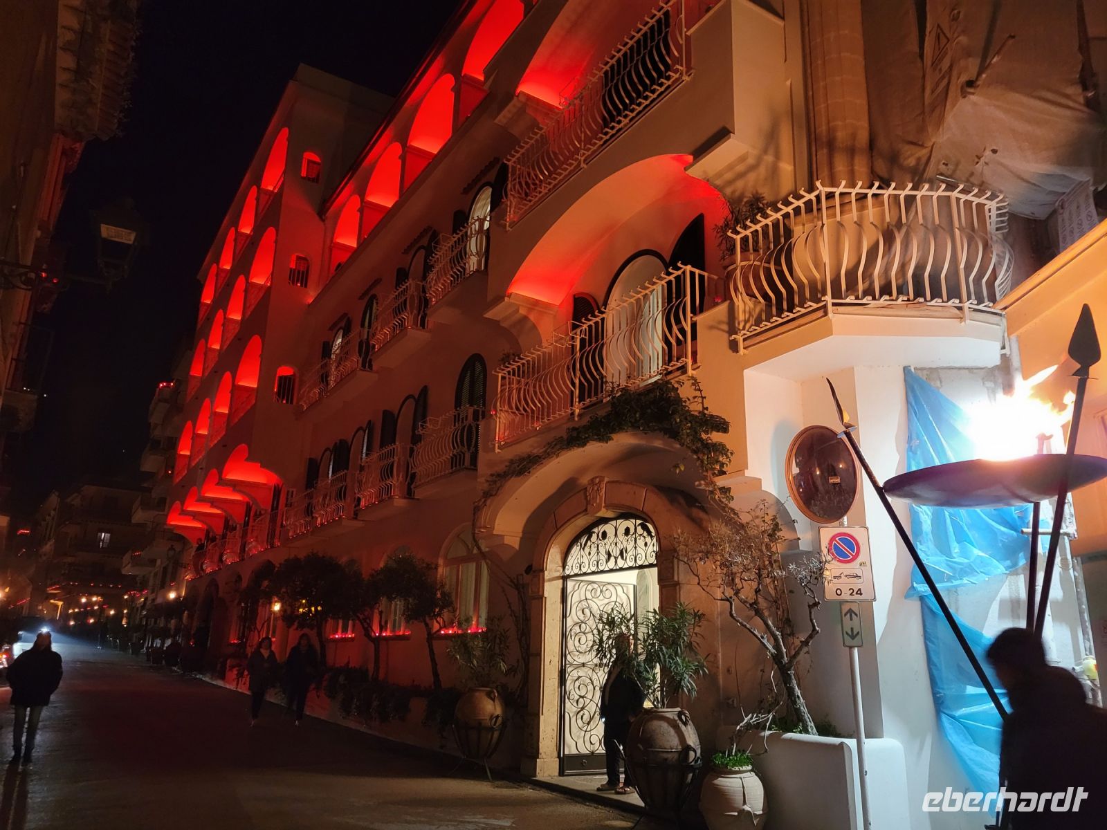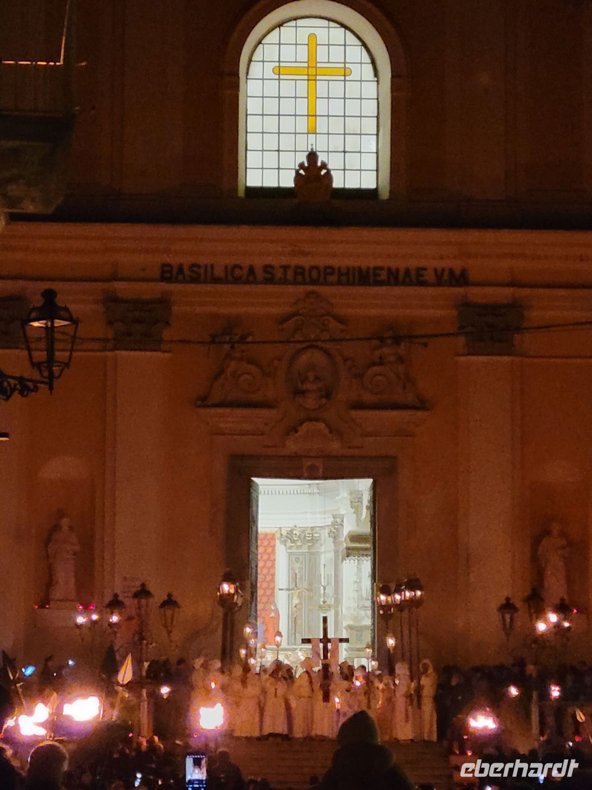 Anschließend begeben wir uns zur abendlichen Karfreitagsprozession, die an der Kirche von Minori startet und durch den Ort führt. Die elektrischen Leuchten sind fast überall ausgeschaltet. Am Strand, an den seitlichen Hängen, die die Bucht rahmen, und an den Häuserfronten im Ort – in Fenstern, auf Balkonen und Terrassen – brennen Kerzen. All das erzeugt eine ganz besondere Kulisse und ergreifende Atmosphäre, die wir bestimmt nicht vergessen werden.