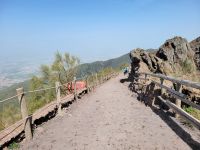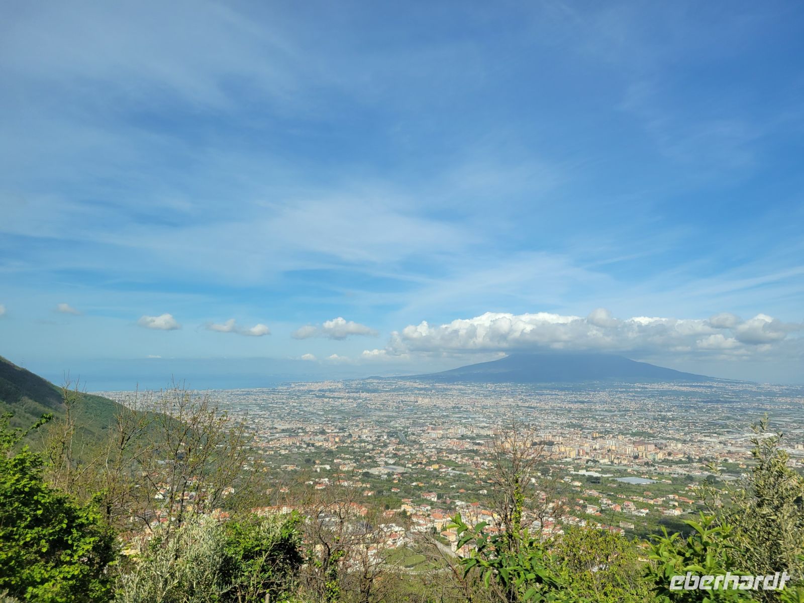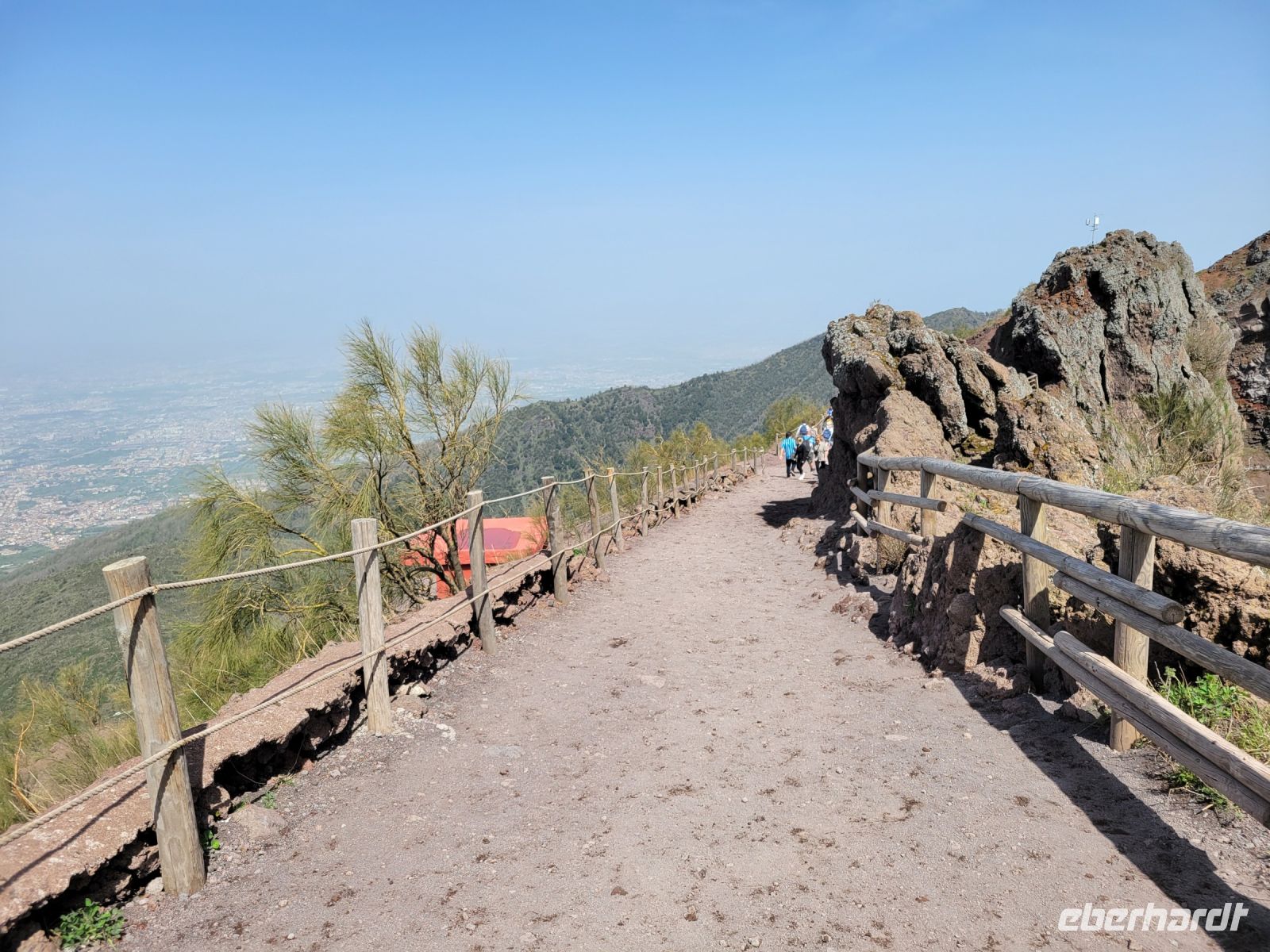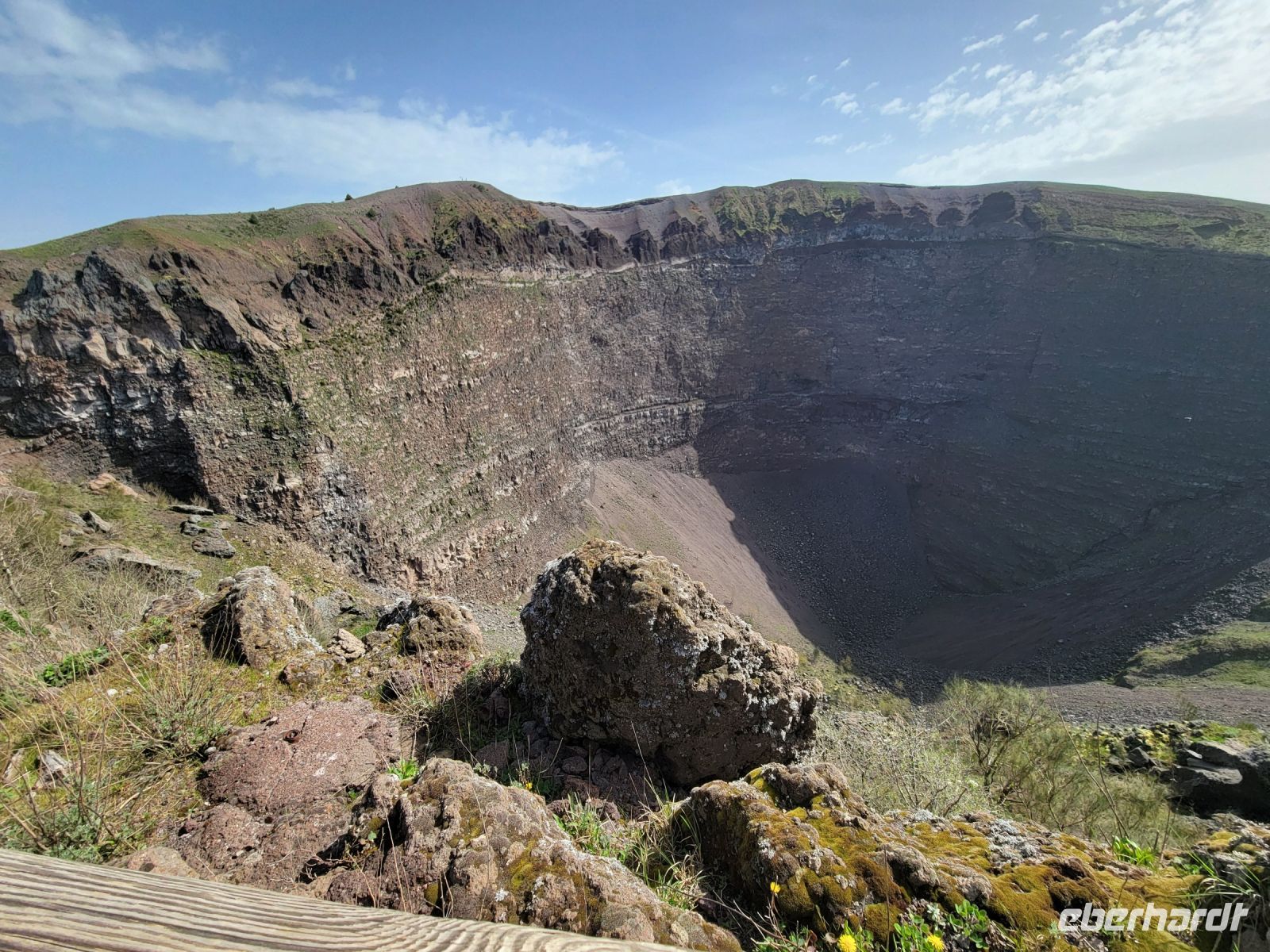 Da es Zeitfenster für den Einlass gibt, beginnen wir – unter blauem Himmel und Sonnenschein – gleich mit dem Aufstieg zum Krater, jede im eigenen Tempo. Oben angekommen erwartet uns ein Vulkanologe, der uns weitere Informationen gibt. Anschließend nutzen wir die freie Zeit, um den „Gran Cono“, den großen Krater, mit einem Durchmesser von etwa 54 Metern, aus anderer Perspektive zu bestaunen und die Ausblicke über die Landschaft, die Stadt Neapel, den Golf von Neapel mit einer Sicht bis Capri und der Landzunge der Sorrentinischen Halbinsel zu genießen und auf zahlreiche Fotos zu bannen. Auch Pompeji kann zu Füßen des Vesuvs erahnt werden.