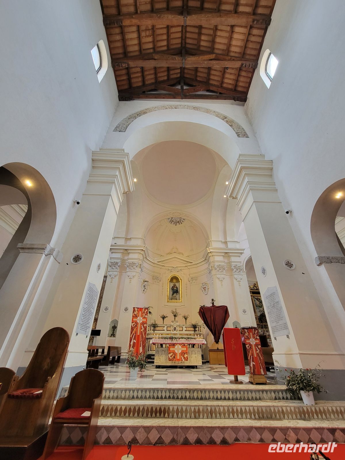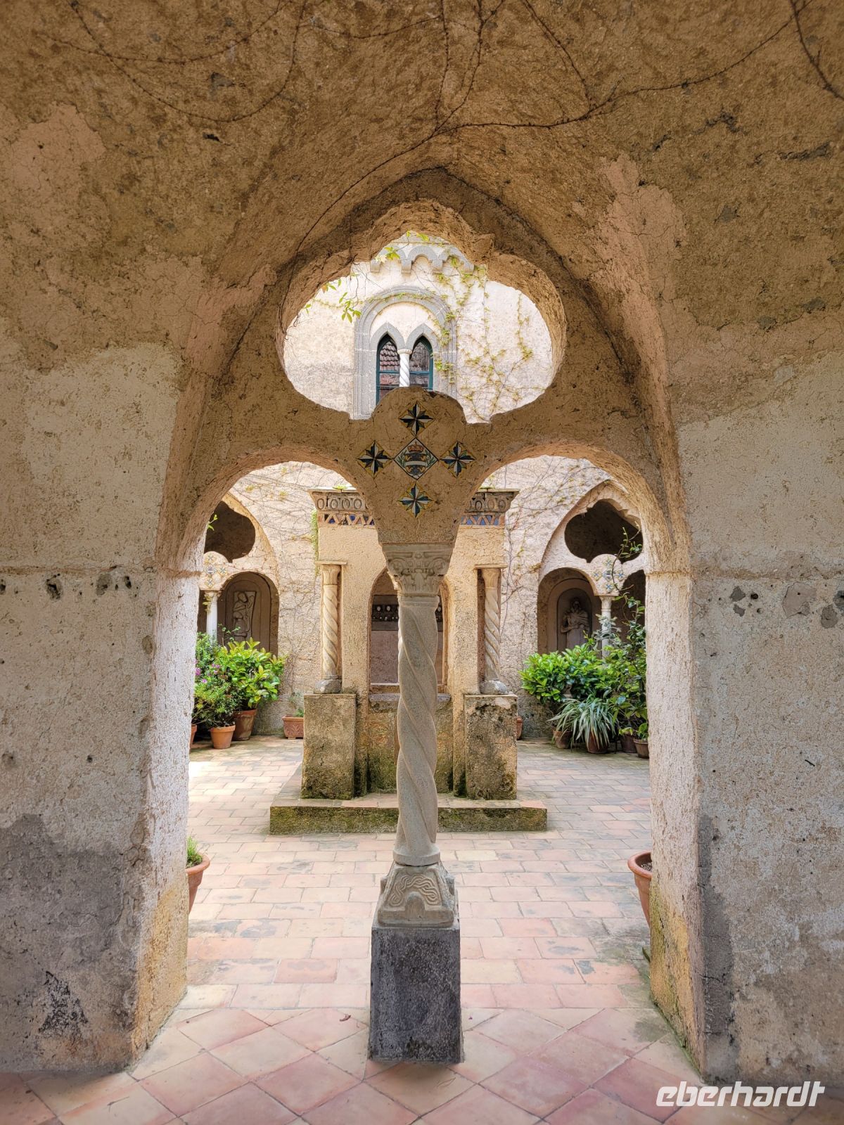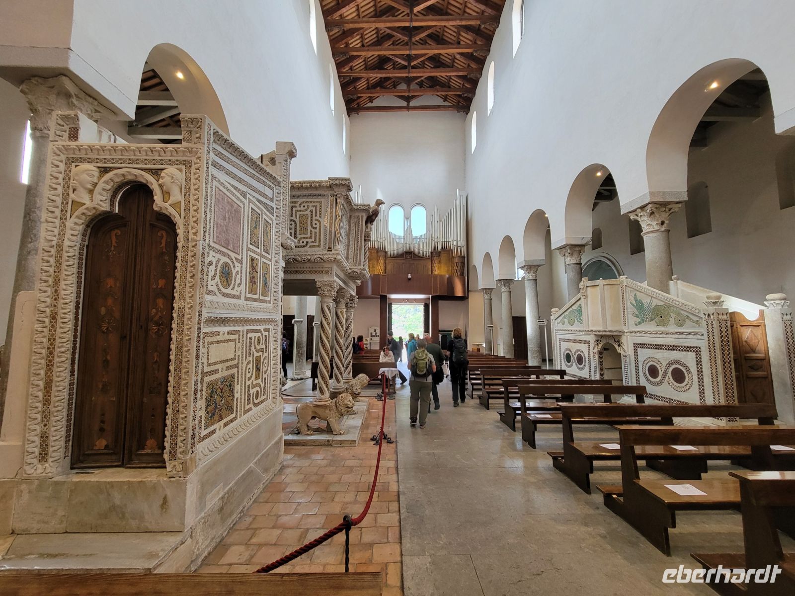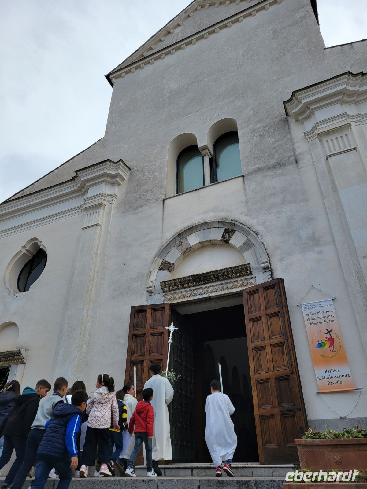 In Ravello angekommen, spazieren wir zunächst zur hübschen Piazzetta und statten dem Dom von Ravello einen Besuch ab. Hier fallen besonders die reichverzierten Marmorkanzeln auf. Dann plötzlich setzt die Orgel ein und berührt uns sehr mit ihrem Klang. Der Gottesdienst beginnt bald und eine Prozession von Kirchgängern in Beglei-tung von Geistlichen ziehen in den Dom ein.