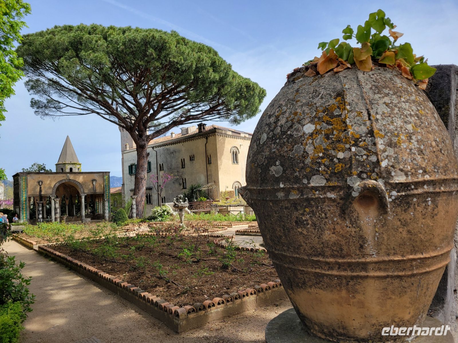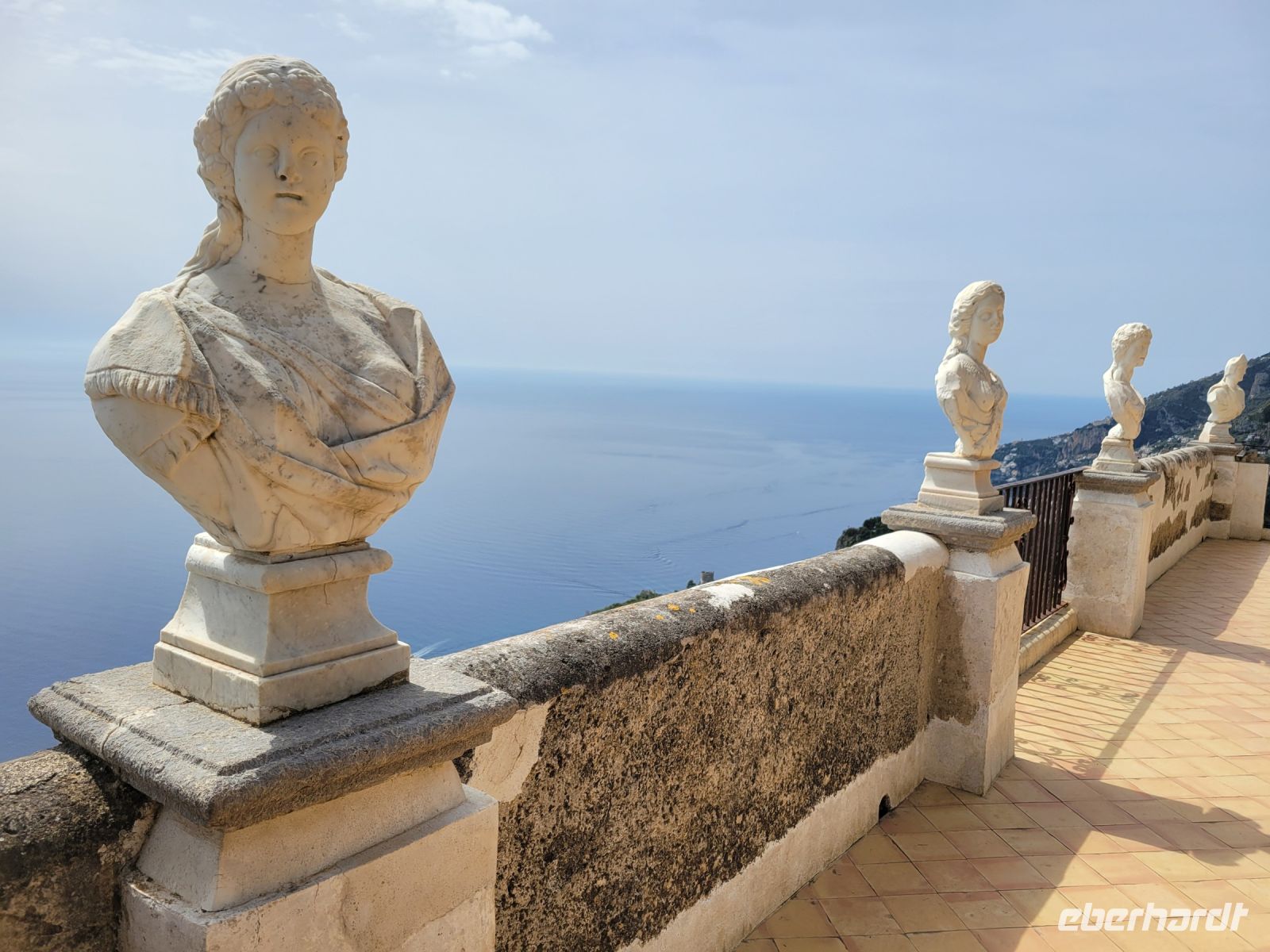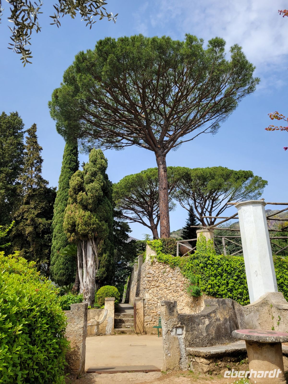 In der Villa Cimbrone angekommen geht es vorbei am eindrucksvollen Palast durch das Parkgelände bis zur „Terrasse der Unendlichkeit“. Wir können uns nicht sattsehen an den üppigen Pflanzen im Park – insbesondere die Schirmpinien haben es uns angetan – und den sich öffnenden Panoramablicken über die Amalfiküste und das Meer.