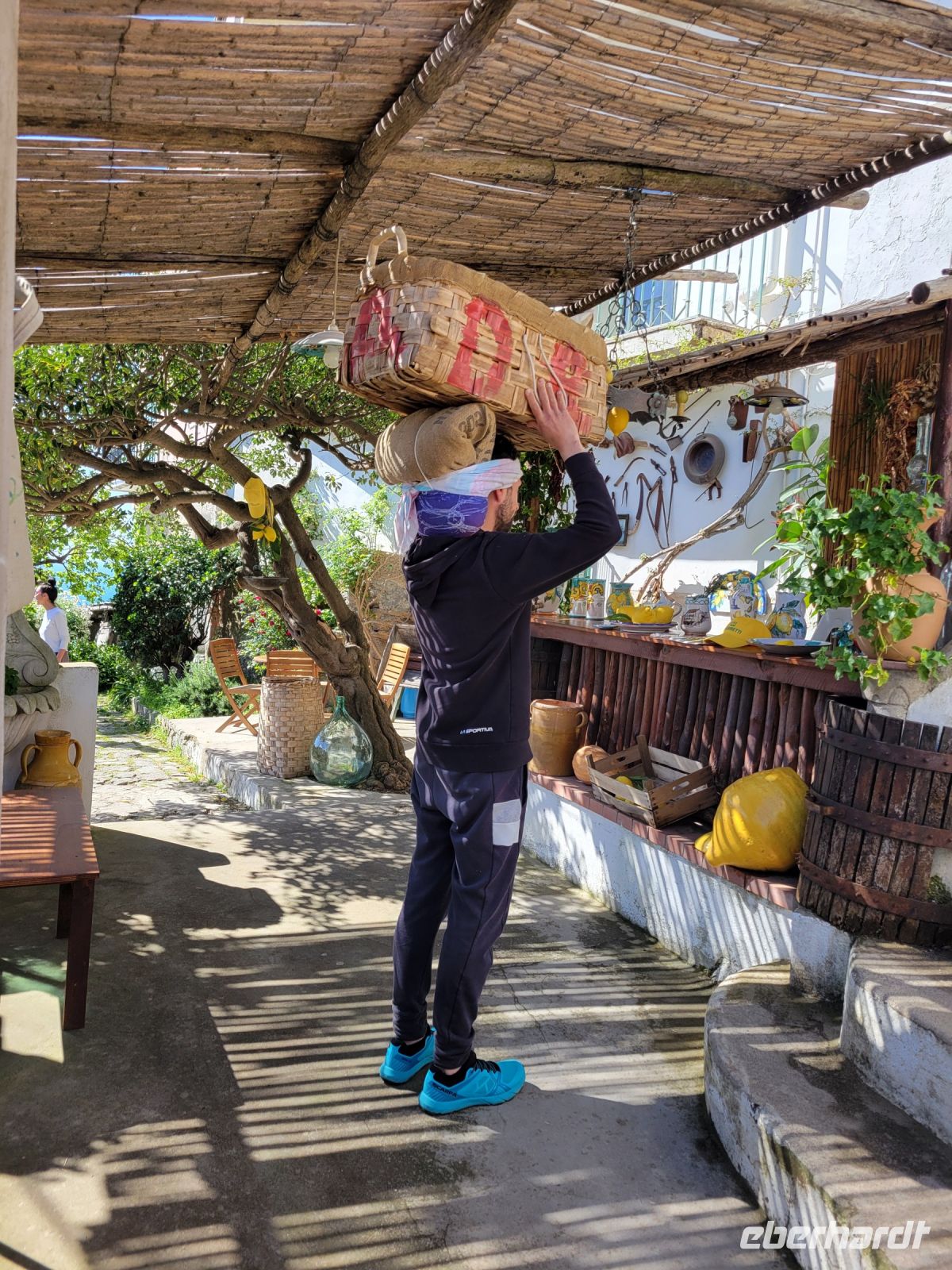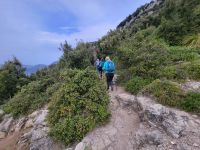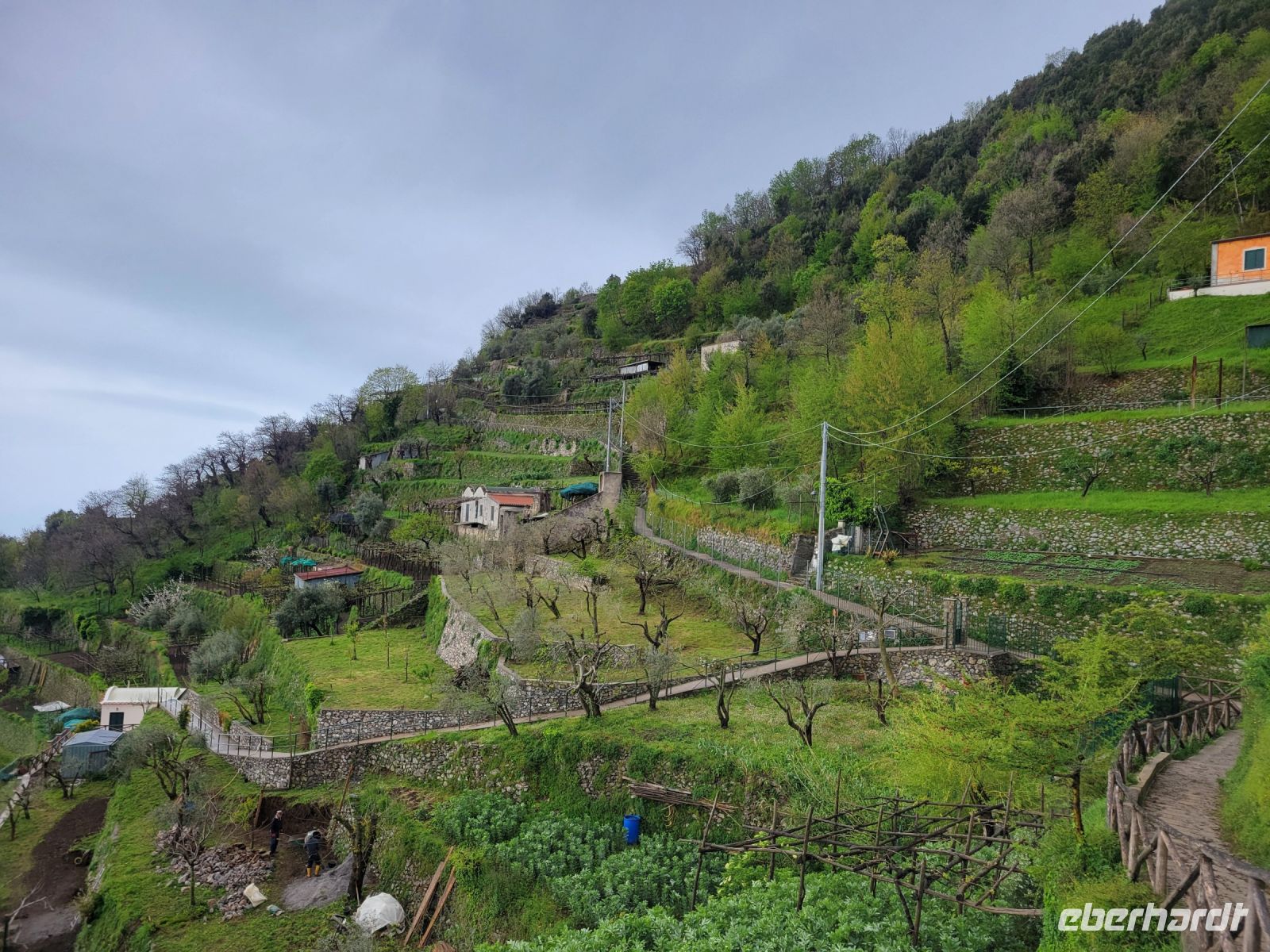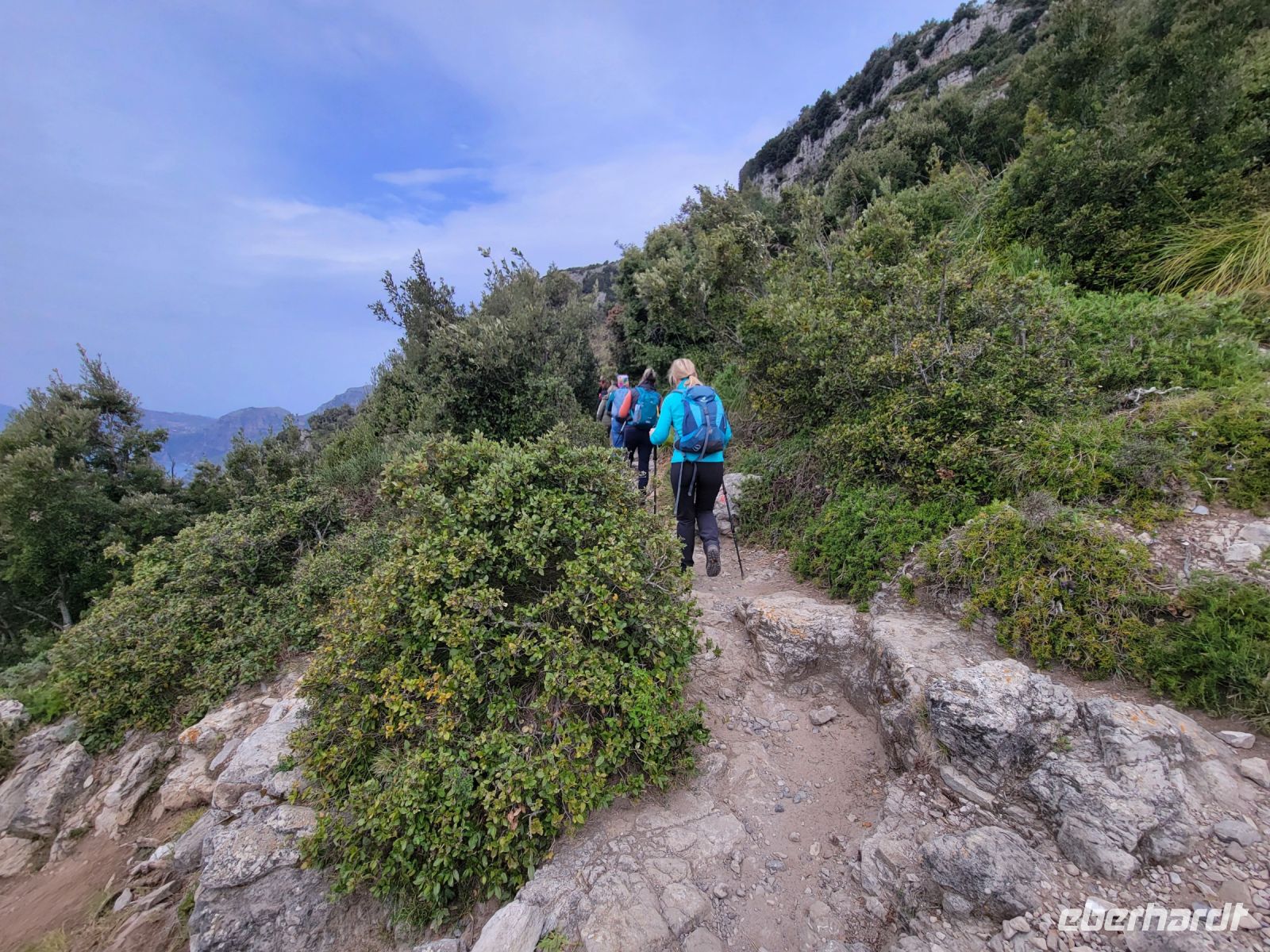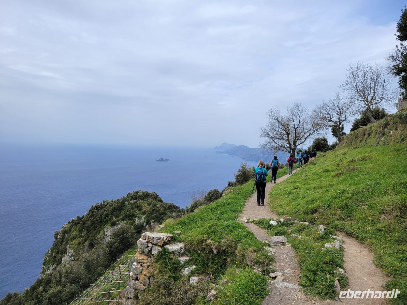 Unser Bus bringt uns zunächst hoch nach Bomerano. Hier steigen wir ein in den Sentieri degli Dei. Dieser Weg verläuft kehrenreich auf einer Höhe von 600 bis 750 Metern und ist einer der Höhepunkte und bekanntesten Wanderwege entlang der Amalfiküste, daher oft sehr stark frequentiert. Heute haben wir Glück und den Weg beinahe für uns allein. Der Weg ist recht uneben, hin und wieder sind Steine und andere Hindernisse zu überwinden