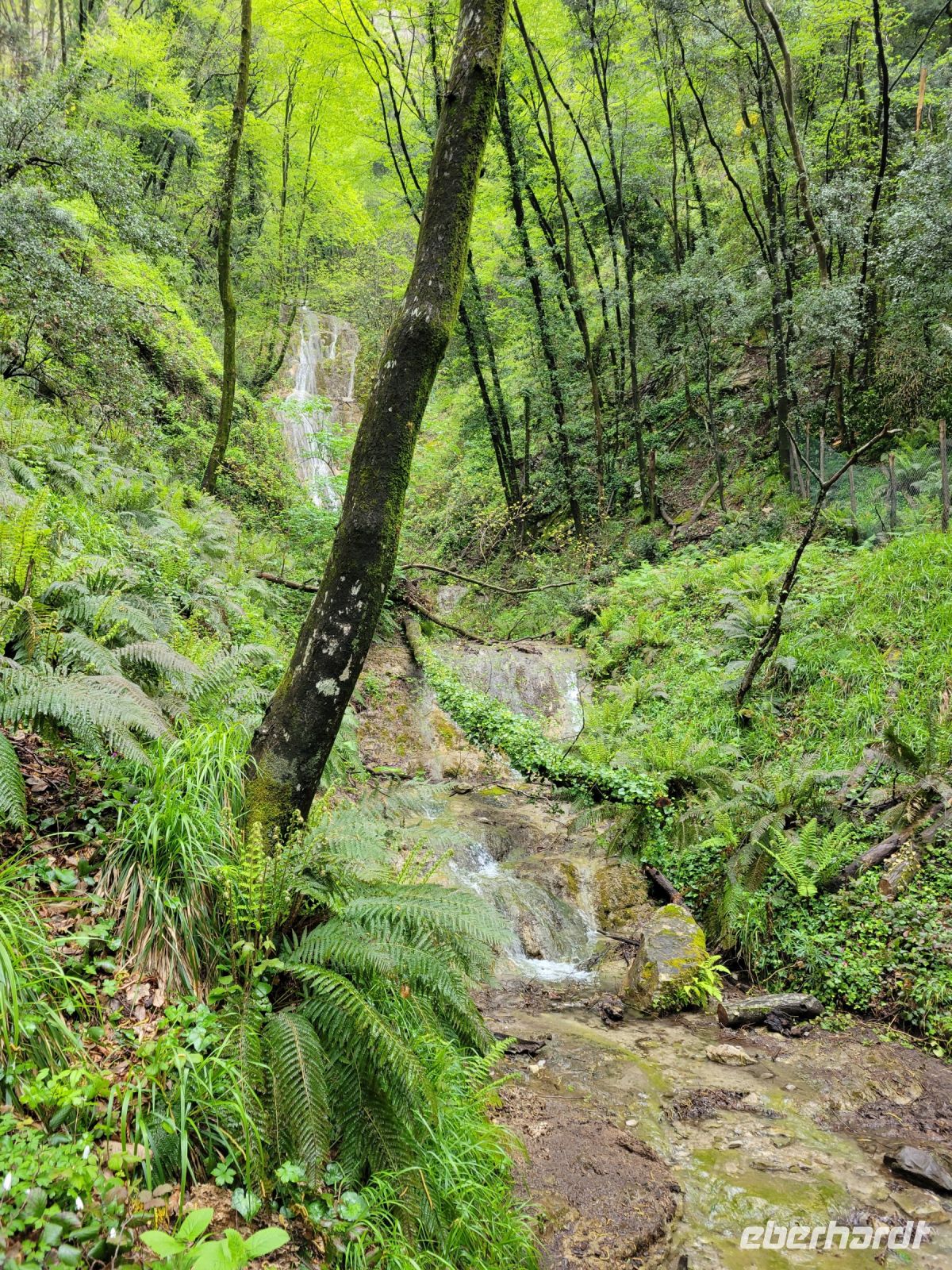 Nach einer kurzen Rast überqueren wir den Bach über große flache Steine. Anschließend wird der Weg schmaler, hin und wieder ist ein Hindernis zu überwinden, und erfordert Konzentration und Trittsicherheit.