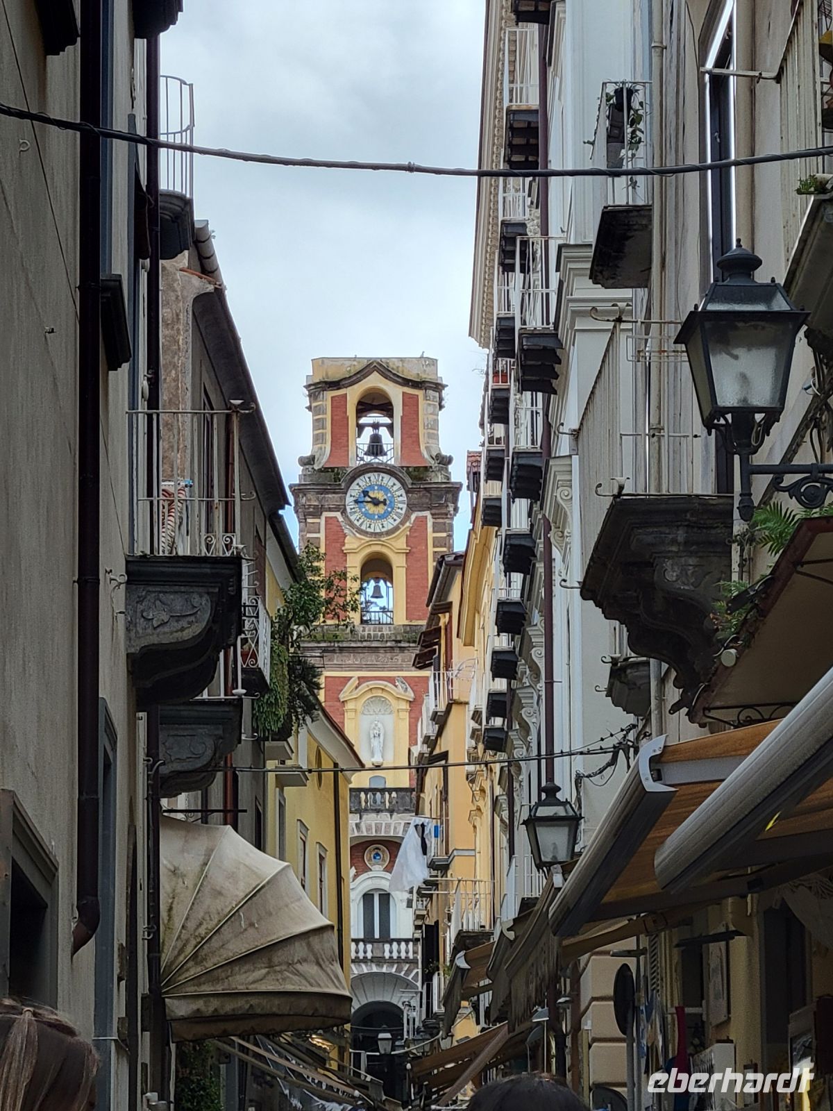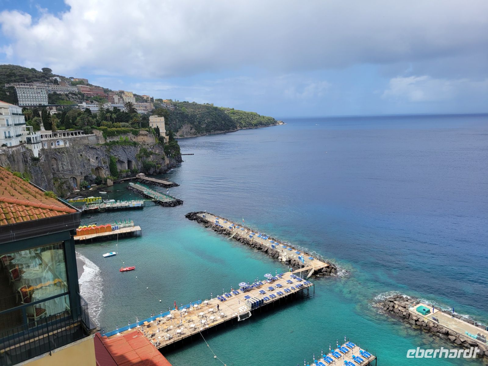 Wir sehen den Hauptplatz Piazza Tasso mit dem Denkmal des Torquato Tasso, einem bekannten, in Sorrent geborenen italienischen Dichter. Von dort geht es über eine belebte Fußgängerzone und die Strada Tasso in Richtung Meer. Von der Brüstungsmauer haben wir einen guten Ausblick auf den unterhalb liegenden Hafen von Sorrent und die Badeanlagen.