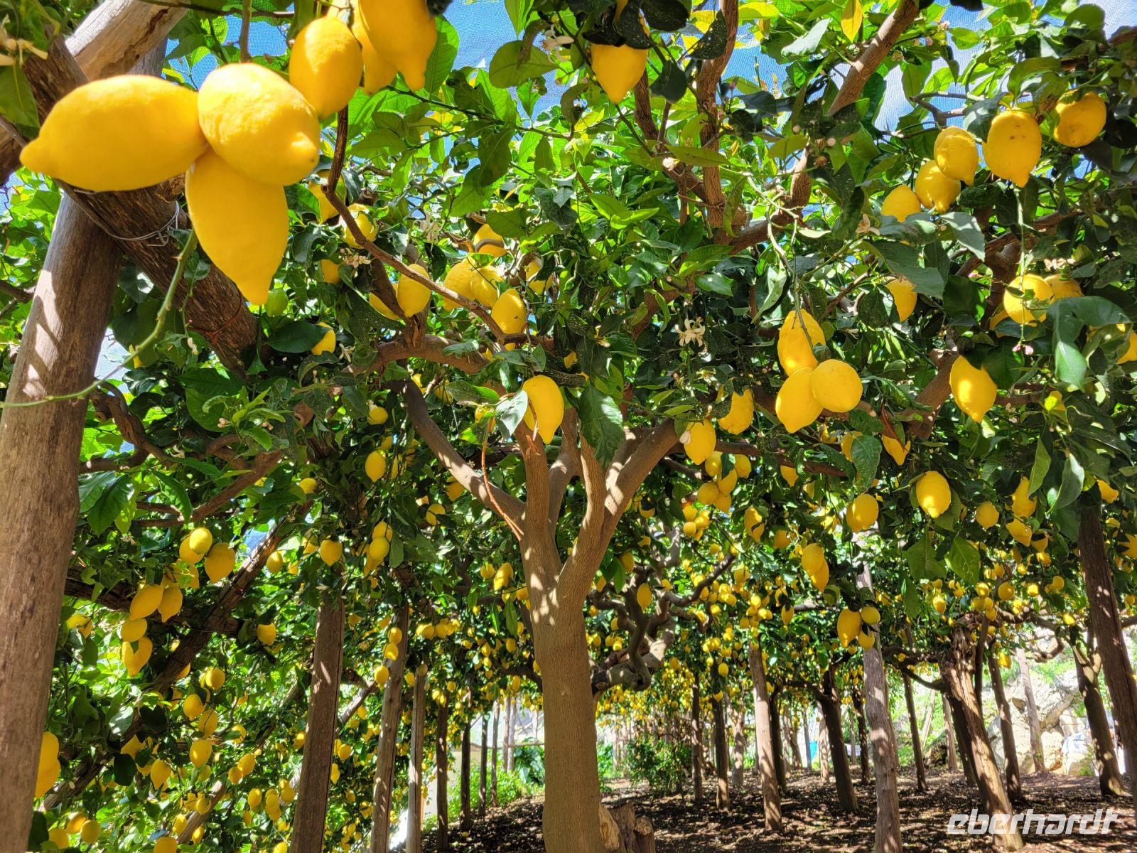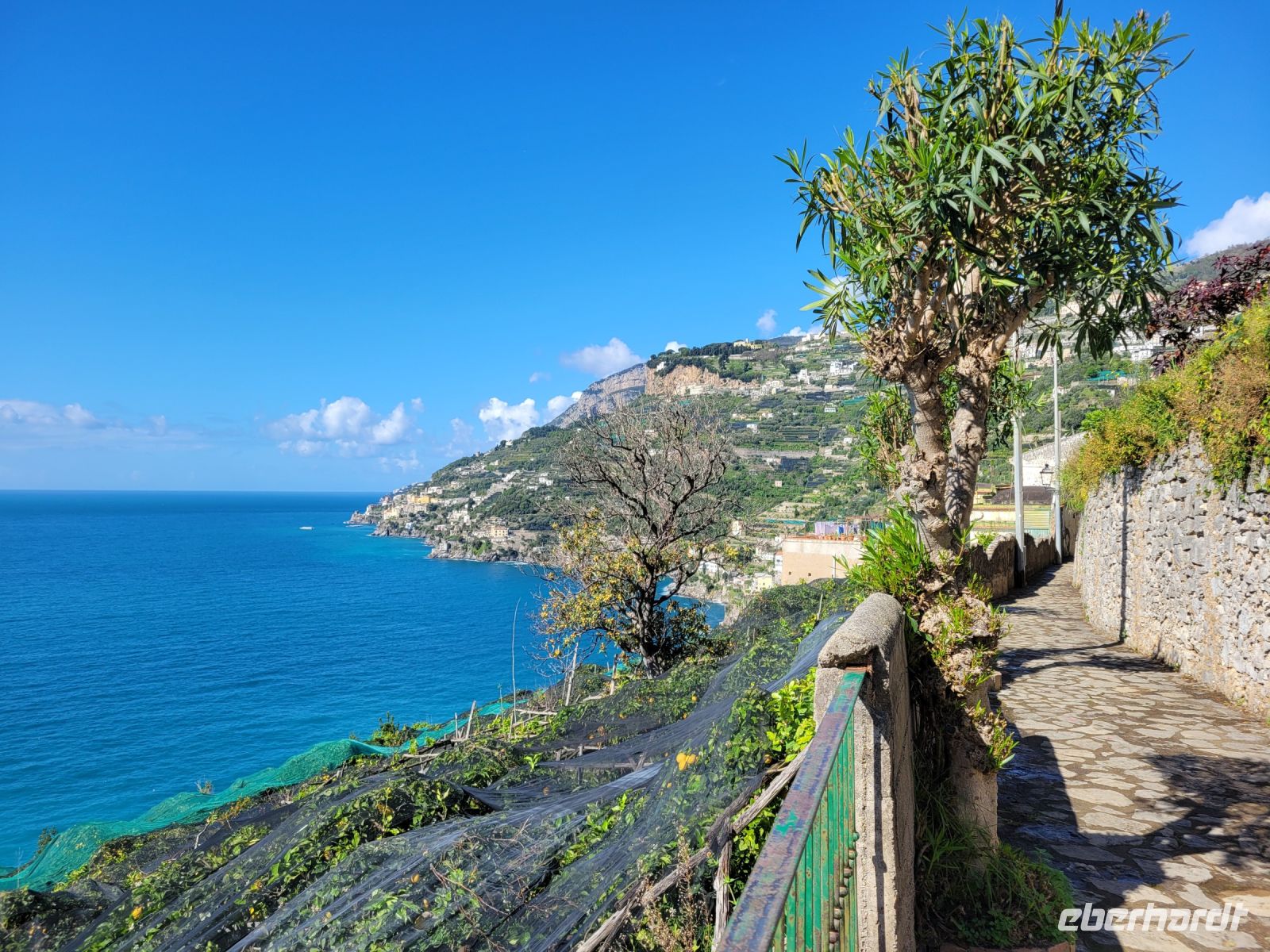 Unterwegs gibt es immer wieder wunderschöne Aussichten auf das azurblaue Meer des Golfs von Salerno und den heute fast blauen Himmel, aber auch auf von Netzen geschützte Zitronenhaine am Wegesrand.