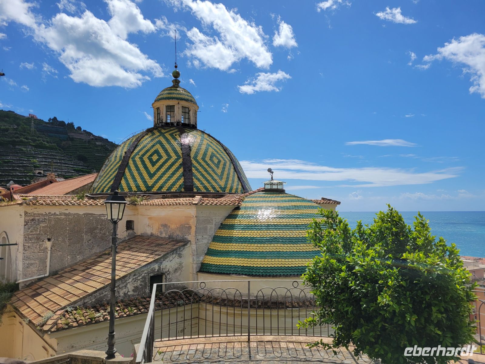 Weiter geht es, jetzt mit Ausblicken auf die Bucht von Maiori mit ihrem langen Sandstrand. Beim Abstieg in den Ort begrüßt uns die mit Majolika-Fliesen verzierte Kuppel der Kirche. Die leuchtenden Farben der Fliesen funkeln in der Sonne. Hier und da hängt an der Häuserfront die gewaschene Wäsche, um in der Sonne zu trocknen.
