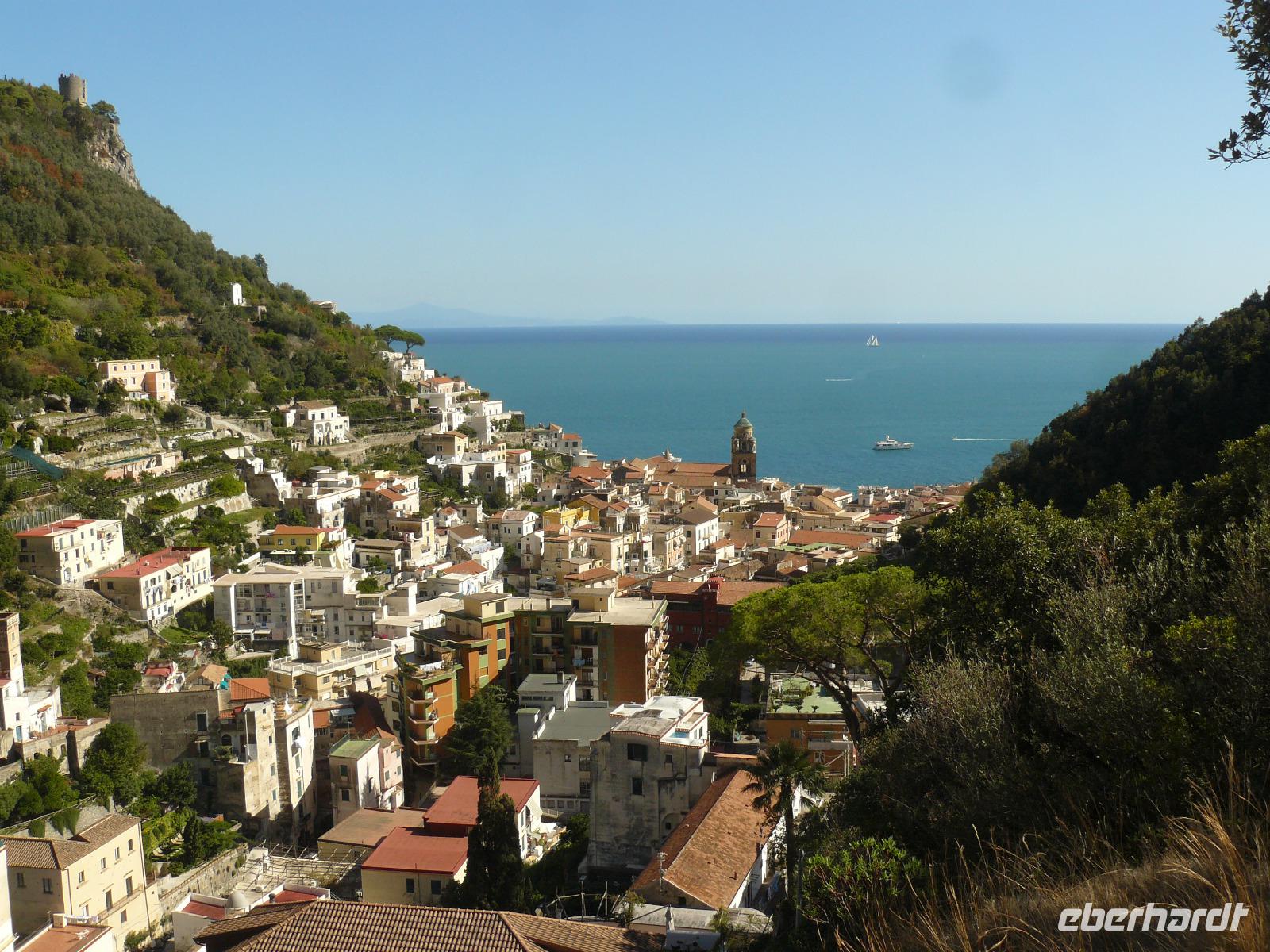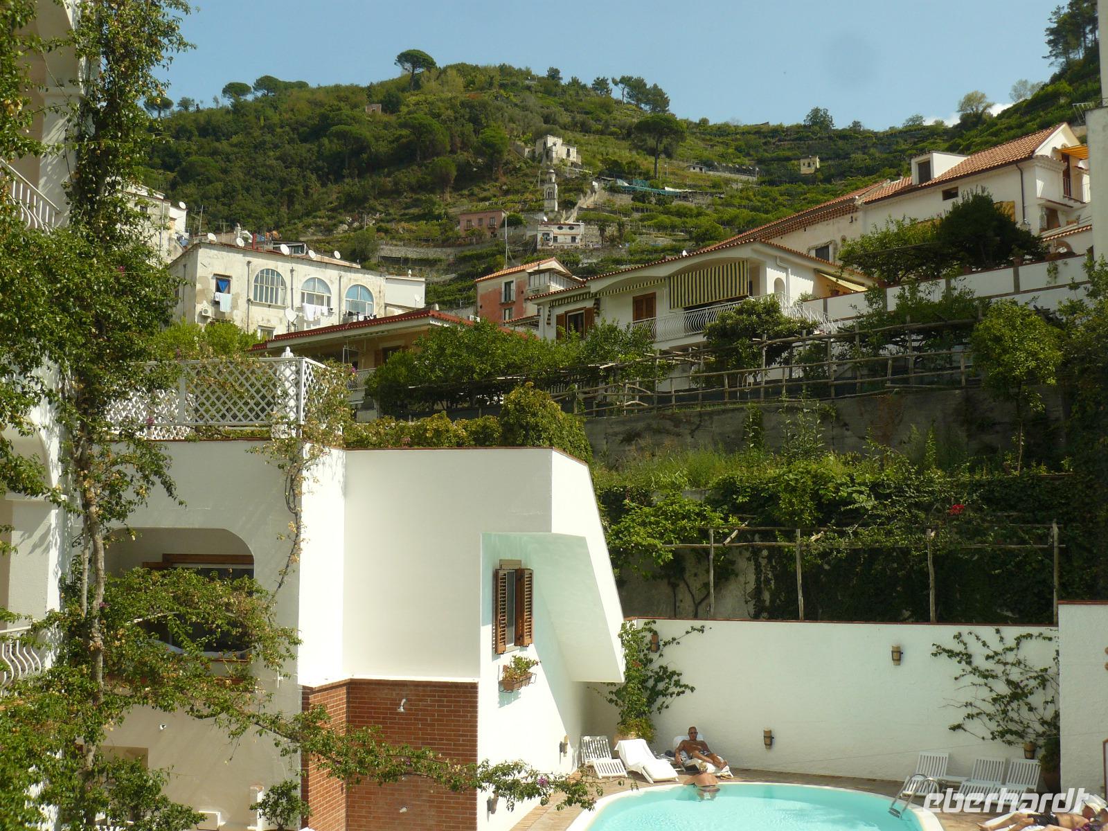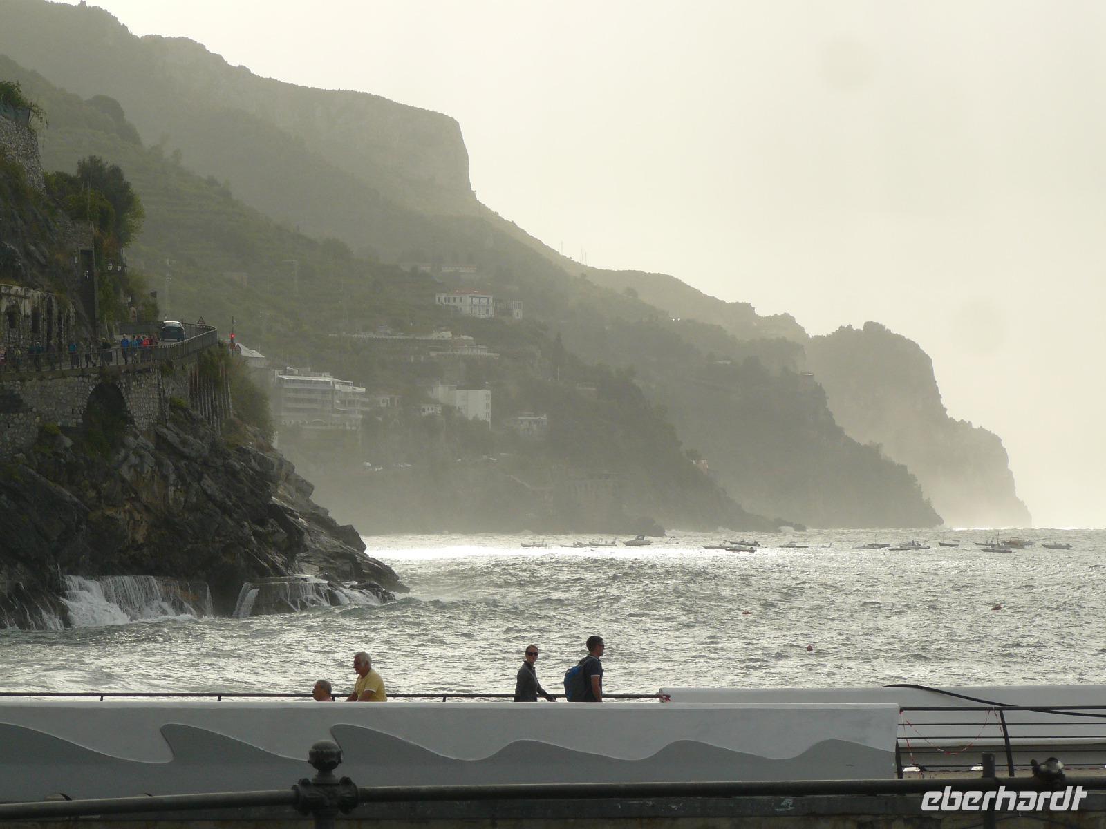 Früher Vogel.... In Berlin starteten wir bereits um 7 Uhr und erreichten den Flughafen von Neapel schon kurz nach 9 Uhr. Ein herrlicher Spätsommertag erwartete uns in Italien und kurz nach 11 Uhr hatten wir unser Hotel in Minori erreicht. Der Pool lockte, aber auch das Meer. Das hatten wir schon auf der Strecke zwischen Vietri sul Mar und Minori aus der Ferne in blau blitzen sehen. Dann aber zogen kleine Wölkchen auf. Und der Nachmittag wurde je nach Wunsch von den Gästen zum Schlafen oder zur ersten Ortserkundung genutzt. Zum Sandstrand waren es gerade mal 5 Minuten zu gehen. Und zur nächsten Eisdiele war es auch nicht weiter. Am Nachmittag trafen dann auch die Gäste aus München ein und während des leckeren Abendessens erreichten schließlich die letzten Gäste aus Frankfurt und Köln kommend, unser Hotel in Minori. Leider war die Wettervorhersage für den kommenden Tag nicht wirklich heiter: ein Sturm sollte sich da zusammenbrauen, sagten die Wetterfrösche. Aber dann kam zunächst doch alles ganz anders.