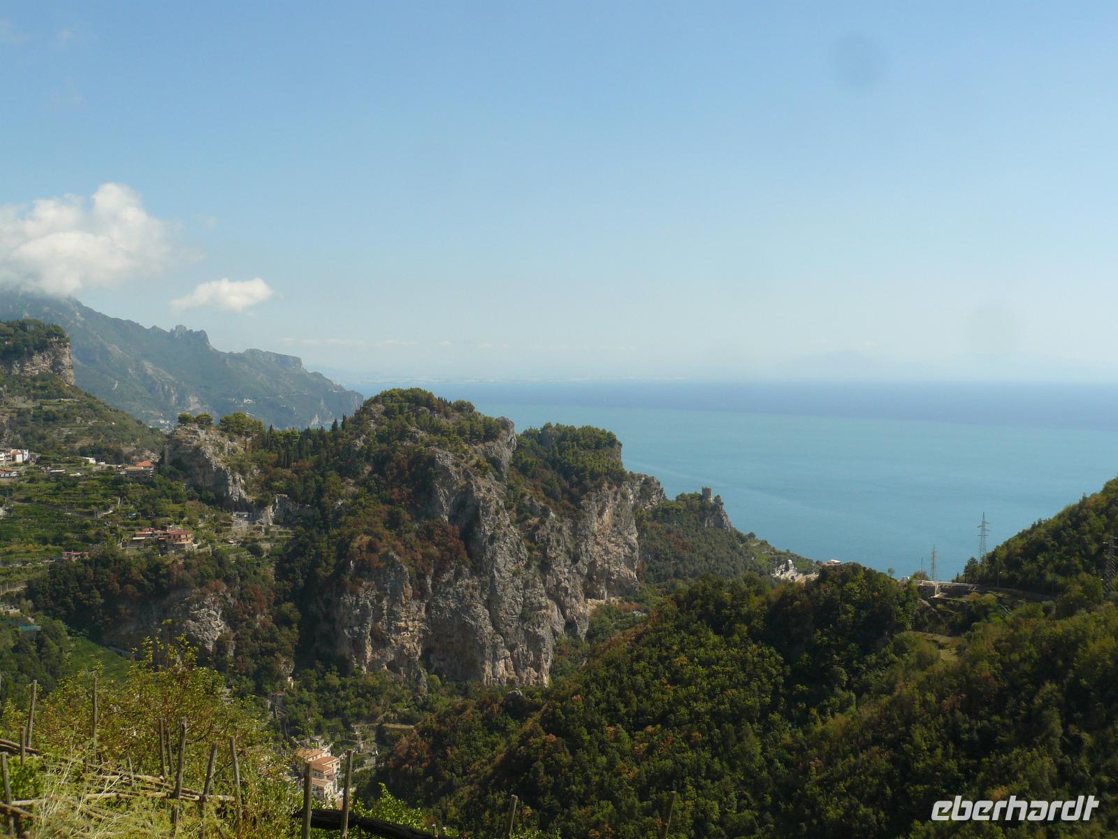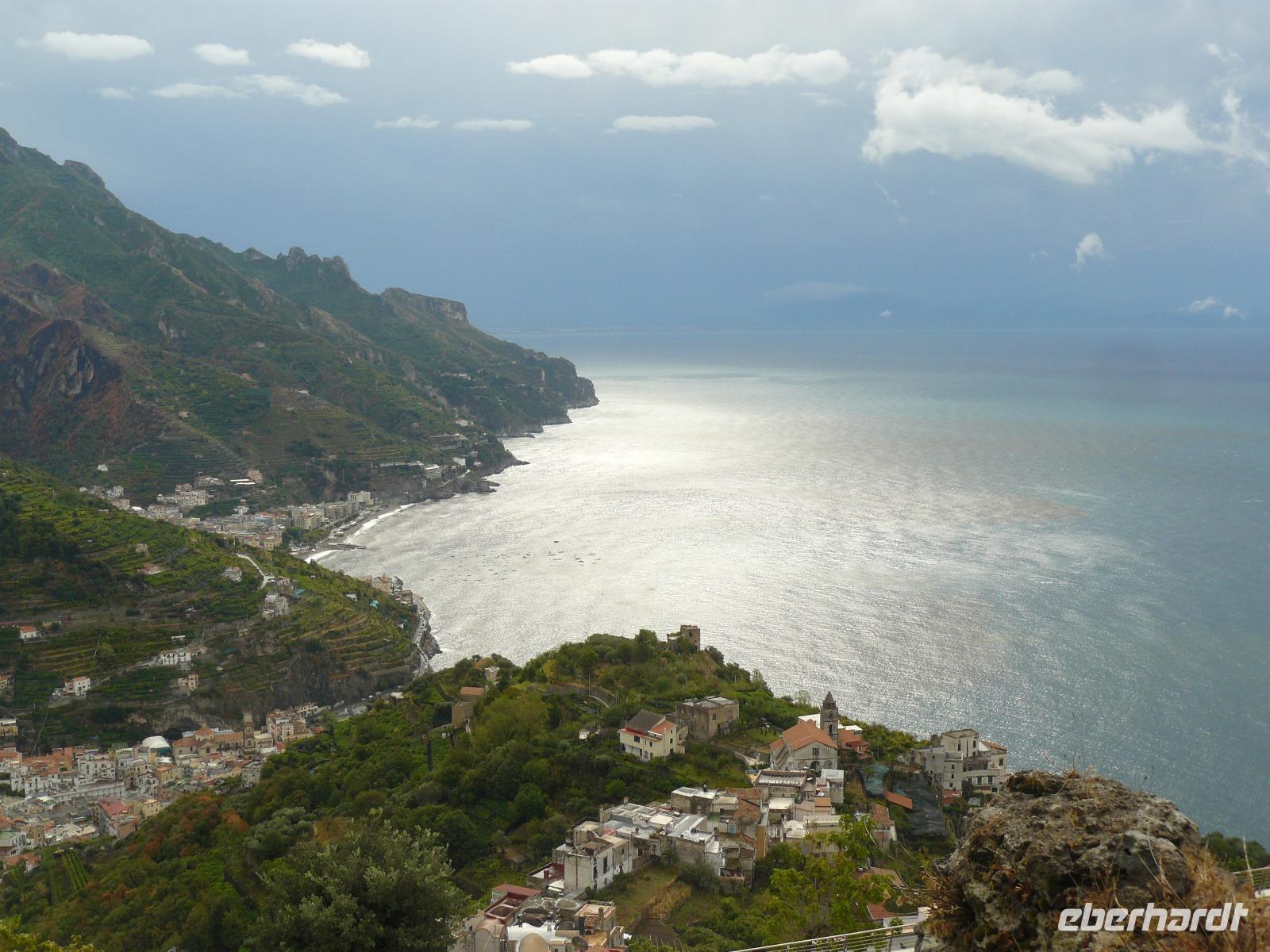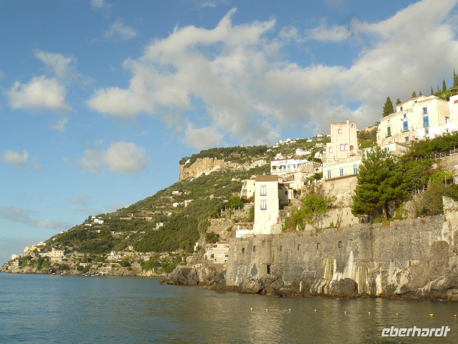 Früher Vogel.... In Berlin starteten wir bereits um 7 Uhr und erreichten den Flughafen von Neapel schon kurz nach 9 Uhr. Ein herrlicher Spätsommertag erwartete uns in Italien und kurz nach 11 Uhr hatten wir unser Hotel in Minori erreicht. Der Pool lockte, aber auch das Meer. Das hatten wir schon auf der Strecke zwischen Vietri sul Mar und Minori aus der Ferne in blau blitzen sehen. Dann aber zogen kleine Wölkchen auf. Und der Nachmittag wurde je nach Wunsch von den Gästen zum Schlafen oder zur ersten Ortserkundung genutzt. Zum Sandstrand waren es gerade mal 5 Minuten zu gehen. Und zur nächsten Eisdiele war es auch nicht weiter. Am Nachmittag trafen dann auch die Gäste aus München ein und während des leckeren Abendessens erreichten schließlich die letzten Gäste aus Frankfurt und Köln kommend, unser Hotel in Minori. Leider war die Wettervorhersage für den kommenden Tag nicht wirklich heiter: ein Sturm sollte sich da zusammenbrauen, sagten die Wetterfrösche. Aber dann kam zunächst doch alles ganz anders.