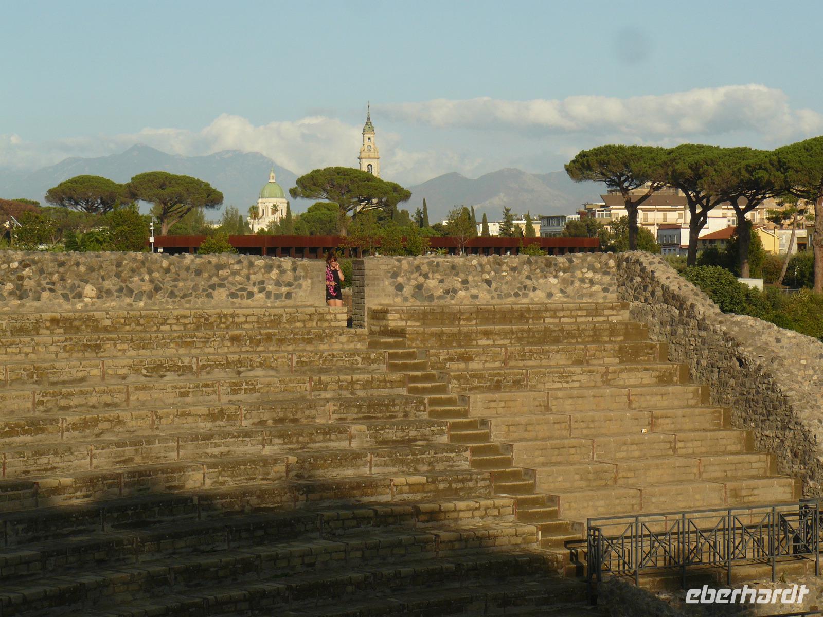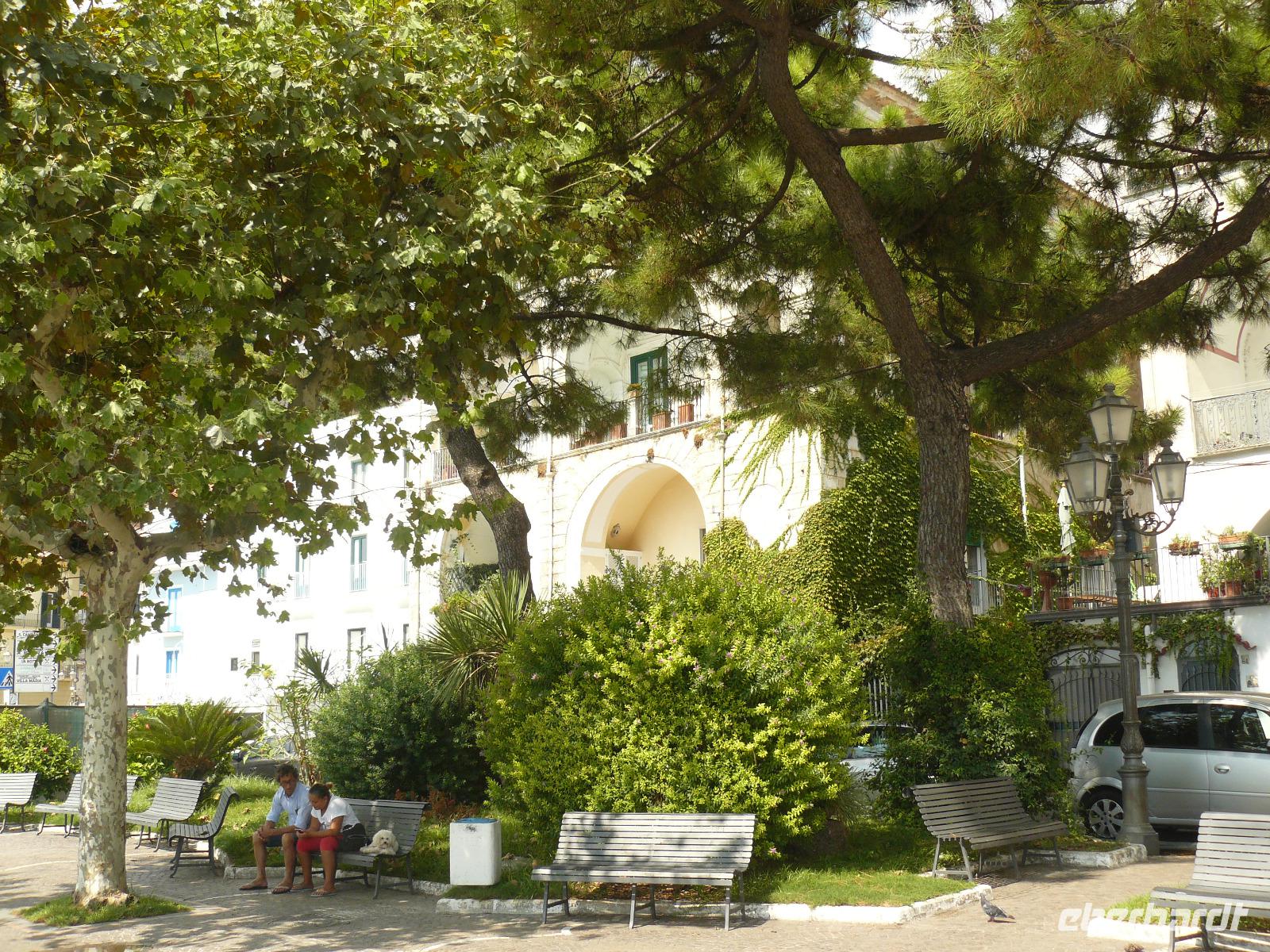 Um 3 Uhr morgens riss ein lauter Knall einige Gäste aus dem Schlaf. Nein, kein Auto fuhr gegen die Hauswand - ein Blitz war eingeschlagen, nicht allzu weit entfernt. Und wenig später kam dann das, wovon alle Welt schon seit Tagen redete: das Gewitter. Regen prasselte auf das ausgetrocknete Land. Mit schlimmen Folgen für die Natur, denn wenige Wochen zuvor hatten große Waldbrände Italien in Atem gehalten. Deren Spuren waren auch im Umland von Amalfi sichtbar, aber glücklicherweise betrafen sie unsere Reiseziele kaum. Nun aber prasselte der Regen auf die abgebrannten Gipfel und Felswände im Gebirge und aller Boden, der früher durch die Wurzeln der dort wachsenden Pflanzen festgehalten wurde, rauschte nun als „fango" (Schlamm) in den Bächen zu Tal. Was tun? Wandern...?? Die Wettervorhersagen schwankten zwischen Regen, Starkregen und Blitz und Hagel. Also planten wir um. Der Bus brachte uns zwar wie geplant auf 380 m Höhe: heute stand nämlich Ravello auf unserem Programm. Aber um die Mittagszeit holte uns dort der Bus auch wieder ab. Wir hatten Glück, denn zunächst erwischten wir eine Regenlücke. Aber bald schon ging es weiter mit dem Nass von oben. Den Garten der Villa Cimbrone besuchten wir und retteten uns dann noch in den trockenen Dom von Ravello. Hinab nach Minori brachte uns also dann unser Charterbus. Dort war wieder eine Villa unser Ziel, die Villa Maria. Diese bot uns allerdings etwas ganz anderes. Hier gab es ein leckeres Mittagessen zu genießen, mitten im Zitronenhain. Vicenzo stapfte durch den Regen und erntete Zitronen, die begeisterte Abnehmer fanden und Anni, der Haushund, räkelte sich vergnügt, als ihr streichelnde Hände zu Leibe rückten. Wir warteten dann noch eine Regenlücke ab und gingen dann abwärts wieder nach Minori zurück in unser Hotel. Auch hier erwartete am späteren Abend wieder ein leckeres Mahl unsere Gruppe. So hatten wir den üblen Tiefausläufer, der in Livorno Autos zu schwimmenden Vehikeln gemacht hatte, ganz gut bei leckerem Essen überstanden, denn nun war die Wettervorhersage wieder gut.