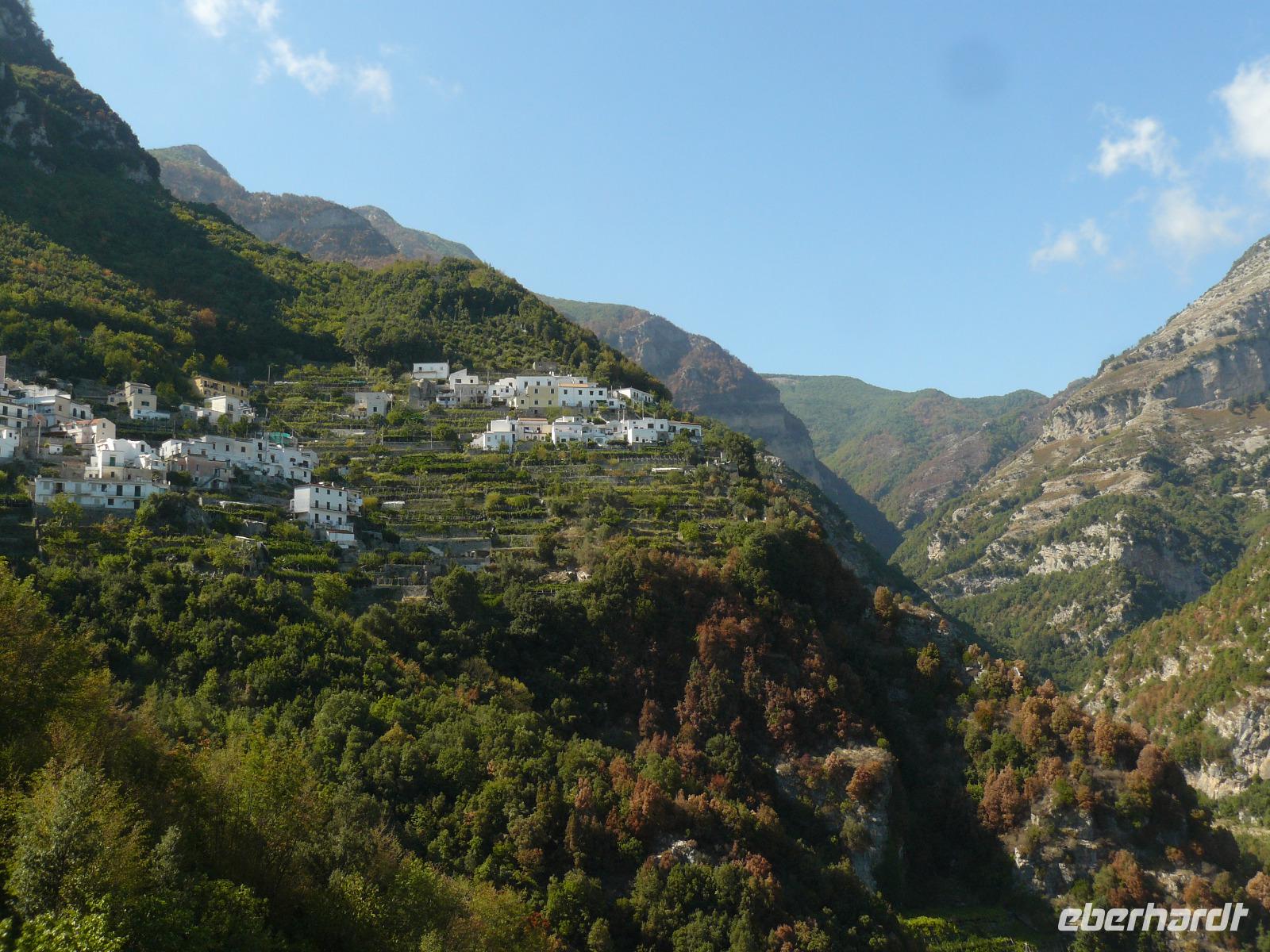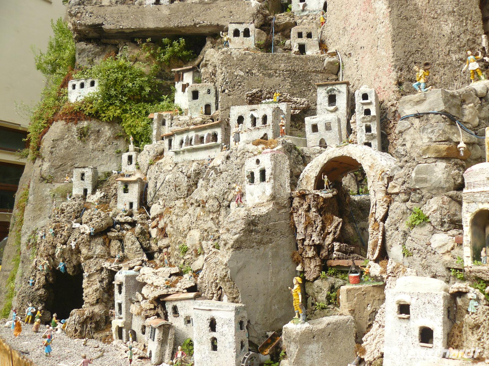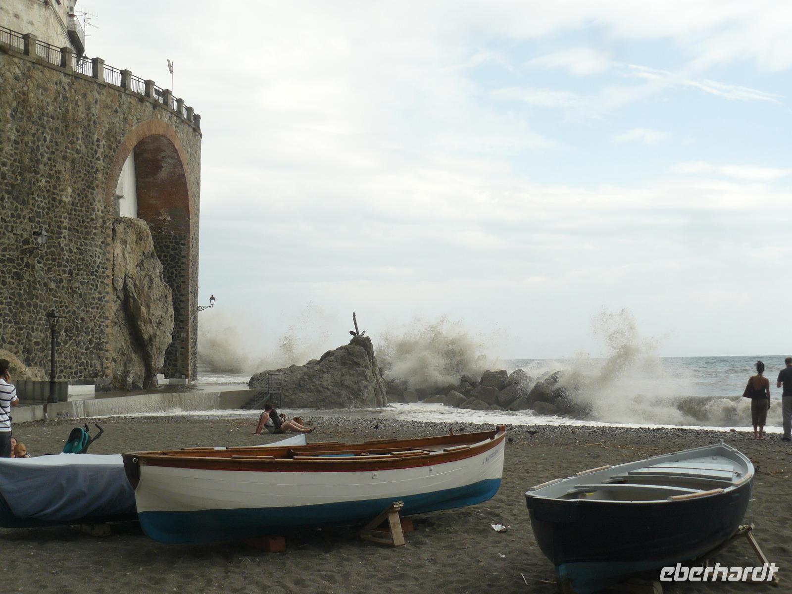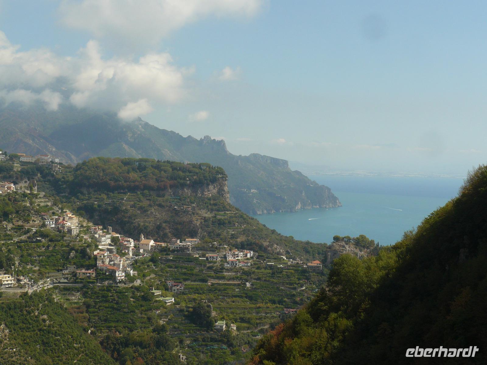 Ein Sonntag Morgen, an dem die Neapolitaner zu Hause blieben! Da hatten wir mal so richtig viel Platz, denn allen Unkenrufen zum Trotz zogen wir los. Es war warm, sehr warm, schwülwarm. Aber das war's dann auch. Eigentlich war der Tag recht freundlich. In Amalfi warfen wir einen Blick auf die ganzjährig aufgestellten Weihnachtskrippen und besichtigten das Papiermuseum. Aber selbst in den kühlen Gewölben der Papiermühle war es nun warm. Eine herrliche Führung mit einem kompetenten, kreativen und auch sehr motivierten guide, der, wenn ihm die Worte ausgingen ganz einfach mit den Armen nachhalf und kräftig in der Luft herumruderte. Wir hatten unsere Freude daran. Danach ging's mit Heinz Erhard und Johann Wolfgang von Goethe durch die Zitronenhaine aufwärts. Aber bald schon ließen wir die Zitronenbäumchen hinter uns und durchwanderten das herrliche Valle dei Mulini, das Mühlental, passierten überwucherte alte Gemäuer und malerische Wasserfälle. Unser Weg schlängelte sich nun durch Wald aufwärts und wir schwitzten kräftig. Aber bald schon bot sich uns eine herrliche Aussicht auf Amalfi hinunter, bevor man uns in Pontone bei unserer Mittagspause leckere Antipasti und andere italienische Speisen servierte. Nach der Mittagspause wurde es windig, bedeckt und deutlich kühler und wir wanderten an weiteren Zitronenplantagen vorüber in das Valle del Dragone hinunter. Der Drache war nicht zu Hause - das Tal präsentierte sich noch friedlich. Ruhe vor dem Sturm. Am unteren Ende des Tales erreichten wir das hübsche Atrani. Dort gönnten sich einige Gäste ein Eis und wir staunten nicht schlecht, was sich da am Ufer abspielte. „Meinst Du wirklich, dass wir heute noch ein Boot besteigen sollen...?" So war unsere Rückreise eigentlich geplant. Riesige Wellen spritzten an den Wellenbrechern empor. Ein tolles Schauspiel, aber die Vorfreude aufs Bootfahren wurde dadurch doch ziemlich vermindert. Wir wanderten weiter durch enge Gassen über viele Treppen nach Amalfi. Hier besichtigten wir dann noch den beeindruckenden Dom Sant' Andrea. Im Kreuzgang stehen alte Sarkophage, die von mythologischen Geschichten berichten. In der Zwischenzeit war klar: Bootsfahrten waren heute nicht mehr möglich. Der Hafen war abgesperrt. Und unser örtliches Busunternehmen ließ uns nicht hängen: „...was, Du brauchst nen Bus? Gleich? Gib mir mal 20 Minuten Zeit, dann machen wir das schon...". Und da ich etwas früher vor der geplanten Bootsabreise angerufen hatte, kamen wir nahezu ohne Verspätung per Bus nach Hause. Italiener können einfach ganz genial improvisieren. Alles passte!