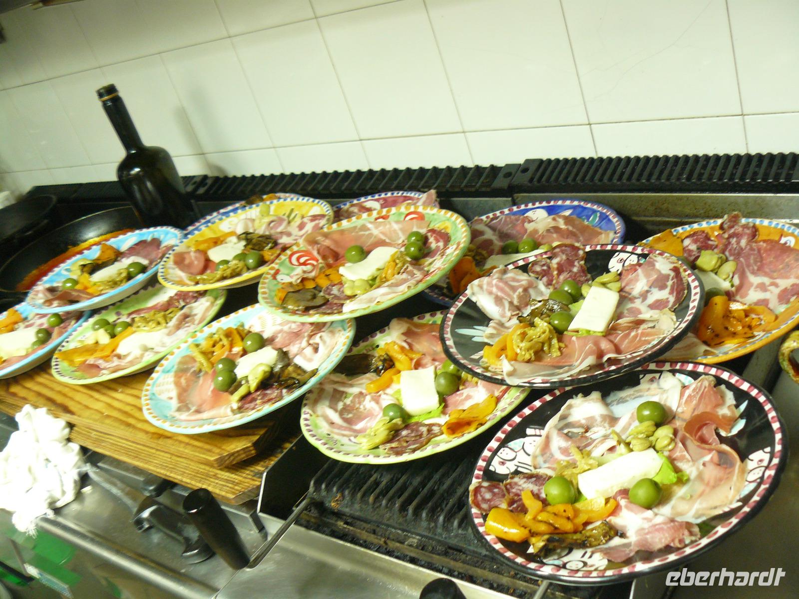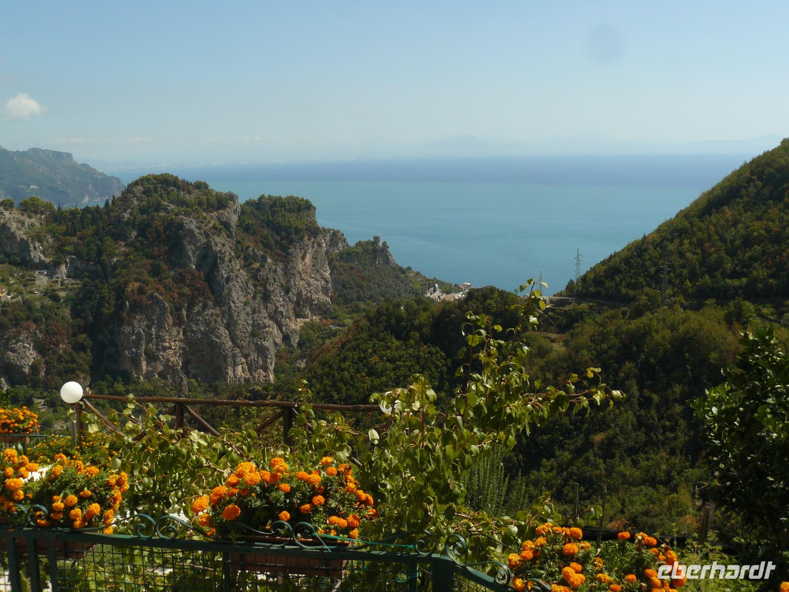 Die Götter empfingen uns noch mit bedecktem Himmel, aber das Blau war schon sichtbar und dehnte sich von Stunde zu Stunde weiter aus. In Bomerano gönnten wir uns noch einen Kaffee. Dann ging's los. Der Götterwanderweg mit seiner herrlichen Aussicht begeisterte uns. Aber im Meer hatte es keine Boote. Nirgends. Die Häfen waren immer noch gesperrt. Ich hatte also unsere Rückfahrt mal wieder umplanen müssen. Auch heute galt: Bus statt Boot. Eine kleine Pause machten wir an einer aussichtsreichen Stelle unter einer Felswand. Die große Pause folgte dann in Nocelle, einem kleinen Weiler, der hoch oben am Hang klebt. Und dort erwartete uns mal wieder Leckeres aus der Küche. Sehr gute Antipasti und wir hatten die ganze Terrasse für uns alleine. Aus war's mit schwüler Hitze, der Wind fegte und unsere Gruppe wanderte schnell und vollzählig weiter auf einem aussichtsreichen Pfad nach Positano. Hatten wir bisher himmlische Ruhe gehabt, was einem auf dem Wanderweg der Götter eher selten vergönnt ist, hatte uns nun die touristische Welt wieder eingeholt in aller Lebendigkeit. In Positano bummelte jeder noch ein bisschen nach den persönlichen Wünschen durchs Dorf. Die Fischer arbeiteten mit düsteren Minen am Strand, denn das Gewitter hatte auch hier seine Spuren hinterlassen: il fango, der Schlamm, hatte sich am Strand breitgemacht und nun hieß es Fischernetze putzen, nachdem man am Morgen schon in aller Eile die Straßen gereinigt hatte und den Badestrand so halbwegs aufgeräumt hatte. Und zahlreichen Urlauber stapften bereits wieder mit eleganten Schuhen über die frisch geputzten Stufen. Dann machten wir uns auf den Heimweg. Leider kamen viele andere Uraluber auf ganz genau die selbe Idee, denn nachdem kein einziges Schiff fuhr, tümmelten sich alle auf der Straße. Mit Geduld und Spucke - nein Mücken fangen wollten wir nicht. Wir wollten doch nur nach Hause, ins Hotel nach Minori... was uns schließlich dann auch gelang, aber es war wirklich Geduld gefragt. Und wir freuten uns sehr, dass tags darauf schon die Normalität ins Küstenleben zurückkehrte. Unsere Geduld wurde belohnt, denn unser Hotel servierte uns mal wieder ein sehr leckeres Essen.