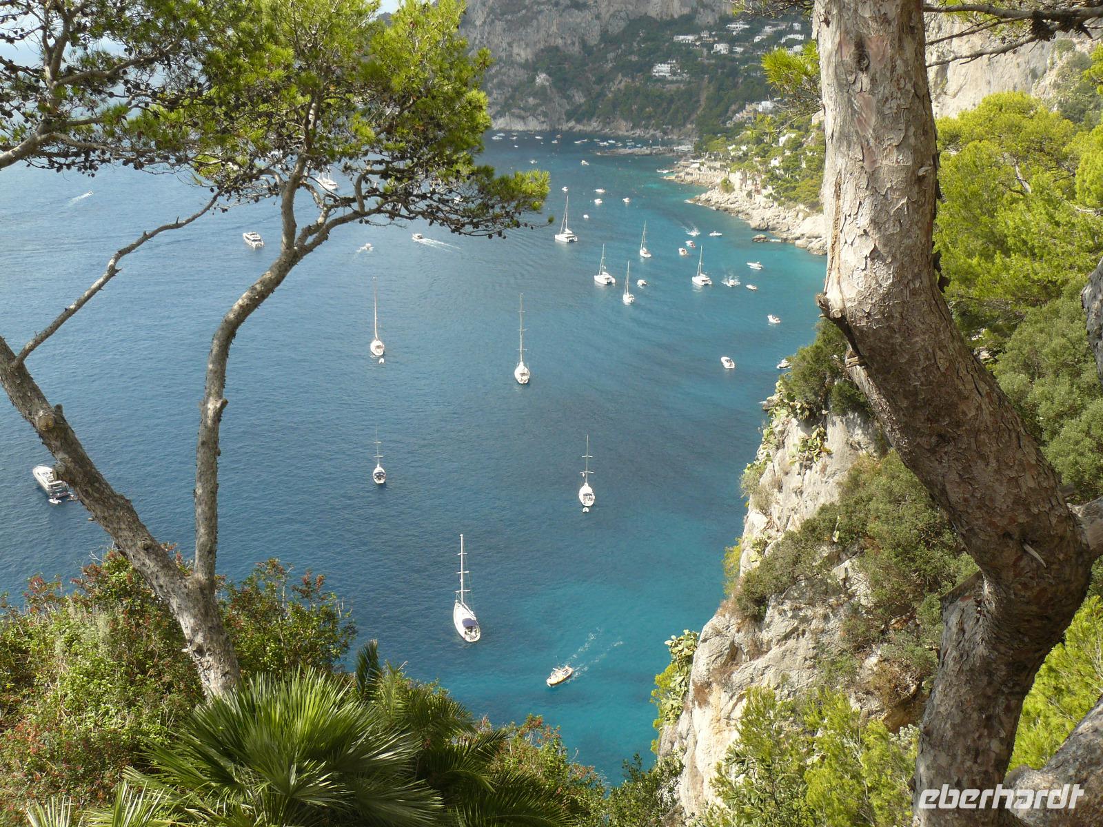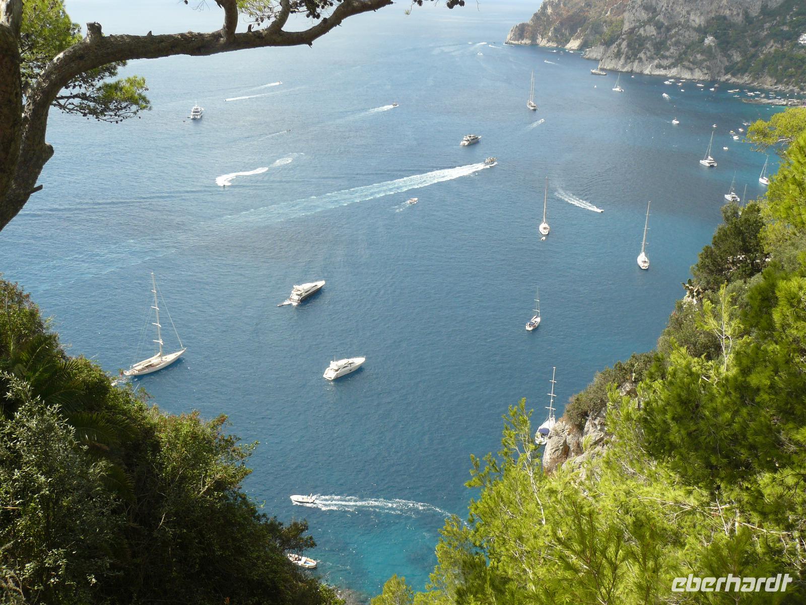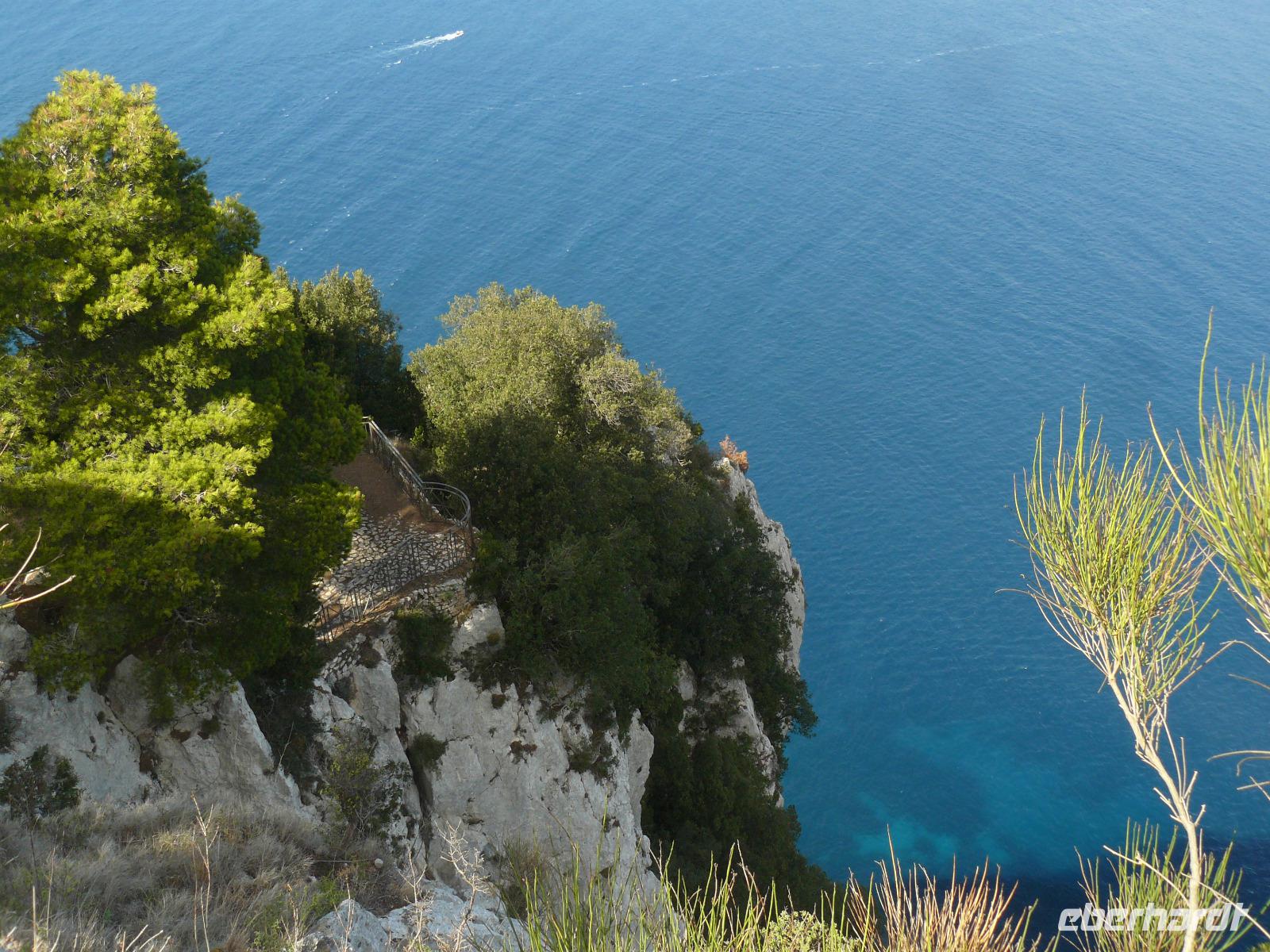 Capri sehen und ... nein, sterben wollten wir nicht! Und wir überlebten alle diesen schönen, langen Tag blendend. Unser Schiff fuhr um 8:20 Uhr. Wir waren zwar nicht die ersten Gäste an Bord in Minori aber wir fanden trotzdem alle noch ein Plätzchen an Deck. Dann fuhren wir über Amalfi und Positano nach Capri. Dort fuhren wir an der Südküste entlang, bekammen die Korallengrotte und die Weiße Grotte gezeigt und sahen hinauf zur Villa Malapartes und zum Arco Naturale. Hier oben würden wir wenig später wandern. Dann näherten wir uns den berühmten Faraglioni-Inseln. Und das Schiff fuhr durch den Tunnel der mittleren Insel hindurch! Danach bekamen wir dann auch noch eine Inselrundfahrt per Schiff geboten. In Marina Grande besorgte ich ein Picknick und ab ging's dank der vielen Helfer recht zügig mit der Funicolare-Bahn hoch auf den Hauptplatz von Capri. Wir spazierten über den Bergrücken zu den Augustusgärten und genossen den Ausblick auf die Via Krupp, die sich im wahrsten Sinne des Wortes nach Marina Piccola den Hang hinunter schlängelt. Dann starteten wir mit unserer Wanderung und machten unweit der Faraglioni-Inseln an einer schattigen Stelle unsere Picknickpause. Mal wieder lachte für uns die Sonne und das Meer schimmerte in türkisblauen Tönen. Auch dieses Mal war unser Mahl sättigend und sehr gut. Dann wanderten wir an der Villa Malaparte vorüber, stiegen hoch zum Felsentor Arco Naturale und wanderten zurück nach Capri. Hier trennten wir uns, denn einige Gäste wollten den Nachmittag etwas ruhiger angehen.