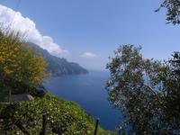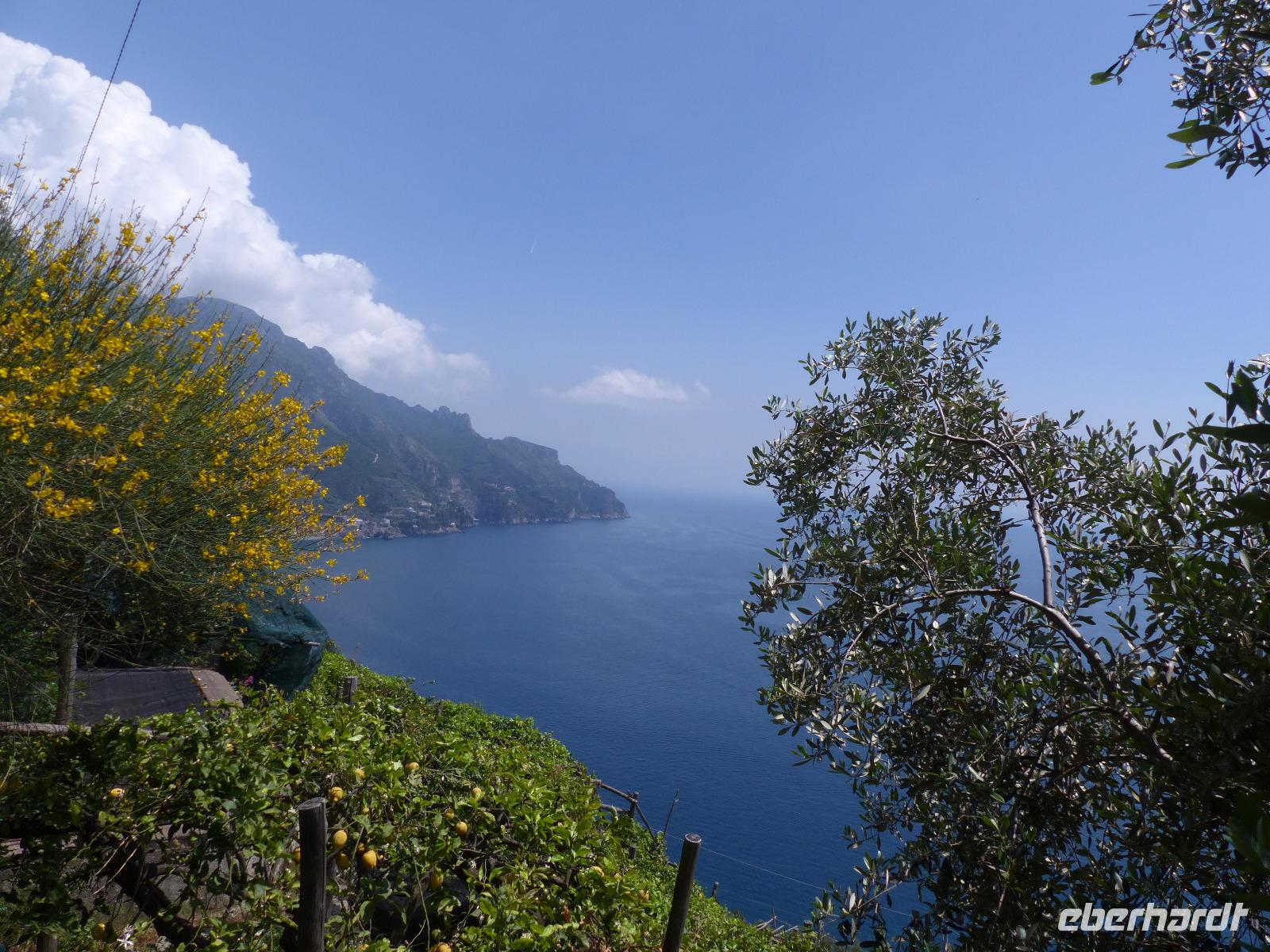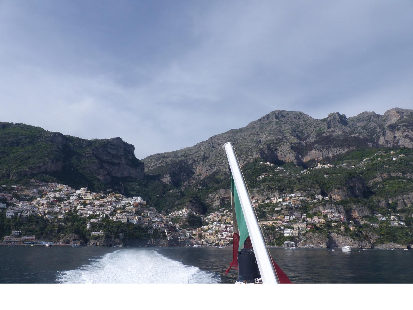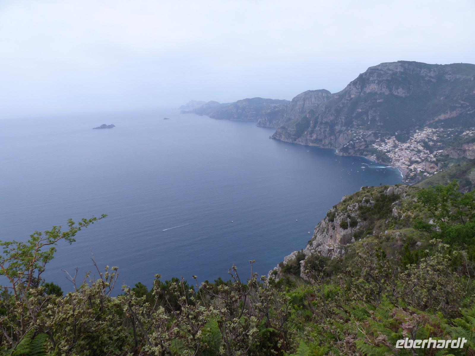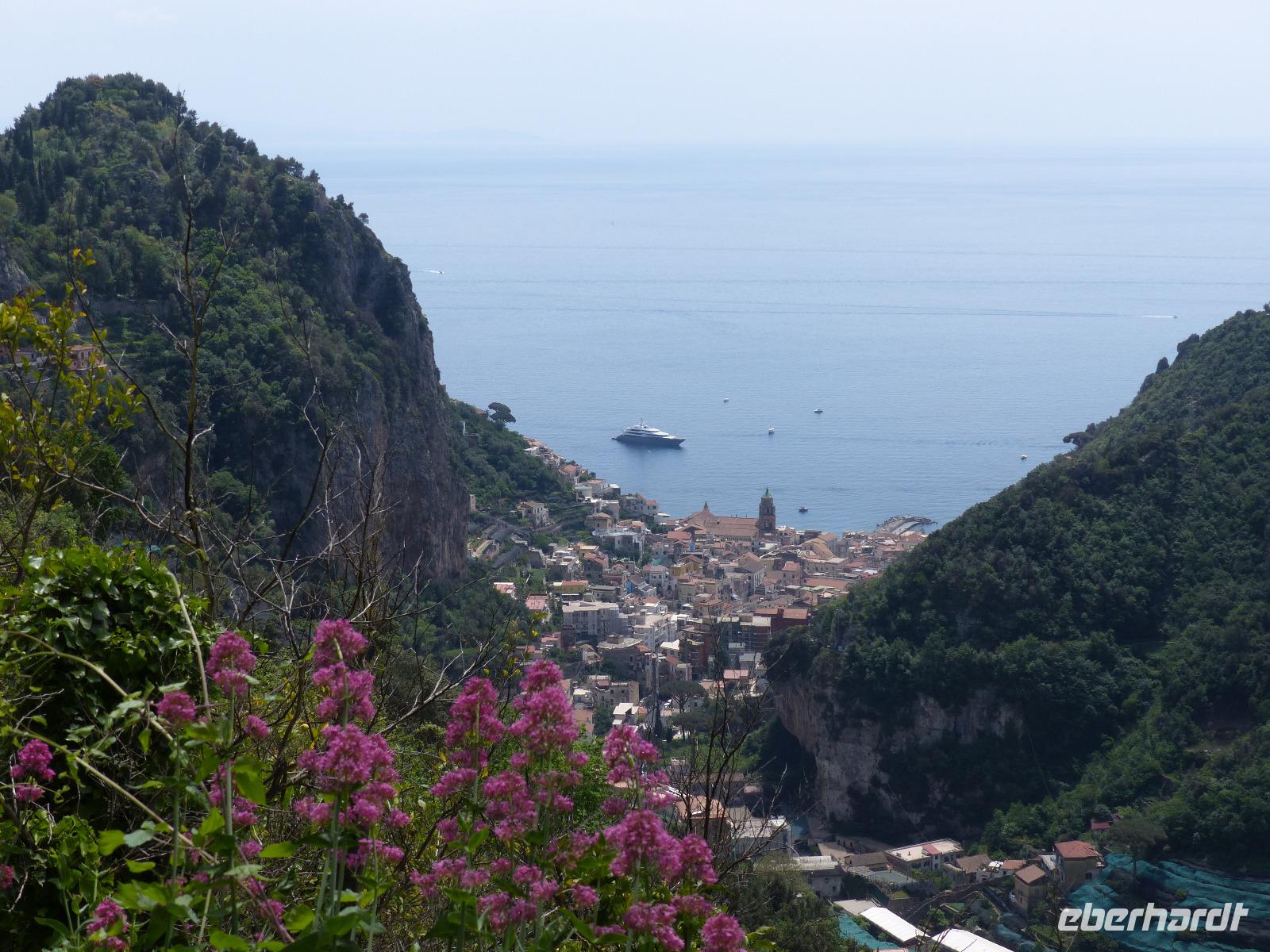 Die Götter empfingen uns mit mausgrauem Himmel. Aber es war warm und trocken. In Bomerano gönnten wir uns noch einen Kaffee. Dann ging's los. Der Weg war noch vor wenigen Wochen wegen eines Bergrutsches gesperrt gewesen. Nun ziehen wieder hunderte Menschen täglich in die Bergwelt zwischen Bomerano und Nocelle. Oberhalb der abgesperrten Stelle hat sich ein neuer Trampelpfad gebildet, über den man die abgerutschte Stelle umgehen kann. Viele Blumen blühten am Wegesrand, auf dem Meer flitzten Boote dahin und wir genossen die Aussicht. Eine kleine Pause machten wir an einer aussichtsreichen Stelle unter einer Felswand. Die große Pause folgte dann in Nocelle, einem kleinen Weiler, der hoch oben am Hang klebt. Und dort erwartete uns mal wieder Leckeres aus der Küche. Sehr gute Antipasti und wir hatten die ganze Terrasse für uns alleine. Ein paar Gäste genossen nun die Weiterreise per Bus, während die anderen sich mit mir zu Fuß auf den aussichtsreichen Pfad nach Positano begaben. Kläffende Vierbeiner empfingen uns in Montepertuso. Ein kleiner Ausrutscher blieb zum Glück ohne Folgen und so erreichten wir, nachdem wir Zaumgäste einer sehr stilvollen Hochzeitsfeier mit Konzert wurden (Mozarts Kleine Nachtmusik begleitete uns nun auf unserem Weg und geisterte durch unsere Köpfe), Positano und wir trafen uns alle wieder am Hafen von Positano. Den Rückweg traten wir übers Wasser an. Das Wetter hatte sich gebessert, die Sonne kam raus. Und die Strandbar an der Uferpromenade in Maiori freute sich nach unserer Rückkehr über eine ganze Gruppe Gäste, die den Blick aufs Meer mit leckeren Getränken genossen. Auch dieser Tag klang, wie immer, mit einem leckeren Essen in unserem Hotel aus.