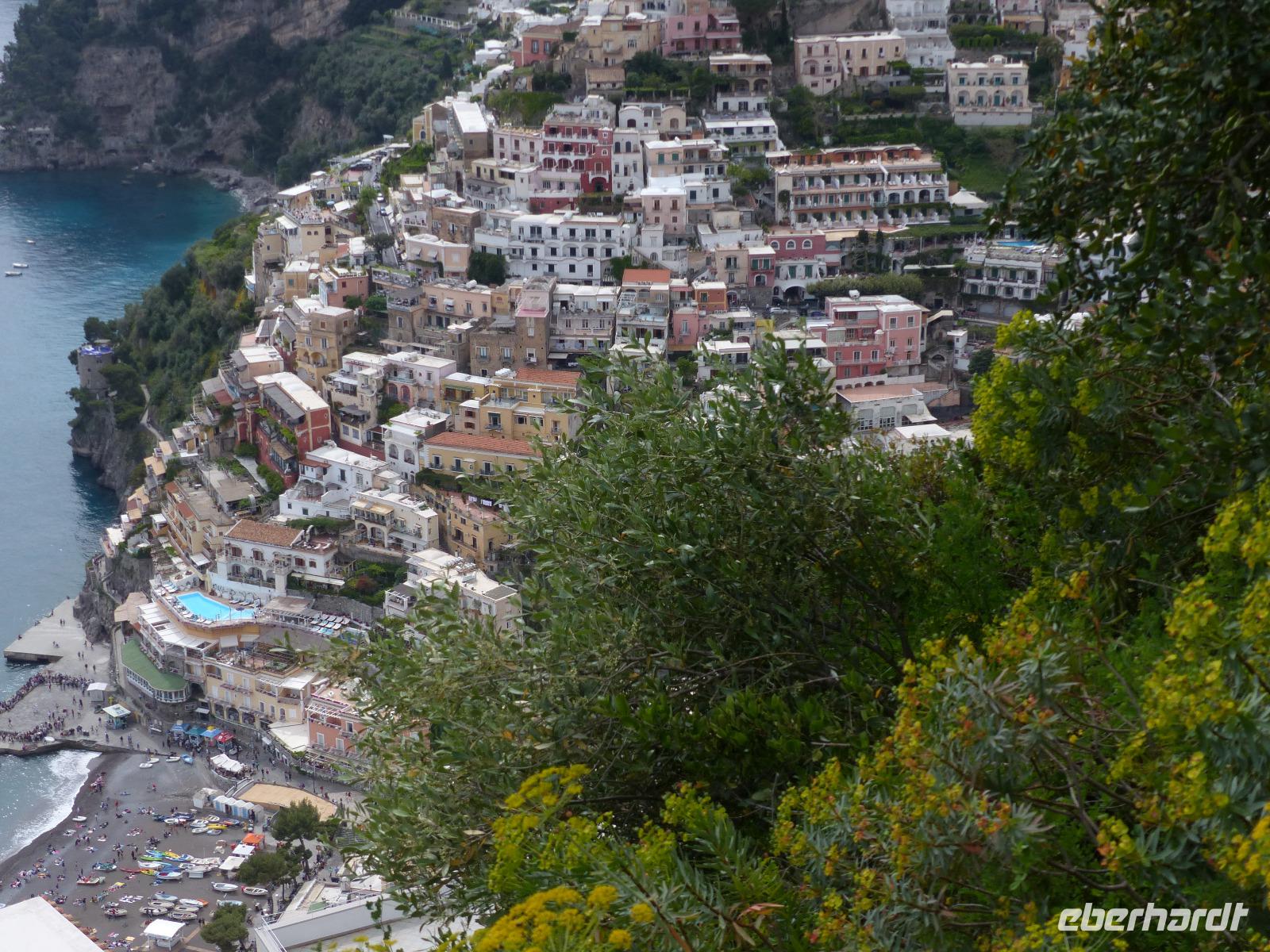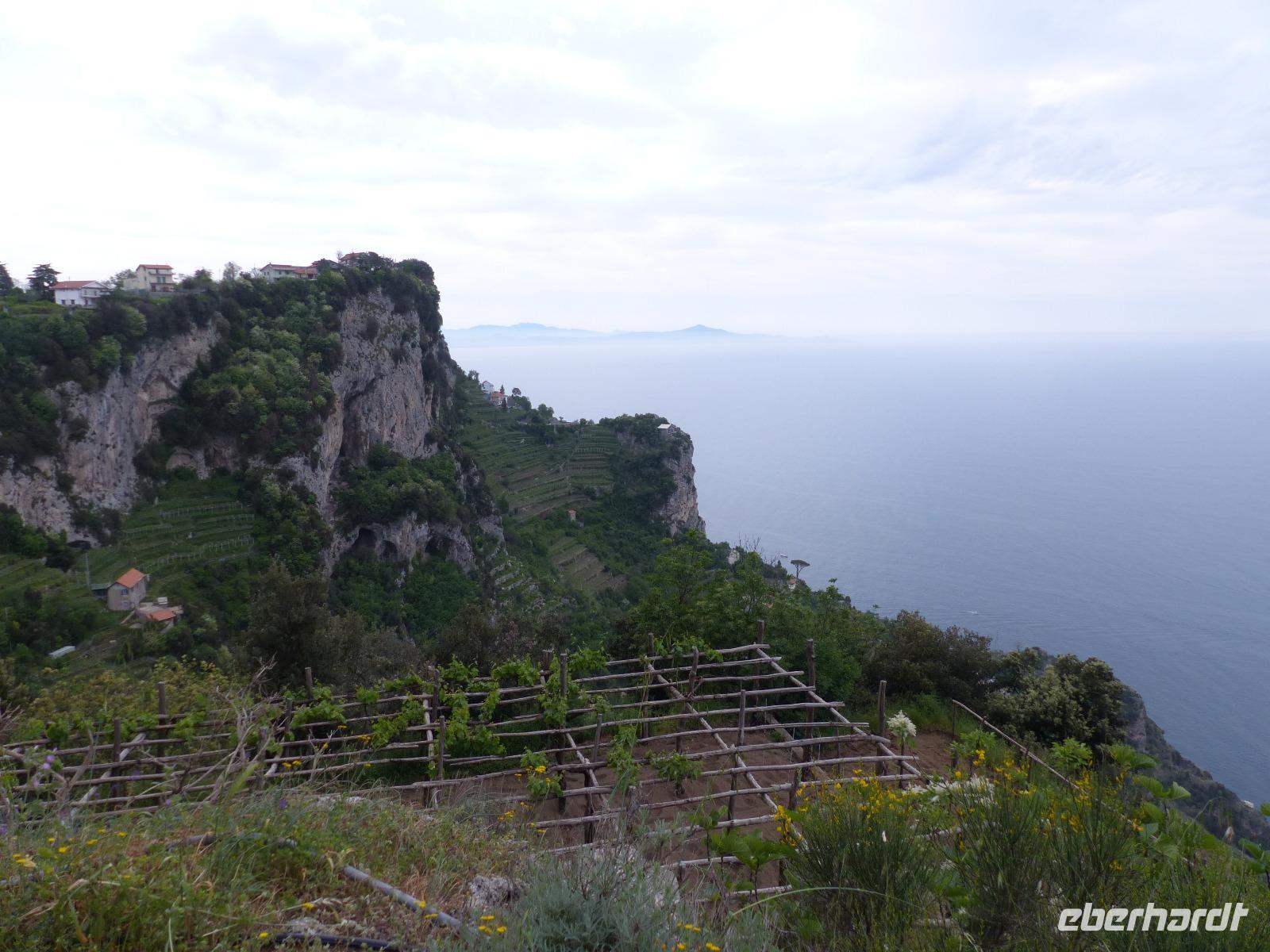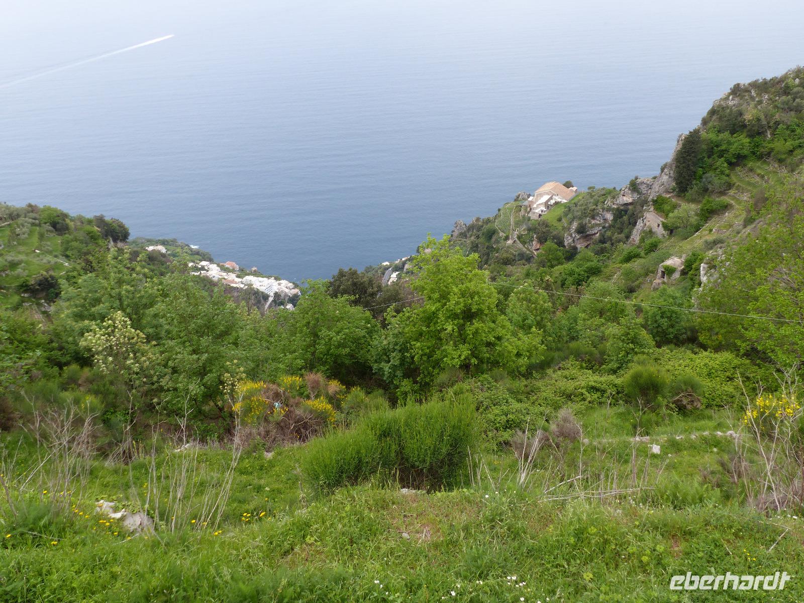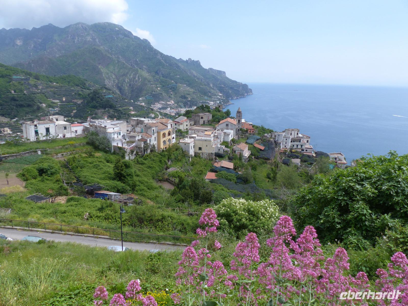 Die Götter empfingen uns mit mausgrauem Himmel. Aber es war warm und trocken. In Bomerano gönnten wir uns noch einen Kaffee. Dann ging's los. Der Weg war noch vor wenigen Wochen wegen eines Bergrutsches gesperrt gewesen. Nun ziehen wieder hunderte Menschen täglich in die Bergwelt zwischen Bomerano und Nocelle. Oberhalb der abgesperrten Stelle hat sich ein neuer Trampelpfad gebildet, über den man die abgerutschte Stelle umgehen kann. Viele Blumen blühten am Wegesrand, auf dem Meer flitzten Boote dahin und wir genossen die Aussicht. Eine kleine Pause machten wir an einer aussichtsreichen Stelle unter einer Felswand. Die große Pause folgte dann in Nocelle, einem kleinen Weiler, der hoch oben am Hang klebt. Und dort erwartete uns mal wieder Leckeres aus der Küche. Sehr gute Antipasti und wir hatten die ganze Terrasse für uns alleine. Ein paar Gäste genossen nun die Weiterreise per Bus, während die anderen sich mit mir zu Fuß auf den aussichtsreichen Pfad nach Positano begaben. Kläffende Vierbeiner empfingen uns in Montepertuso. Ein kleiner Ausrutscher blieb zum Glück ohne Folgen und so erreichten wir, nachdem wir Zaumgäste einer sehr stilvollen Hochzeitsfeier mit Konzert wurden (Mozarts Kleine Nachtmusik begleitete uns nun auf unserem Weg und geisterte durch unsere Köpfe), Positano und wir trafen uns alle wieder am Hafen von Positano. Den Rückweg traten wir übers Wasser an. Das Wetter hatte sich gebessert, die Sonne kam raus. Und die Strandbar an der Uferpromenade in Maiori freute sich nach unserer Rückkehr über eine ganze Gruppe Gäste, die den Blick aufs Meer mit leckeren Getränken genossen. Auch dieser Tag klang, wie immer, mit einem leckeren Essen in unserem Hotel aus.